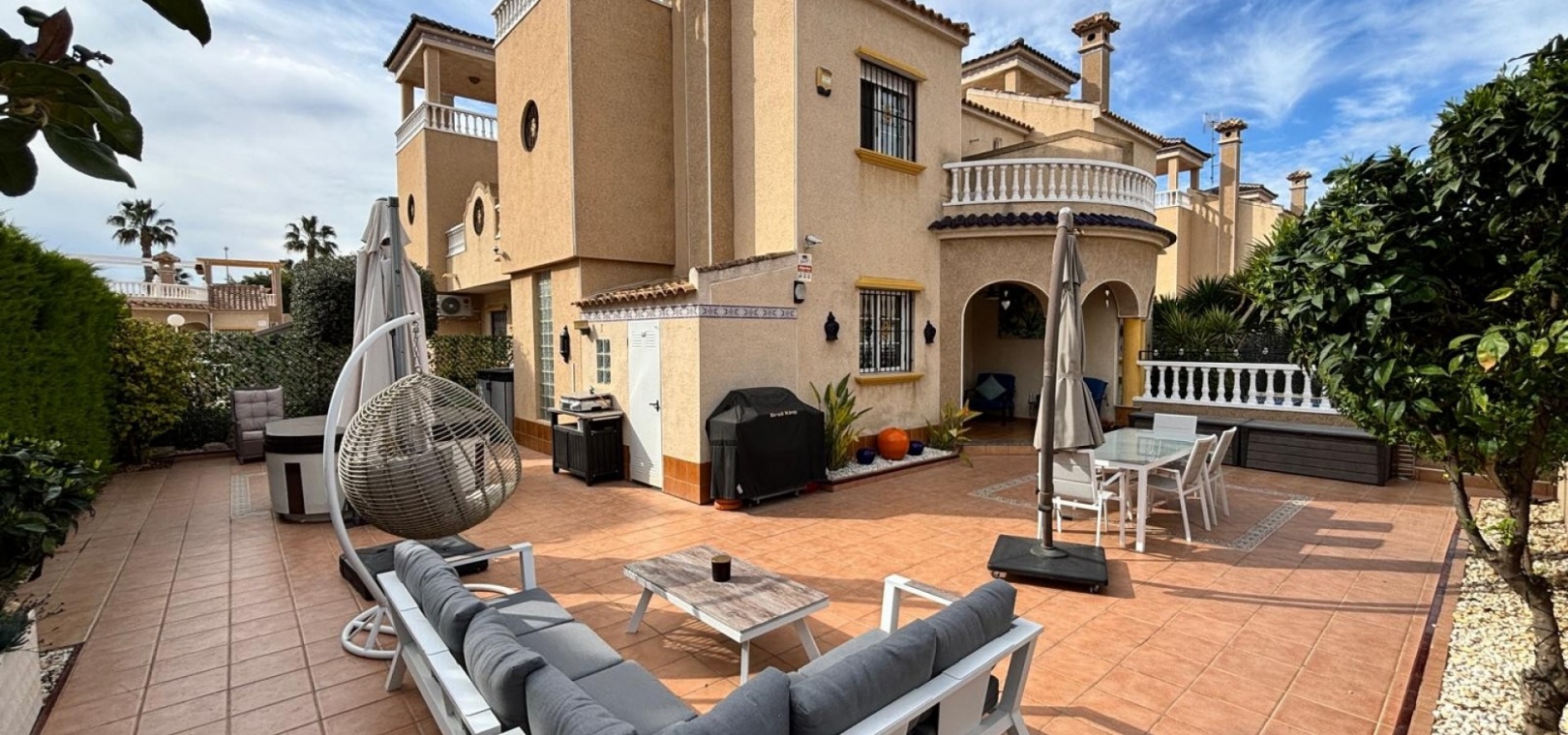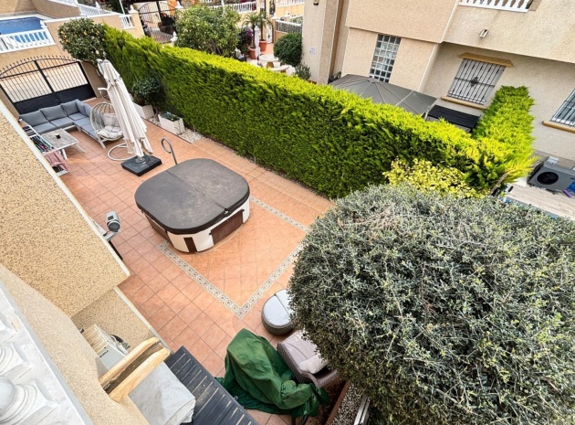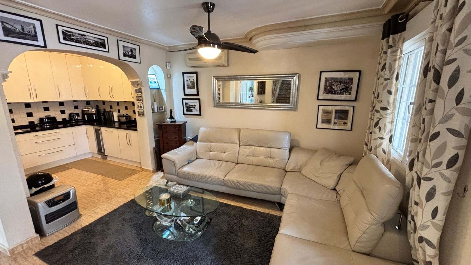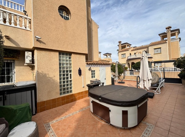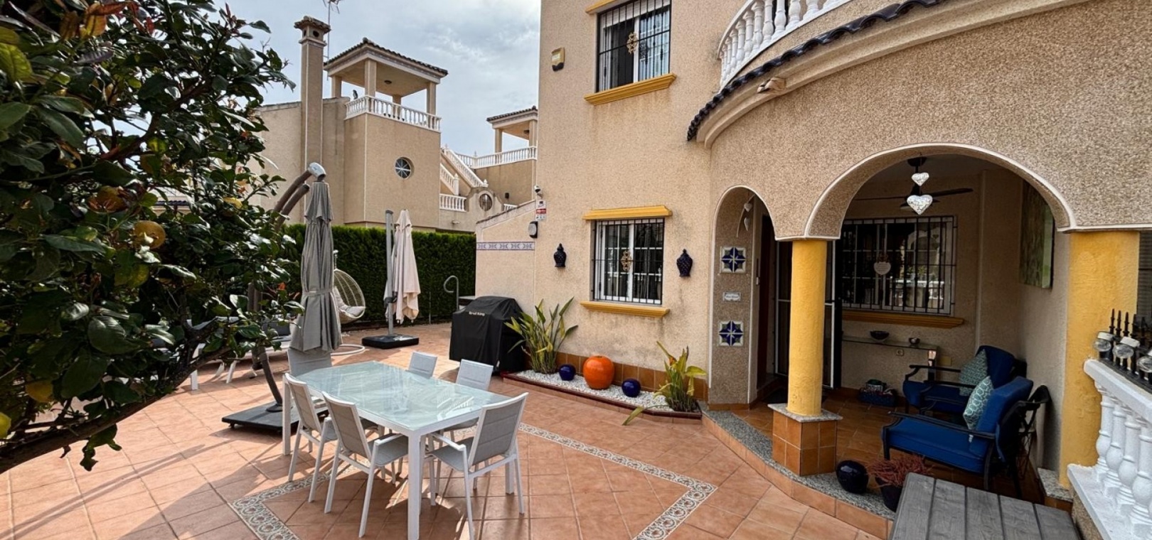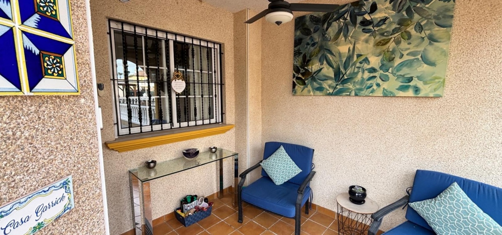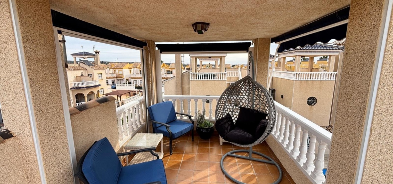 An exceptional quad townhouse. This is a very nicely presented 3 bedroom property set on a large plot of approx. 200m2 with a large tiled terrace for relaxing and sunbathing with various seating areas including a jacuzzi. You enter the house of approx. 100m2, onto a covered terrace leading into the open plan dining and lounge area bathed in natural sunlight with air conditioning and ceiling fans, with a spacious fully fitted modern kitchen. Also on the ground floor is a guest bedroom with fitted wardrobes currently being used as a dining area also with air conditioning and a ceiling fan, plus a large shower room with a utility area. An elegant staircase leads to 2 further double bedrooms each offering air conditioning, ceiling fans and fitted wardrobes, one also boasting a private terrace off, plus there is a large bathroom with walk-in shower. From the landing you will find access to a further staircase with storage facility, leading to the huge solarium, with a purpose built gazebo with sun awnings to three sides allowing for the area to be almost totally enclosed for the cooler evenings. This ´Zodiaco´ style townhouse is to be sold fully furnished to a high standard with many extras including aircon throughout, ceiling fans in all rooms, fitted wardrobes, white goods and storage space, private off road parking and ample street parking, plus access to the large communal pool and sunbathing terrace located just a stroll away.