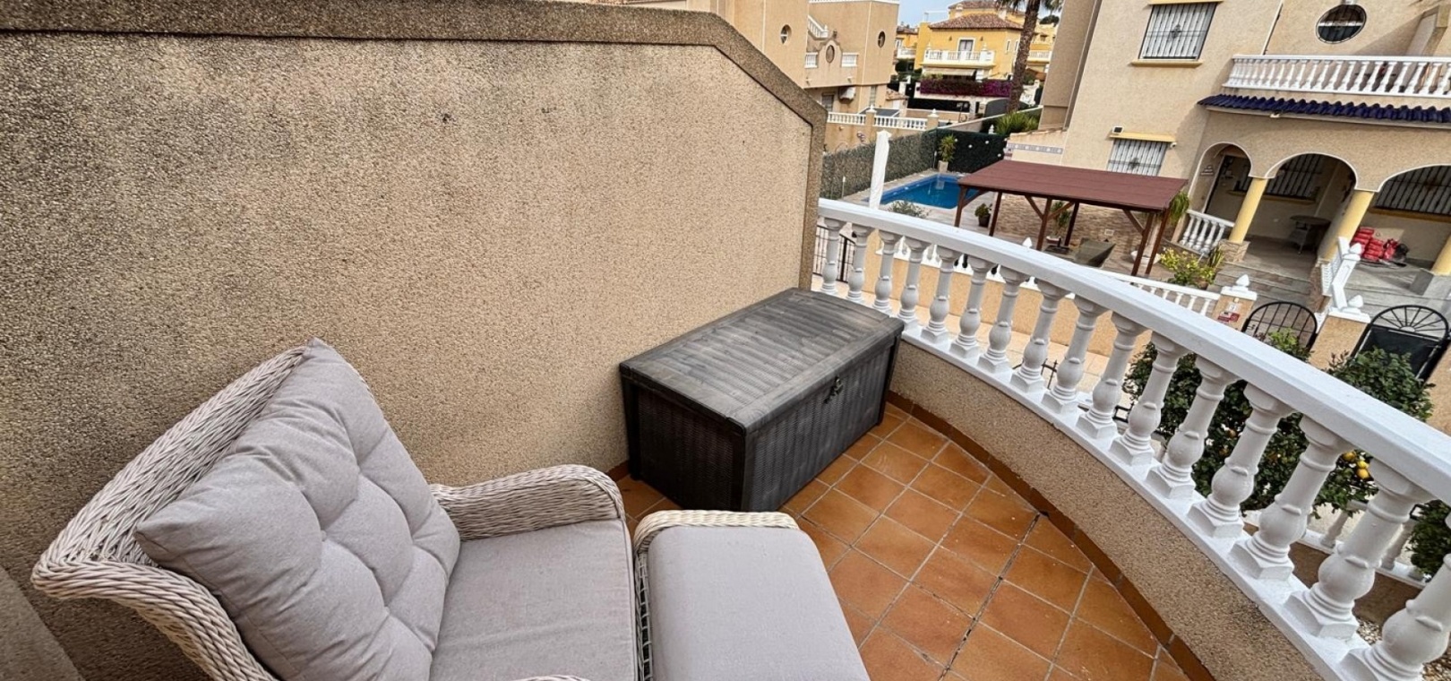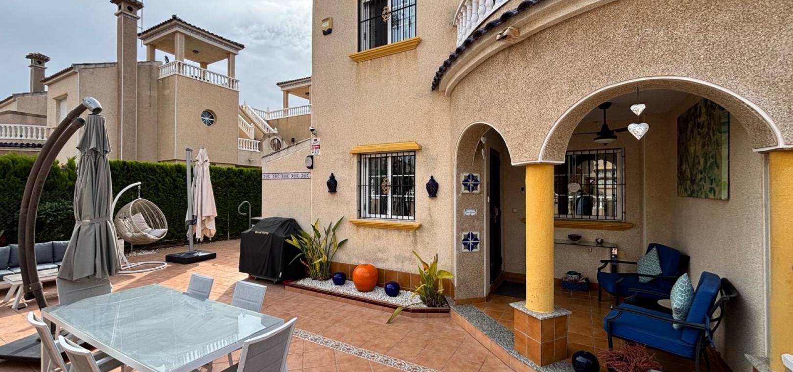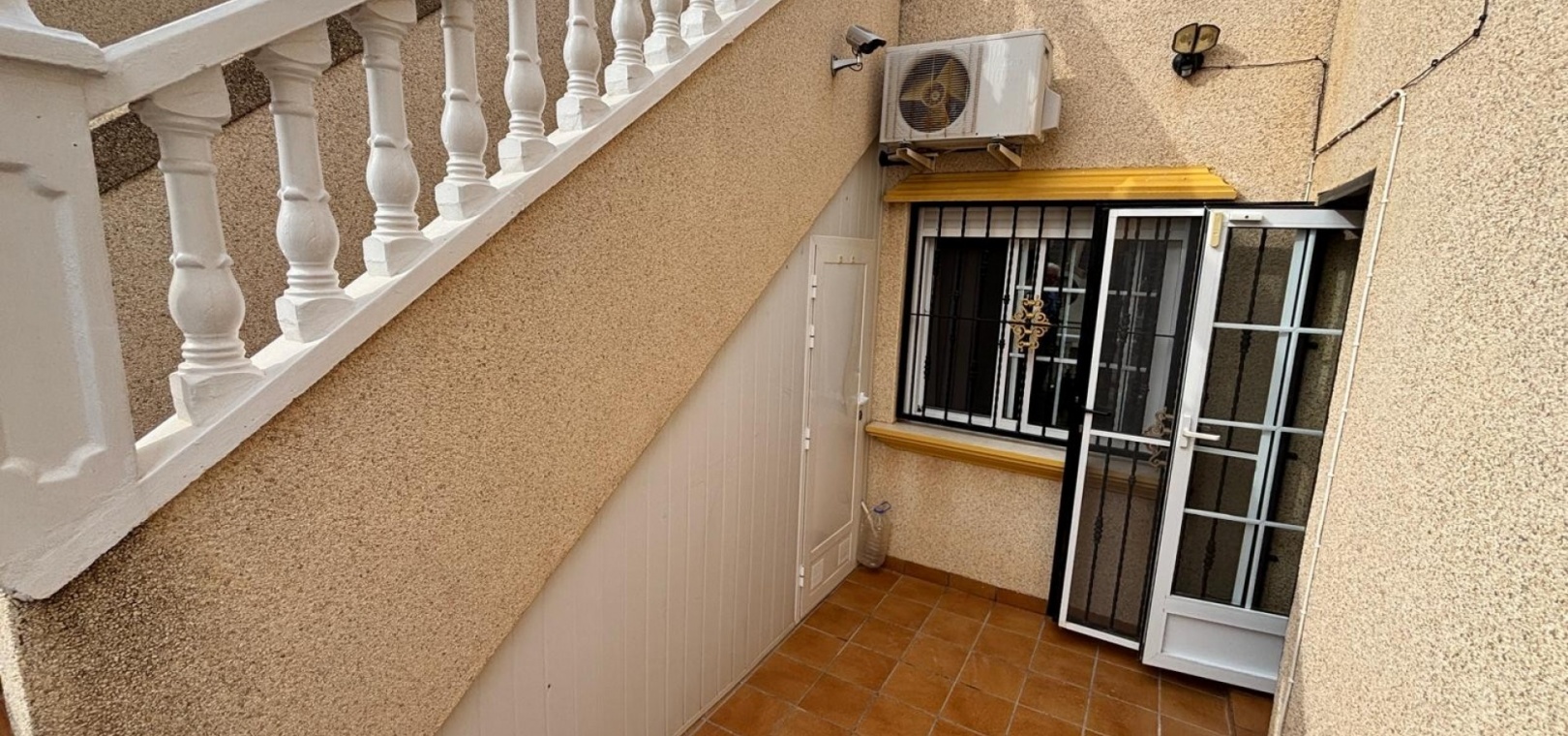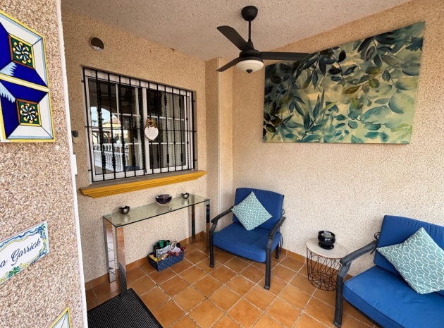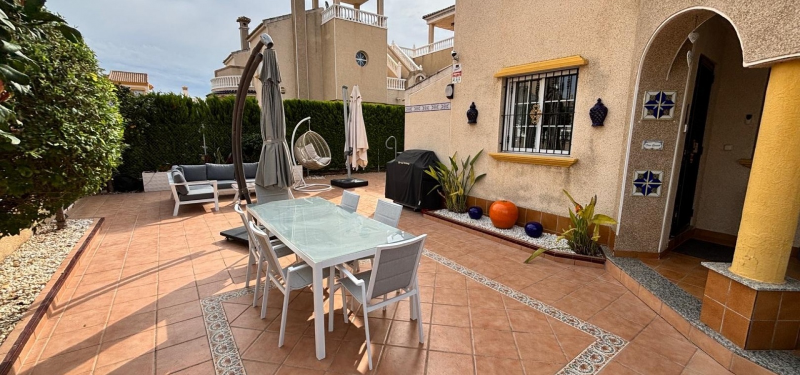 An exceptional quad townhouse. This is a very nicely presented 3 bedroom property set on a large plot of approx. 200m2 with a large tiled terrace for relaxing and sunbathing with various seating areas including a jacuzzi. You enter the house of approx. 100m2, onto a covered terrace leading into the open plan dining and lounge area bathed in natural sunlight with air conditioning and ceiling fans, with a spacious fully fitted modern kitchen. Also on the ground floor is a guest bedroom with fitted wardrobes currently being used as a dining area also with air conditioning and a ceiling fan, plus a large shower room with a utility area. An elegant staircase leads to 2 further double bedrooms each offering air conditioning, ceiling fans and fitted wardrobes, one also boasting a private terrace off, plus there is a large bathroom with walk-in shower. From the landing you will find access to a further staircase with storage facility, leading to the huge solarium, with a purpose built gazebo with sun awnings to three sides allowing for the area to be almost totally enclosed for the cooler evenings. This ´Zodiaco´ style townhouse is to be sold fully furnished to a high standard with many extras including aircon throughout, ceiling fans in all rooms, fitted wardrobes, white goods and storage space, private off road parking and ample street parking, plus access to the large communal pool and sunbathing terrace located just a stroll away.