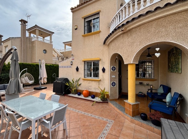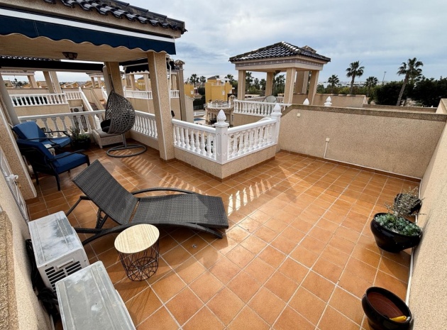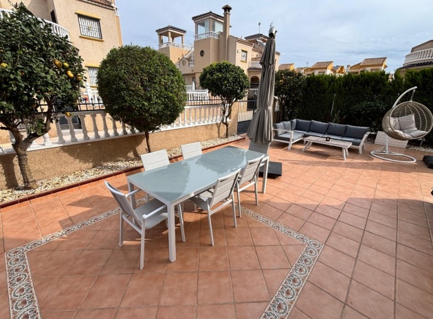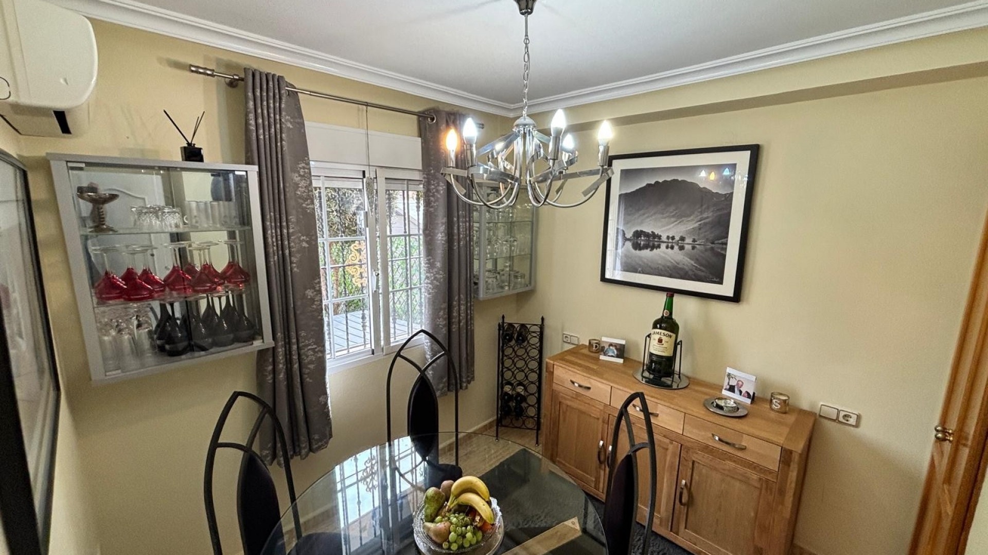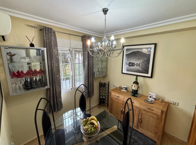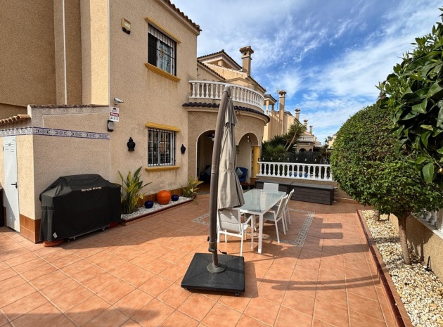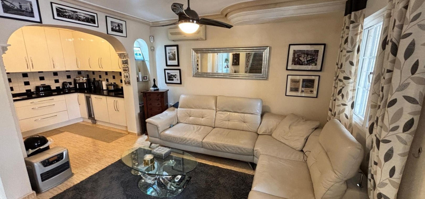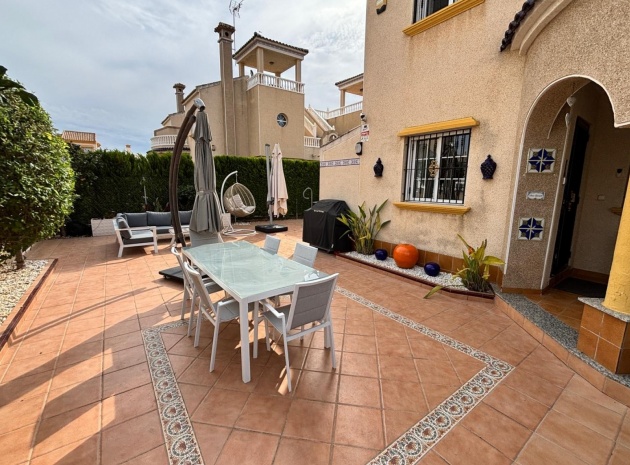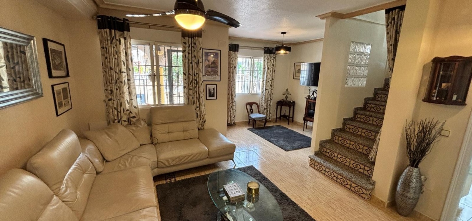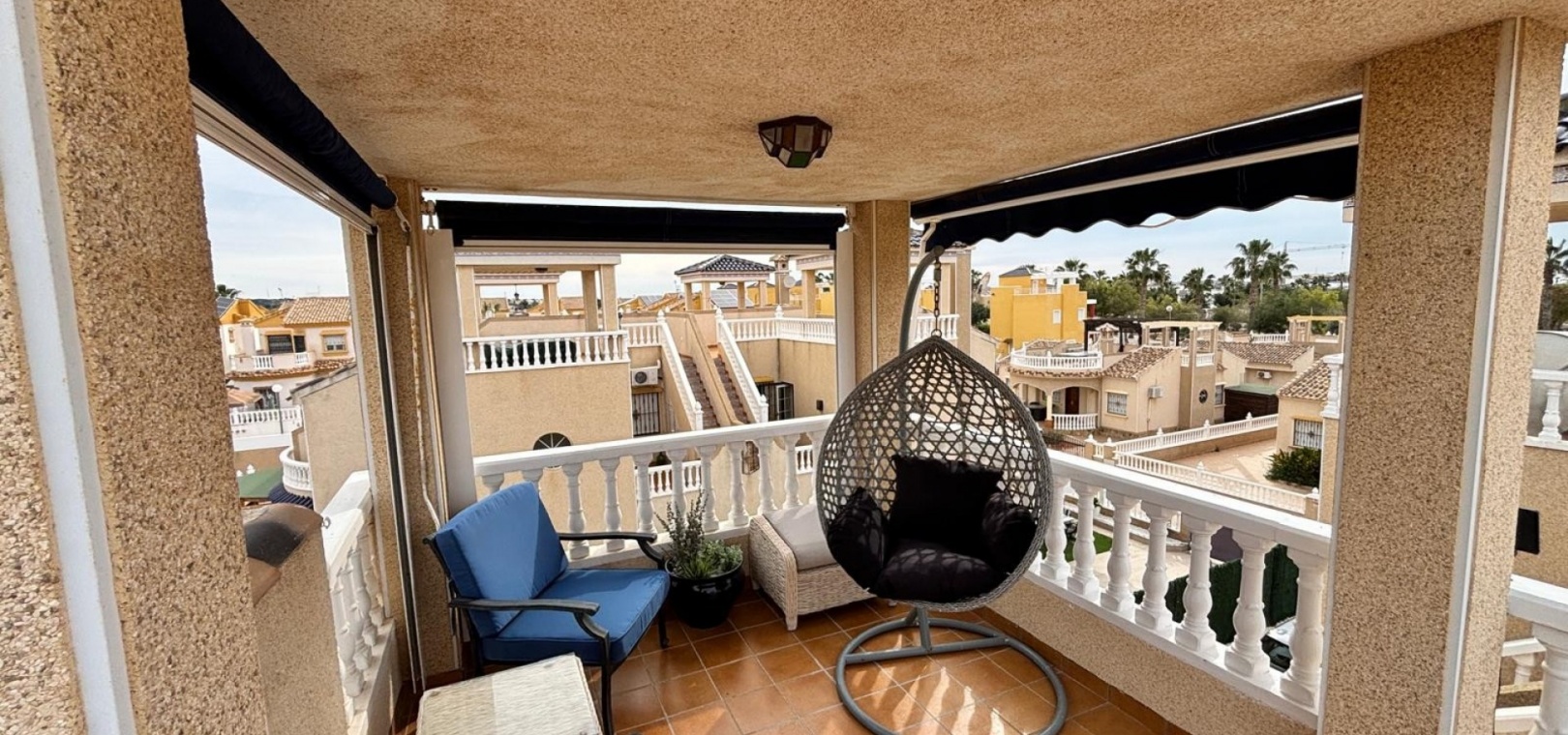 An exceptional quad townhouse. This is a very nicely presented 3 bedroom property set on a large plot of approx. 200m2 with a large tiled terrace for relaxing and sunbathing with various seating areas including a jacuzzi. You enter the house of approx. 100m2, onto a covered terrace leading into the open plan dining and lounge area bathed in natural sunlight with air conditioning and ceiling fans, with a spacious fully fitted modern kitchen. Also on the ground floor is a guest bedroom with fitted wardrobes currently being used as a dining area also with air conditioning and a ceiling fan, plus a large shower room with a utility area. An elegant staircase leads to 2 further double bedrooms each offering air conditioning, ceiling fans and fitted wardrobes, one also boasting a private terrace off, plus there is a large bathroom with walk-in shower. From the landing you will find access to a further staircase with storage facility, leading to the huge solarium, with a purpose built gazebo with sun awnings to three sides allowing for the area to be almost totally enclosed for the cooler evenings. This ´Zodiaco´ style townhouse is to be sold fully furnished to a high standard with many extras including aircon throughout, ceiling fans in all rooms, fitted wardrobes, white goods and storage space, private off road parking and ample street parking, plus access to the large communal pool and sunbathing terrace located just a stroll away.