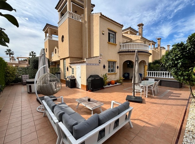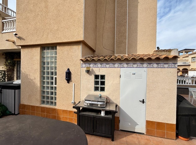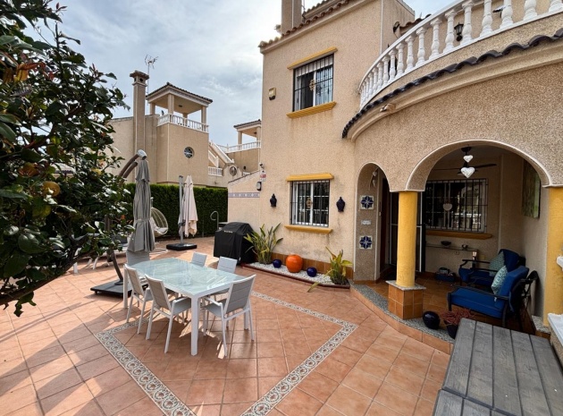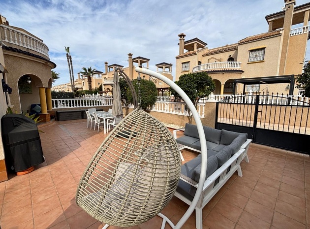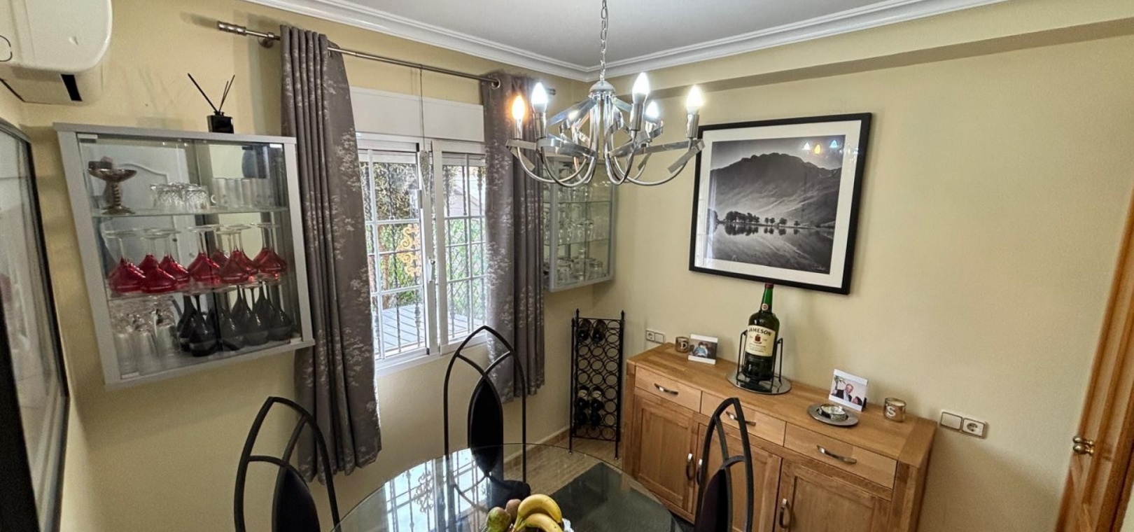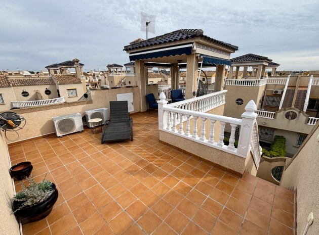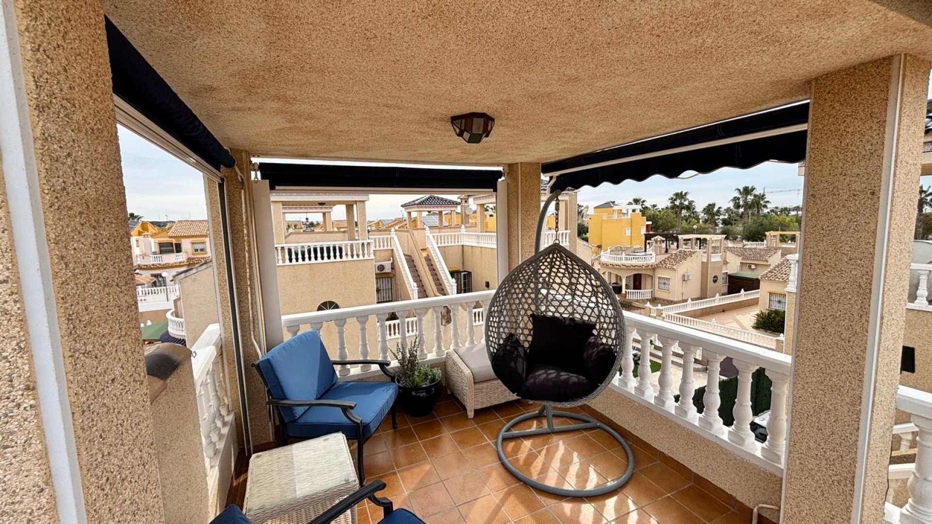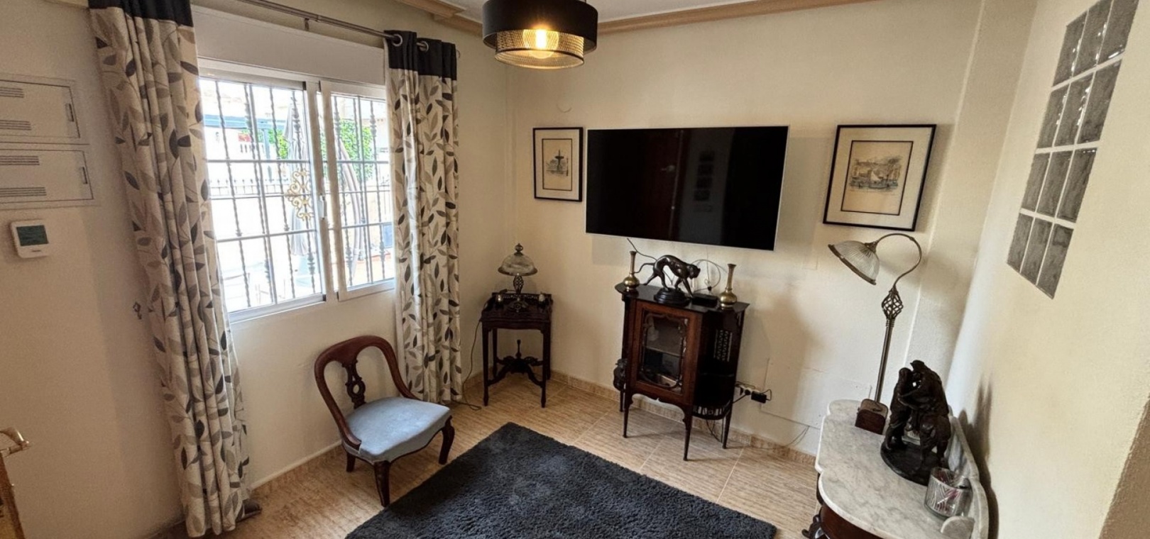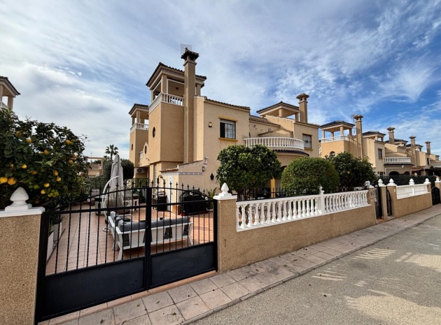 An exceptional quad townhouse. This is a very nicely presented 3 bedroom property set on a large plot of approx. 200m2 with a large tiled terrace for relaxing and sunbathing with various seating areas including a jacuzzi. You enter the house of approx. 100m2, onto a covered terrace leading into the open plan dining and lounge area bathed in natural sunlight with air conditioning and ceiling fans, with a spacious fully fitted modern kitchen. Also on the ground floor is a guest bedroom with fitted wardrobes currently being used as a dining area also with air conditioning and a ceiling fan, plus a large shower room with a utility area. An elegant staircase leads to 2 further double bedrooms each offering air conditioning, ceiling fans and fitted wardrobes, one also boasting a private terrace off, plus there is a large bathroom with walk-in shower. From the landing you will find access to a further staircase with storage facility, leading to the huge solarium, with a purpose built gazebo with sun awnings to three sides allowing for the area to be almost totally enclosed for the cooler evenings. This ´Zodiaco´ style townhouse is to be sold fully furnished to a high standard with many extras including aircon throughout, ceiling fans in all rooms, fitted wardrobes, white goods and storage space, private off road parking and ample street parking, plus access to the large communal pool and sunbathing terrace located just a stroll away.
