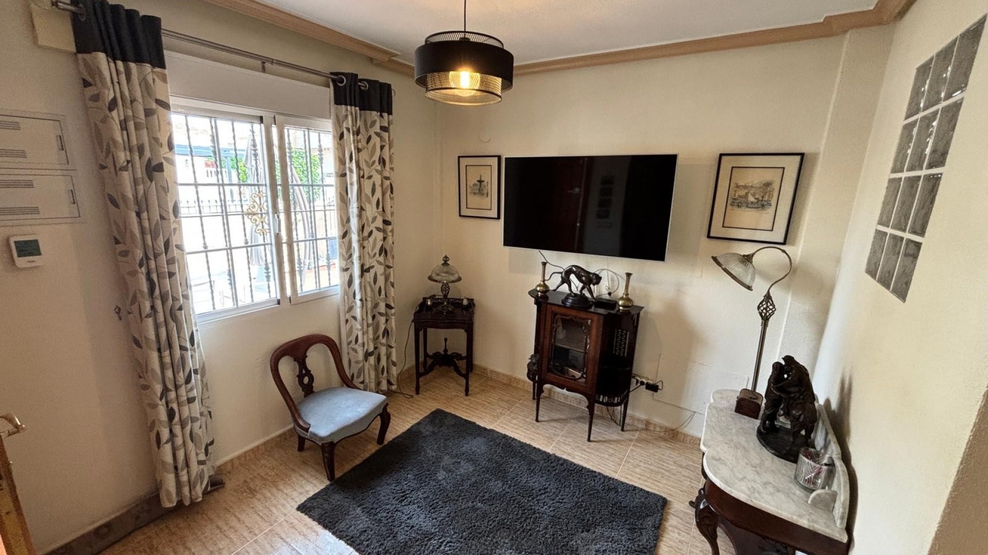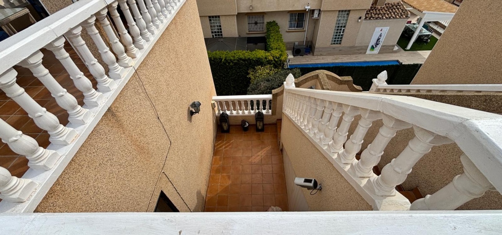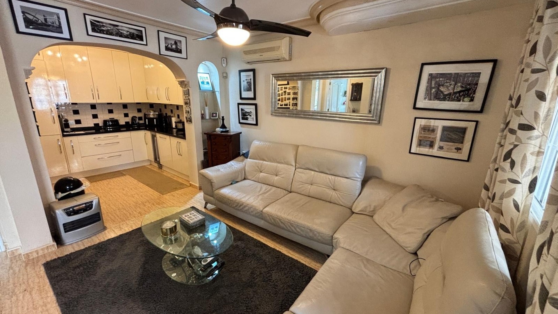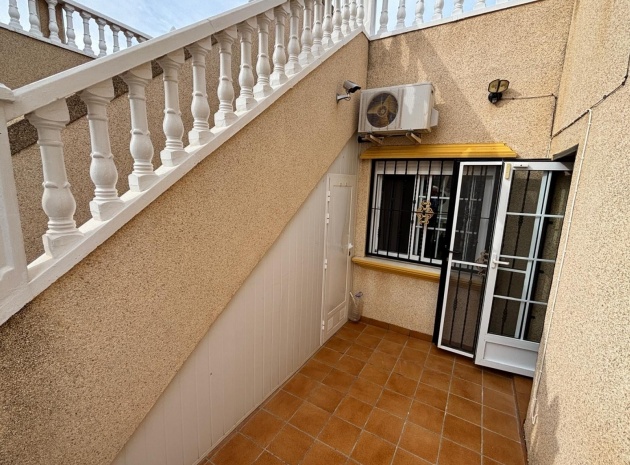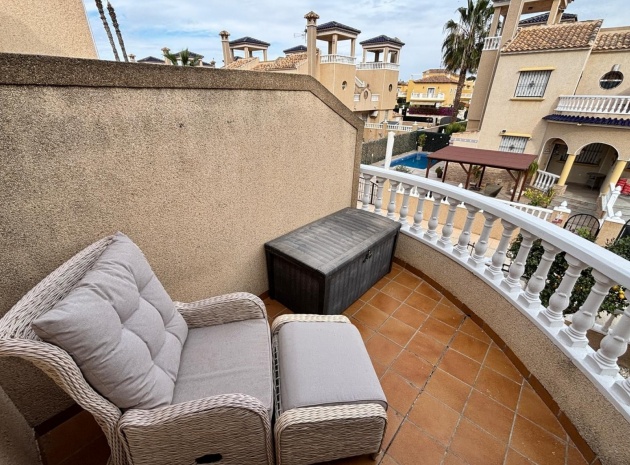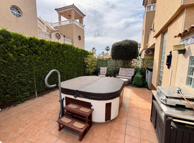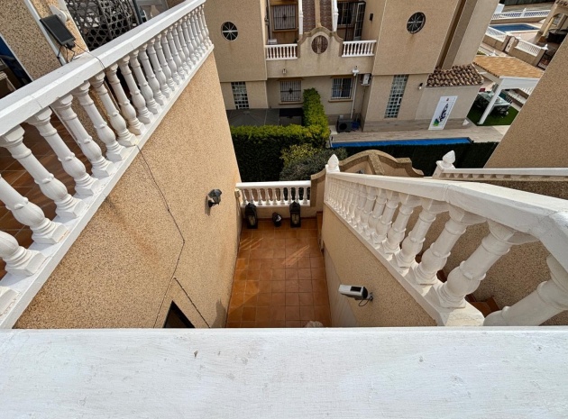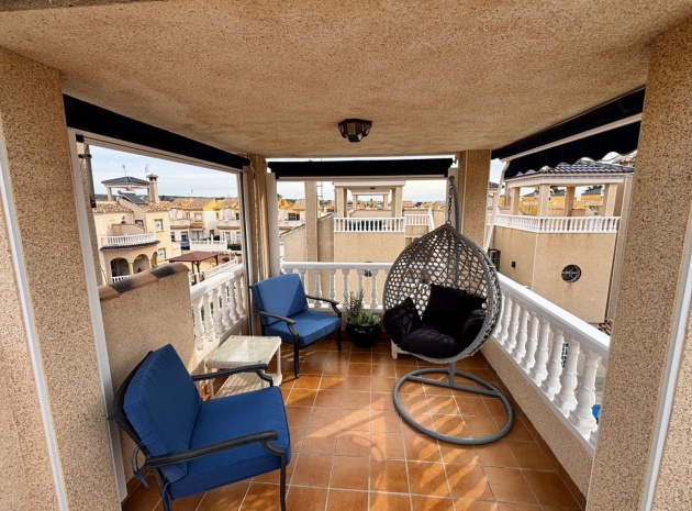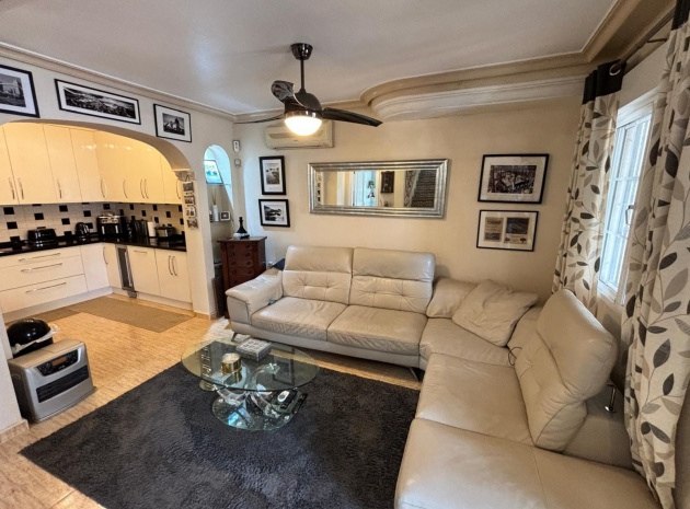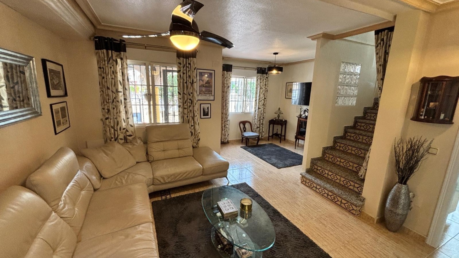 An exceptional quad townhouse. This is a very nicely presented 3 bedroom property set on a large plot of approx. 200m2 with a large tiled terrace for relaxing and sunbathing with various seating areas including a jacuzzi. You enter the house of approx. 100m2, onto a covered terrace leading into the open plan dining and lounge area bathed in natural sunlight with air conditioning and ceiling fans, with a spacious fully fitted modern kitchen. Also on the ground floor is a guest bedroom with fitted wardrobes currently being used as a dining area also with air conditioning and a ceiling fan, plus a large shower room with a utility area. An elegant staircase leads to 2 further double bedrooms each offering air conditioning, ceiling fans and fitted wardrobes, one also boasting a private terrace off, plus there is a large bathroom with walk-in shower. From the landing you will find access to a further staircase with storage facility, leading to the huge solarium, with a purpose built gazebo with sun awnings to three sides allowing for the area to be almost totally enclosed for the cooler evenings. This ´Zodiaco´ style townhouse is to be sold fully furnished to a high standard with many extras including aircon throughout, ceiling fans in all rooms, fitted wardrobes, white goods and storage space, private off road parking and ample street parking, plus access to the large communal pool and sunbathing terrace located just a stroll away.