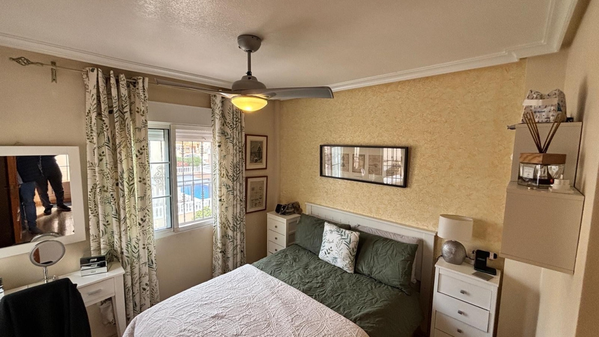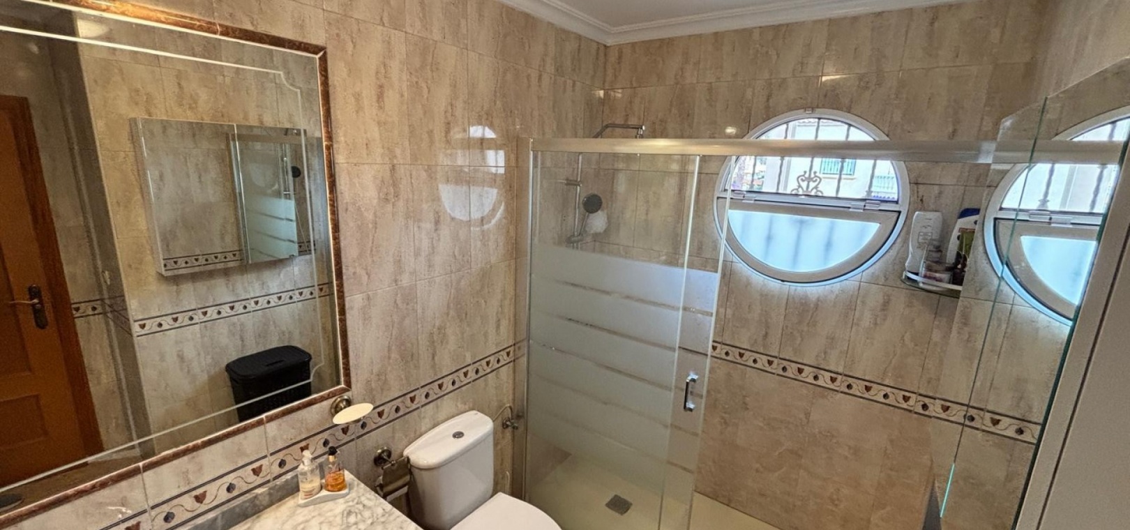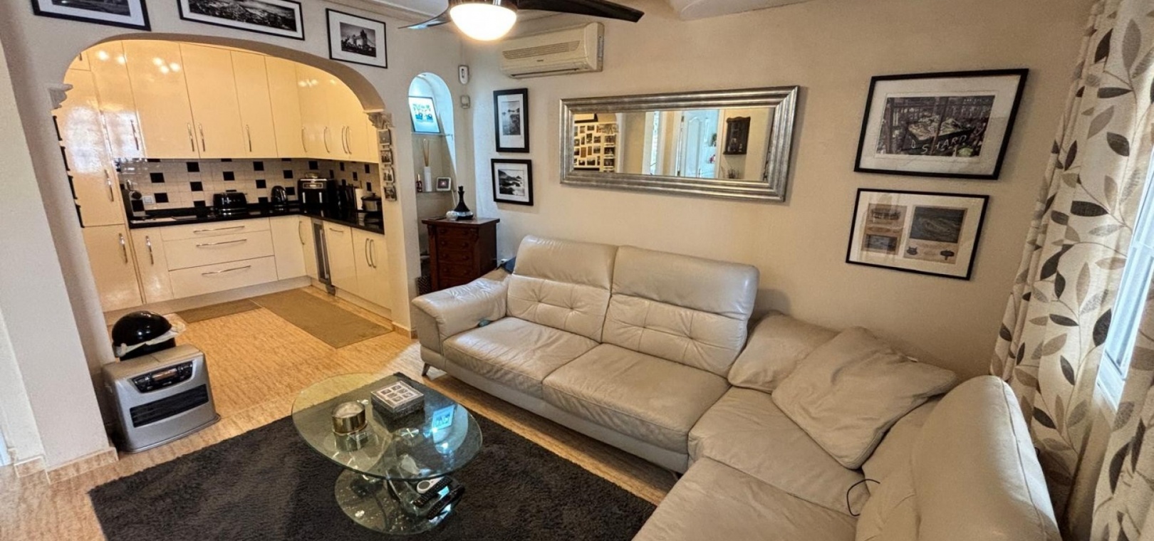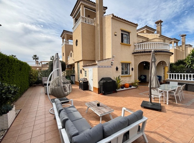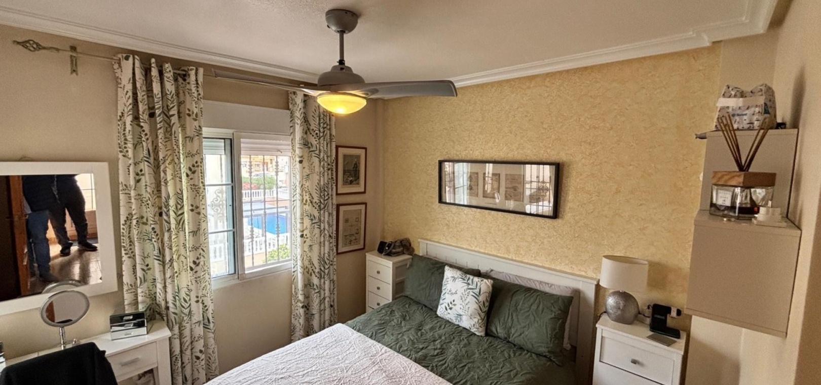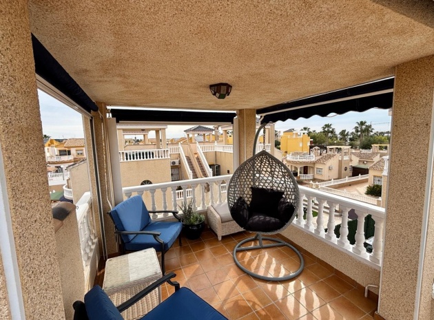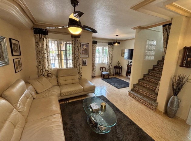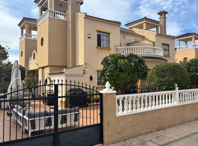 An exceptional quad townhouse. This is a very nicely presented 3 bedroom property set on a large plot of approx. 200m2 with a large tiled terrace for relaxing and sunbathing with various seating areas including a jacuzzi. You enter the house of approx. 100m2, onto a covered terrace leading into the open plan dining and lounge area bathed in natural sunlight with air conditioning and ceiling fans, with a spacious fully fitted modern kitchen. Also on the ground floor is a guest bedroom with fitted wardrobes currently being used as a dining area also with air conditioning and a ceiling fan, plus a large shower room with a utility area. An elegant staircase leads to 2 further double bedrooms each offering air conditioning, ceiling fans and fitted wardrobes, one also boasting a private terrace off, plus there is a large bathroom with walk-in shower. From the landing you will find access to a further staircase with storage facility, leading to the huge solarium, with a purpose built gazebo with sun awnings to three sides allowing for the area to be almost totally enclosed for the cooler evenings. This ´Zodiaco´ style townhouse is to be sold fully furnished to a high standard with many extras including aircon throughout, ceiling fans in all rooms, fitted wardrobes, white goods and storage space, private off road parking and ample street parking, plus access to the large communal pool and sunbathing terrace located just a stroll away.