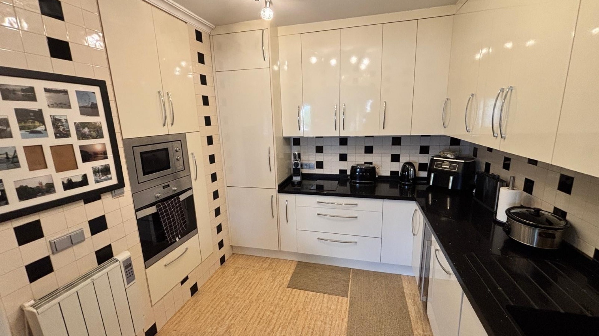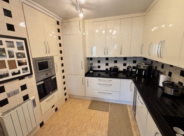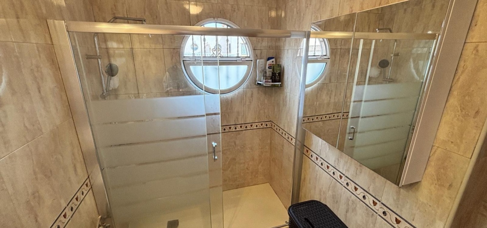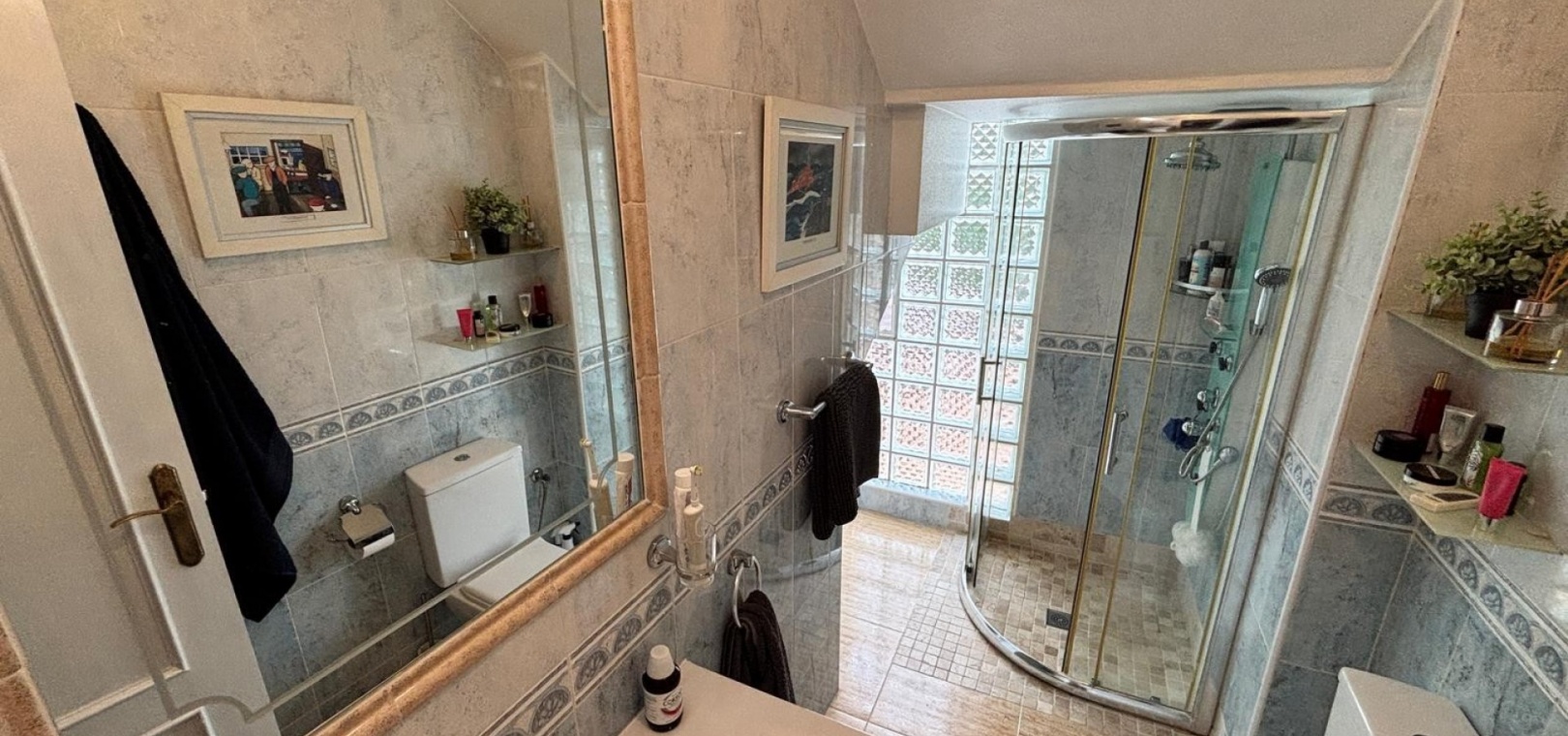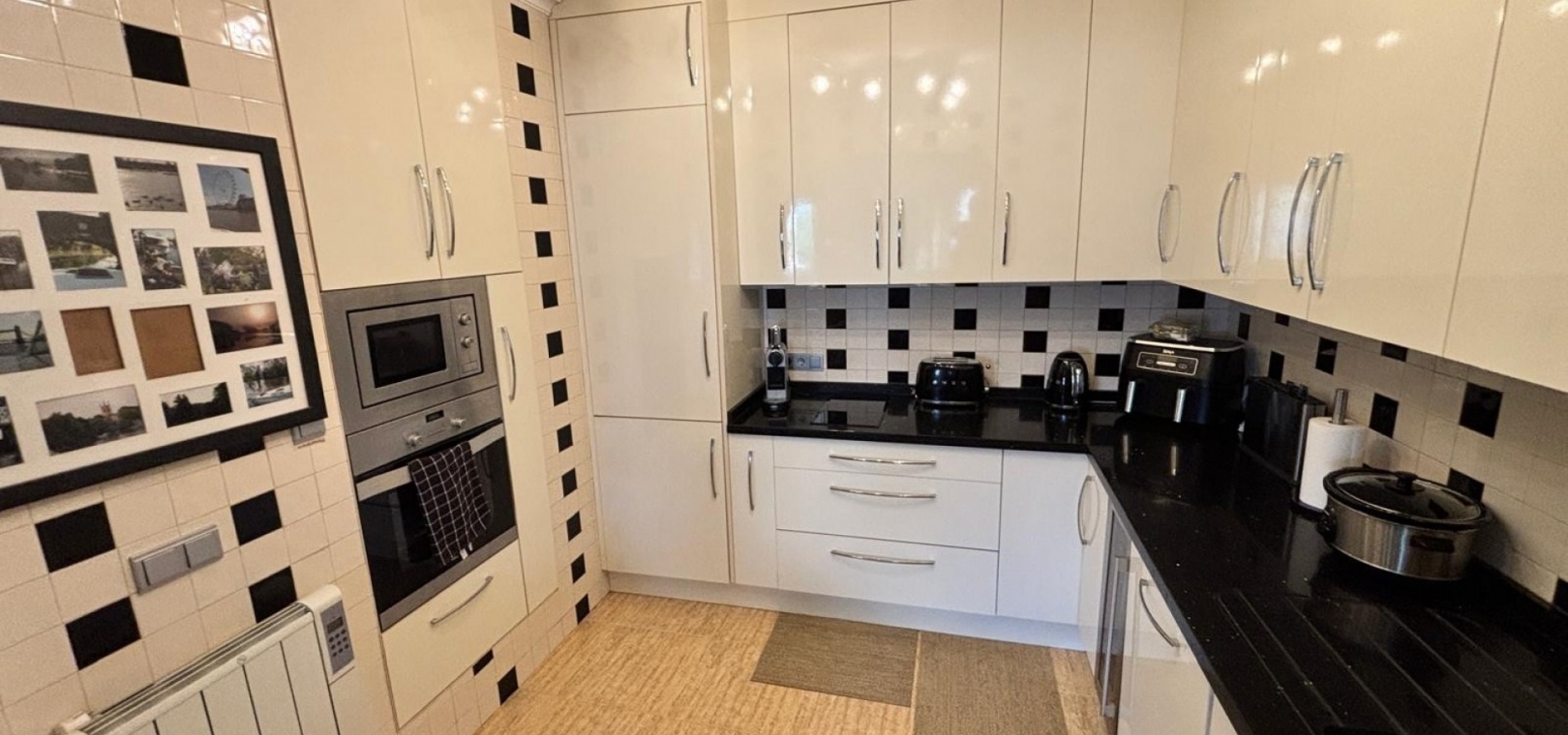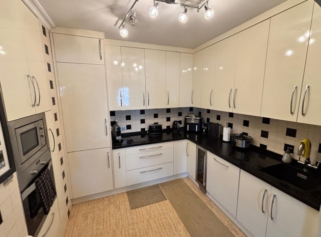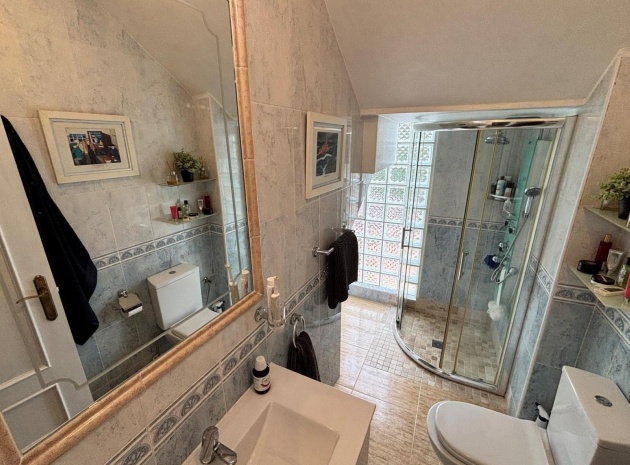 An exceptional quad townhouse. This is a very nicely presented 3 bedroom property set on a large plot of approx. 200m2 with a large tiled terrace for relaxing and sunbathing with various seating areas including a jacuzzi. You enter the house of approx. 100m2, onto a covered terrace leading into the open plan dining and lounge area bathed in natural sunlight with air conditioning and ceiling fans, with a spacious fully fitted modern kitchen. Also on the ground floor is a guest bedroom with fitted wardrobes currently being used as a dining area also with air conditioning and a ceiling fan, plus a large shower room with a utility area. An elegant staircase leads to 2 further double bedrooms each offering air conditioning, ceiling fans and fitted wardrobes, one also boasting a private terrace off, plus there is a large bathroom with walk-in shower. From the landing you will find access to a further staircase with storage facility, leading to the huge solarium, with a purpose built gazebo with sun awnings to three sides allowing for the area to be almost totally enclosed for the cooler evenings. This ´Zodiaco´ style townhouse is to be sold fully furnished to a high standard with many extras including aircon throughout, ceiling fans in all rooms, fitted wardrobes, white goods and storage space, private off road parking and ample street parking, plus access to the large communal pool and sunbathing terrace located just a stroll away.