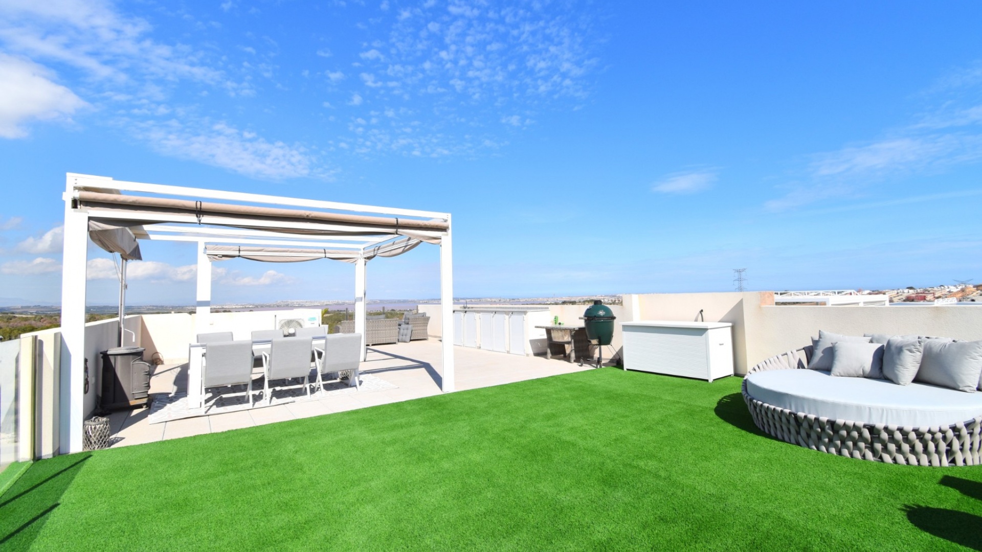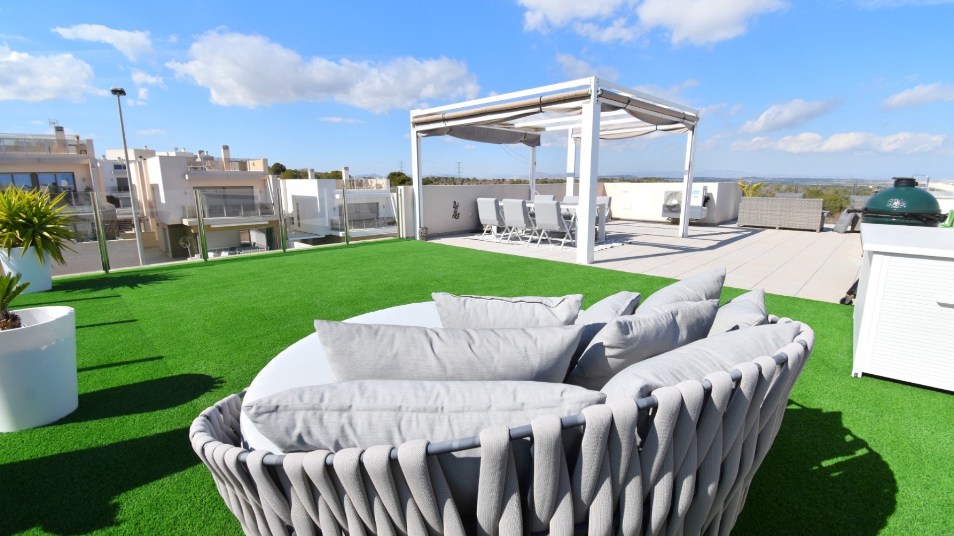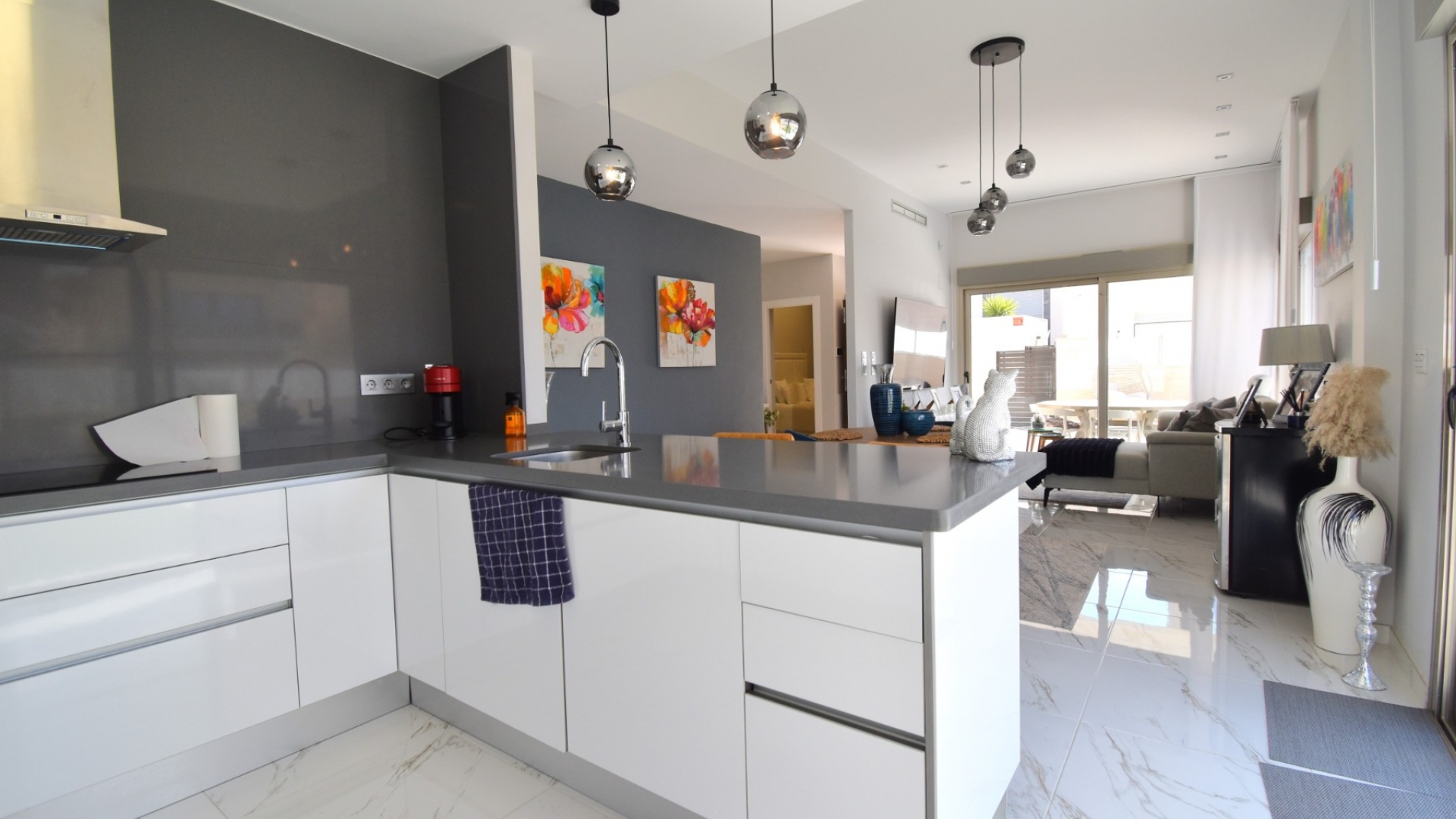 This As New South Facing, Three Bedroom Detached Villa in Villamartin is located in a desirable area of Orihuela Costa, offering modern living within close proximity to essential amenities and facilities. Built in 2021 on a generous 368m² corner plot, this stunning villa boasts 3 spacious bedrooms, 2 stylish shower rooms, and air conditioning throughout. The open-plan, fully fitted kitchen includes a separate utility room for added convenience. The property features a covered patio area off the villa, as well as a beautifully designed patio surrounding the private pool, perfect for outdoor relaxation. The expansive solarium offers breathtaking views of the salt lakes and countryside, complete with a gazebo and an outdoor kitchen for ultimate entertainment. Additional features include fitted wardrobes, a well-maintained garden, a carport, and gated community parking with undercover spaces. An alarm system provides added security. Ideally situated just an 8-minute drive to the beach and only 2 minutes from Aldi, a main brand supermarket, this villa is an exceptional opportunity for luxury living in the sought-after area of Costa Blanca South.