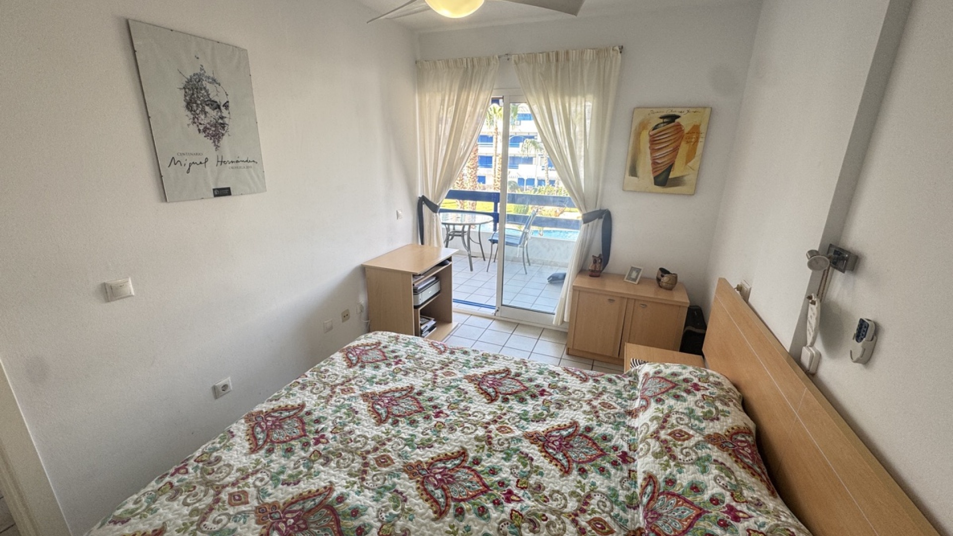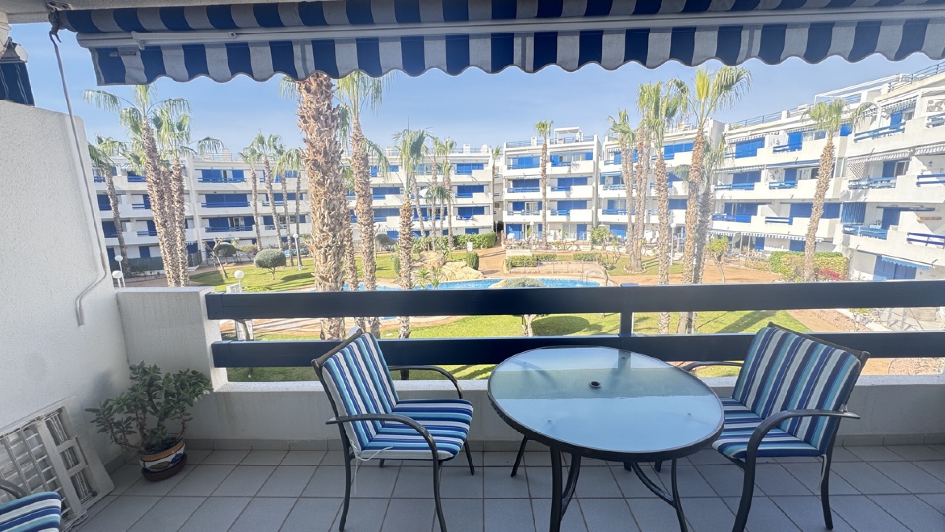 A 2 bed 2 bath 2nd floor apartment with views to the communal swimming pool situated in the secure gated La Calma development in Playa Flamenca, Costa Blanca South.