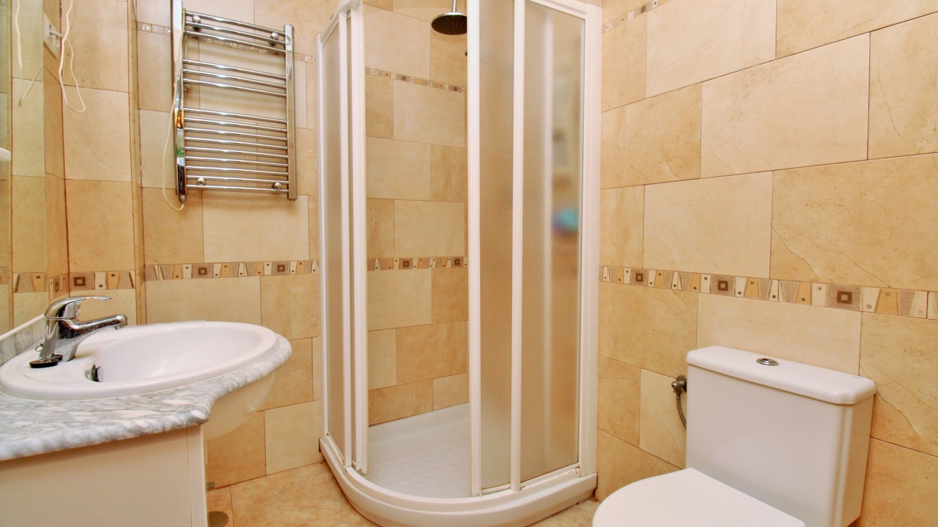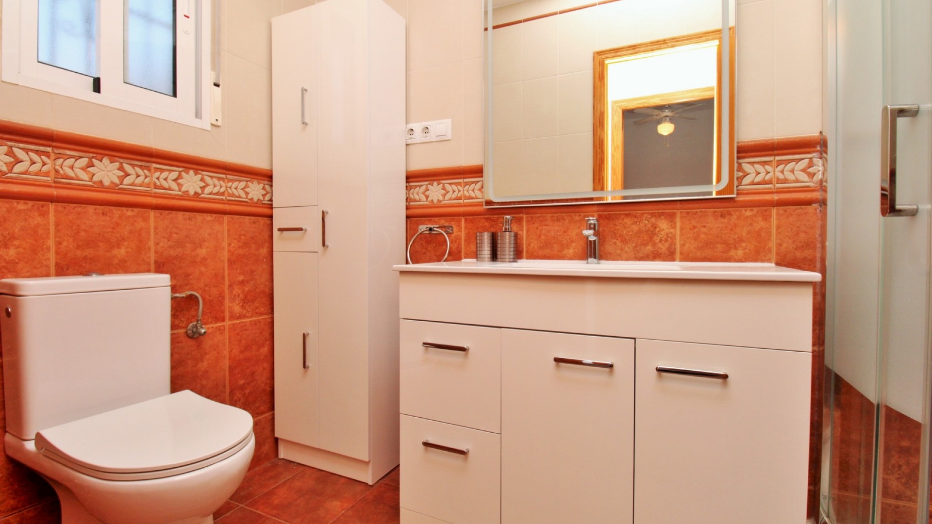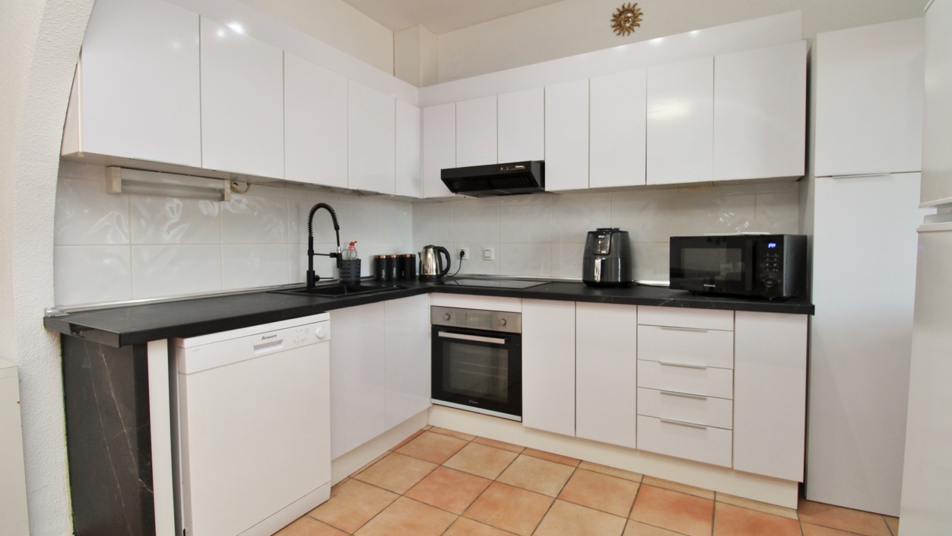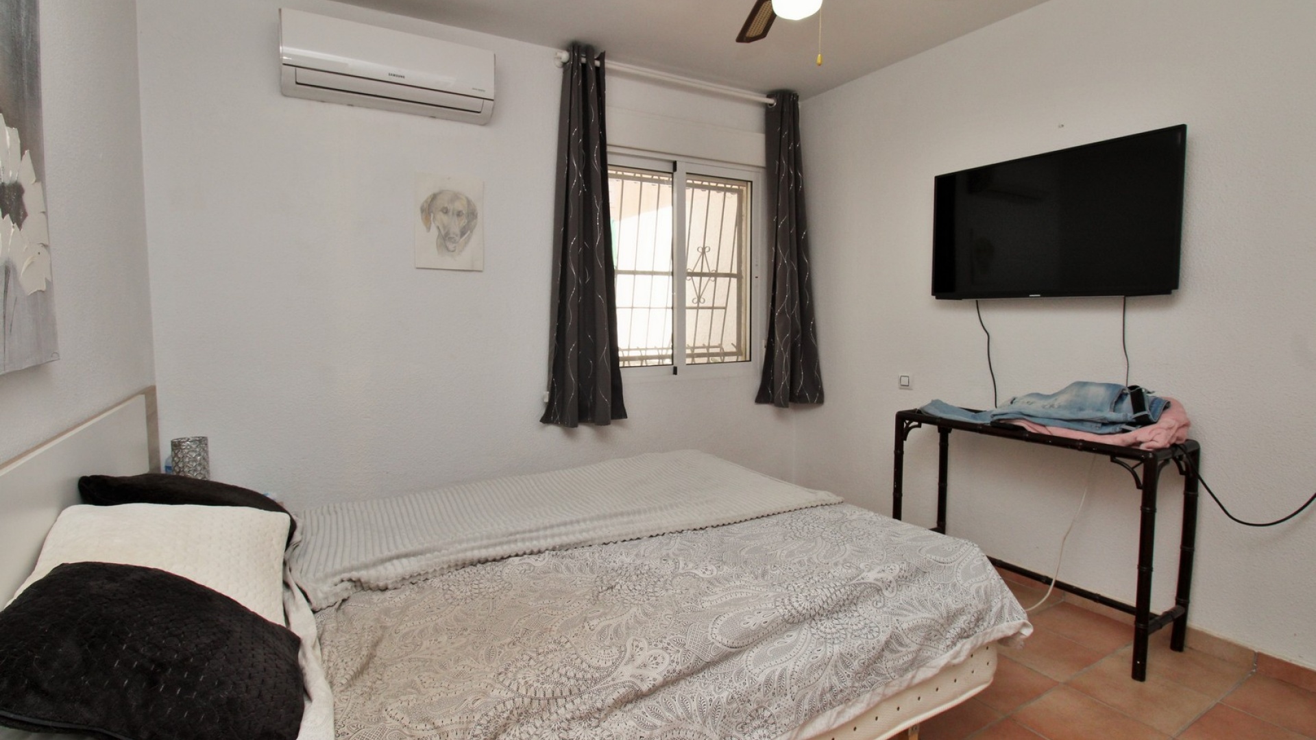 4 bedroom townhouse for sale in Blue Lagoon, Villamartin, this deceptively spacious mid-terrace home offers a well-designed layout with excellent outdoor space and far-reaching views.The property opens into an enclosed terrace, ideal as a sunroom, leading to a bright lounge and dining area with a modern open-plan kitchen. The ground floor also features a shower room, a double bedroom with fitted wardrobes, and a single bedroom with access to a rear patio. From here, a staircase leads up to the separate annex, where you'll find another shower room and two additional bedrooms. The generously sized master bedroom includes fitted wardrobes and patio doors opening onto an east-facing terrace with distant sea views. A spiral staircase from the rear terrace leads to a large rooftop solarium, offering panoramic views of the mountains, salt lakes, and the Mediterranean in the distance. The property is equipped with air conditioning and is being sold furnished.Conveniently located within walking distance of local amenities, including a public swimming pool (Marimba Blue Pool Bar) and Greenland Mini Golf, the home is also just a short 10-minute drive from the blue-flag beaches of the Orihuela Costa.