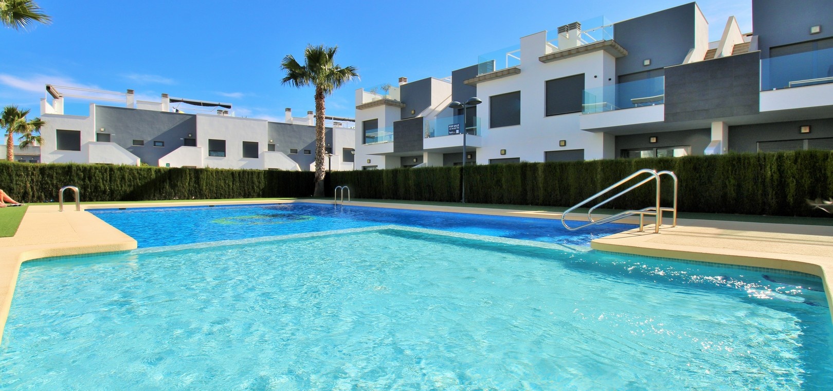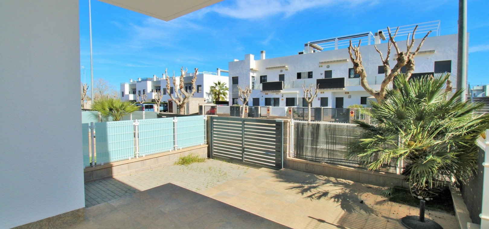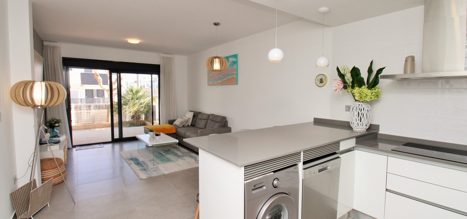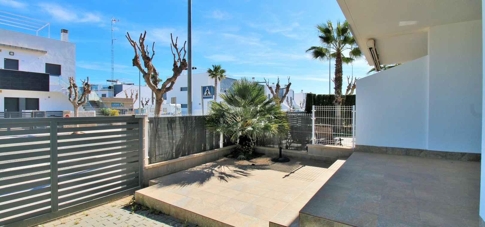 Beautifully presented modern two-bedroom, two-bathroom ground-floor apartment situated in a the highly sought-after gated community of Lamar Resort II in Pilar de la Horadada. Just a few metres from the property, you’ll find two stunning communal pool areas, offering the perfect spot to unwind and soak up the sun. The apartment benefits from two private terraces—one east-facing and one west-facing—so you can enjoy the sunshine throughout the day or find shade when needed. Whether you’re sunbathing, dining al fresco, or simply relaxing with a drink and watching the world go by, these outdoor spaces provide a wonderful extension of your living area.Inside, the spacious and stylish living area is bright and inviting, with large glass doors leading onto the main terrace. The open-plan kitchen is fully fitted with modern appliances, combining practicality with sleek design. Off the living room, you’ll find two well-proportioned bedrooms, both with fitted wardrobes. The master bedroom features an en-suite bathroom with walk-in shower, while a separate bathroom serves the rest of the apartment.Set within a secure, well-maintained complex, the property also includes a large private storage room, perfect for keeping bikes, suitcases, or other belongings. Sold fully furnished with ducted air-conditioning throughout, this is a true turnkey solution—ideal for anyone looking for a stylish, ready-to-move-into modern home.The town centre of Pilar de la Horadada is just a 10-15 minute walk away, offering a fantastic selection of restaurants, bars, shops, and amenities. A large supermarket is also conveniently close by. For beach lovers, the Mediterranean coastline is within easy reach—just a short drive or a 20-30 minute walk. Both Murcia and Alicante airports are easily accessible, with Murcia around 30 minutes away and Alicante approximately an hour’s drive.