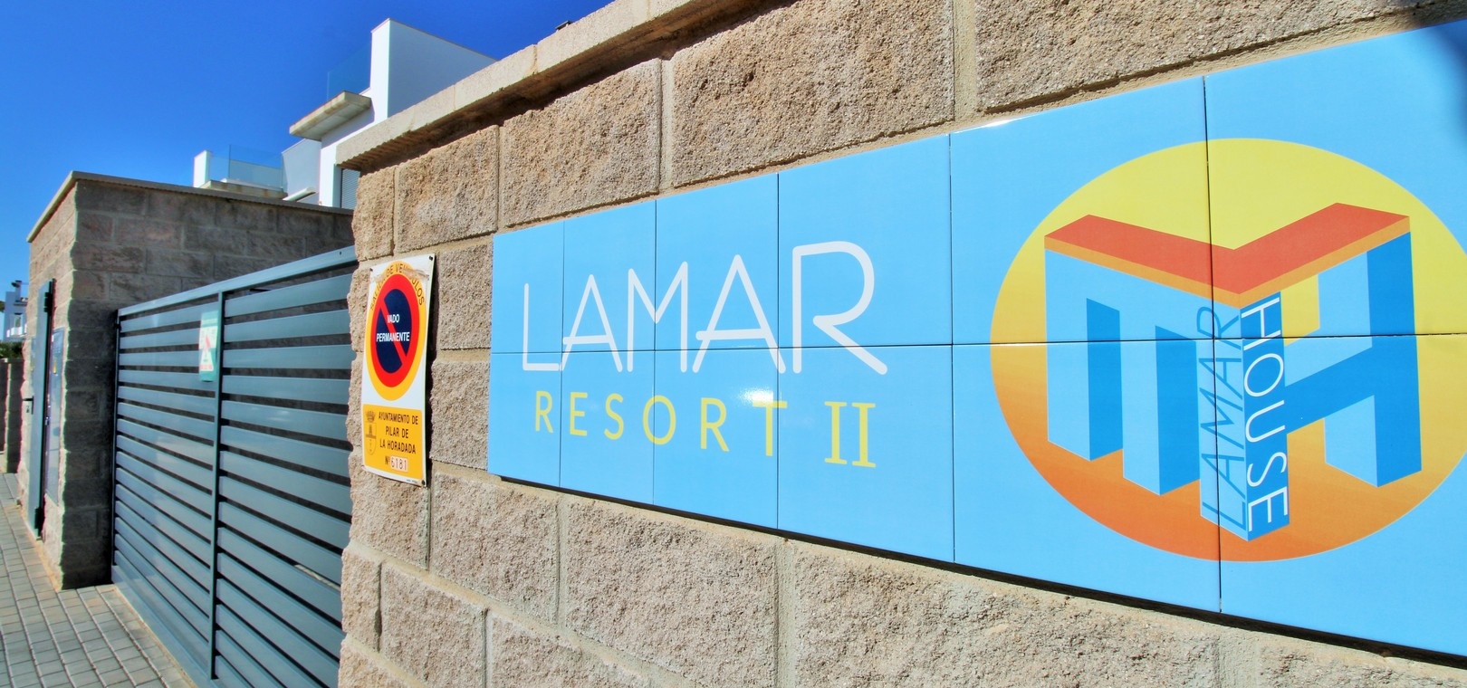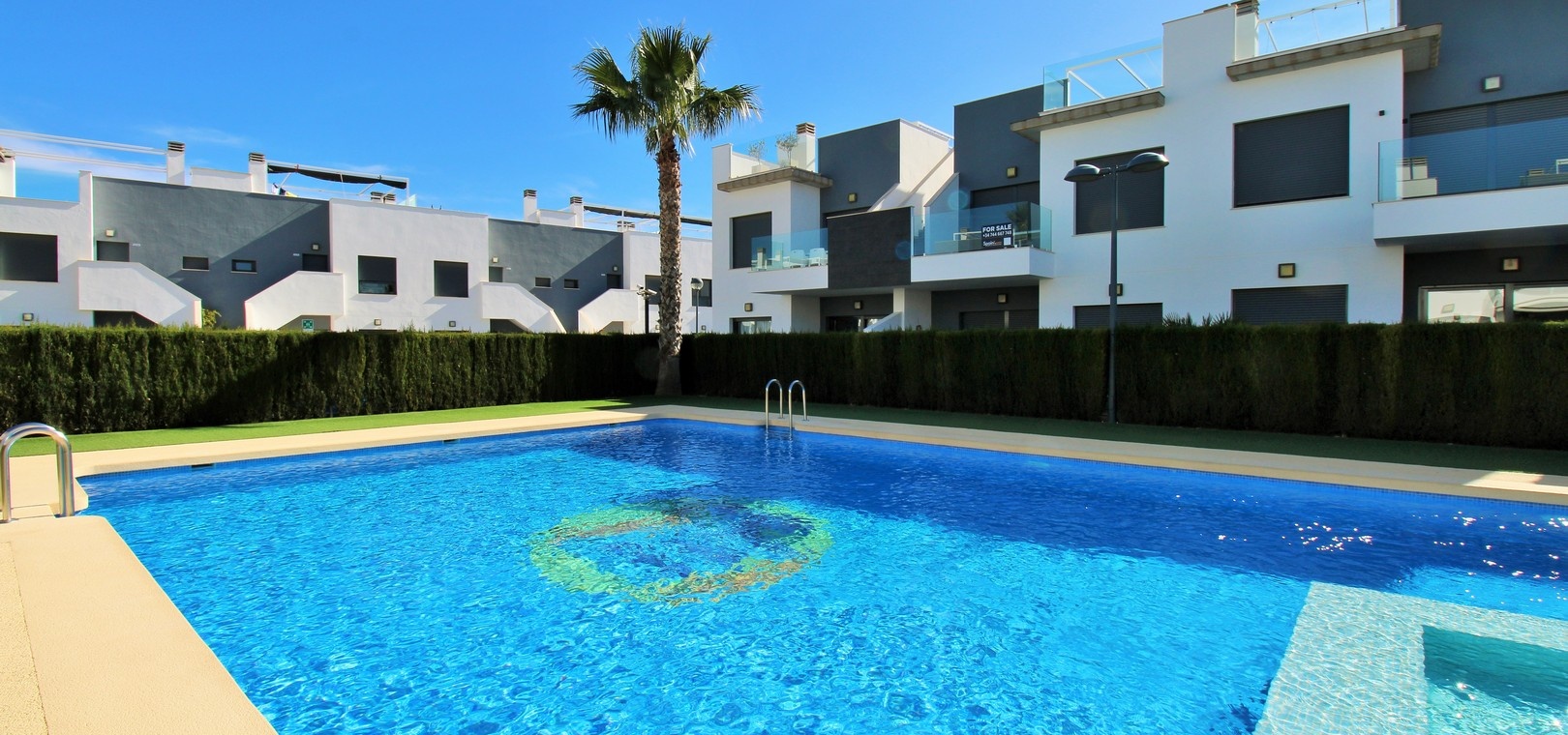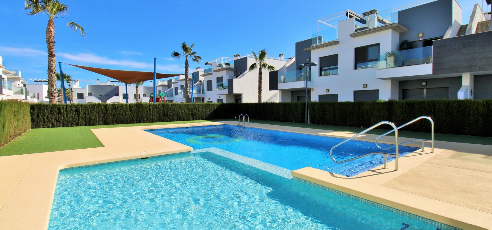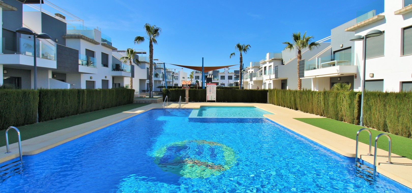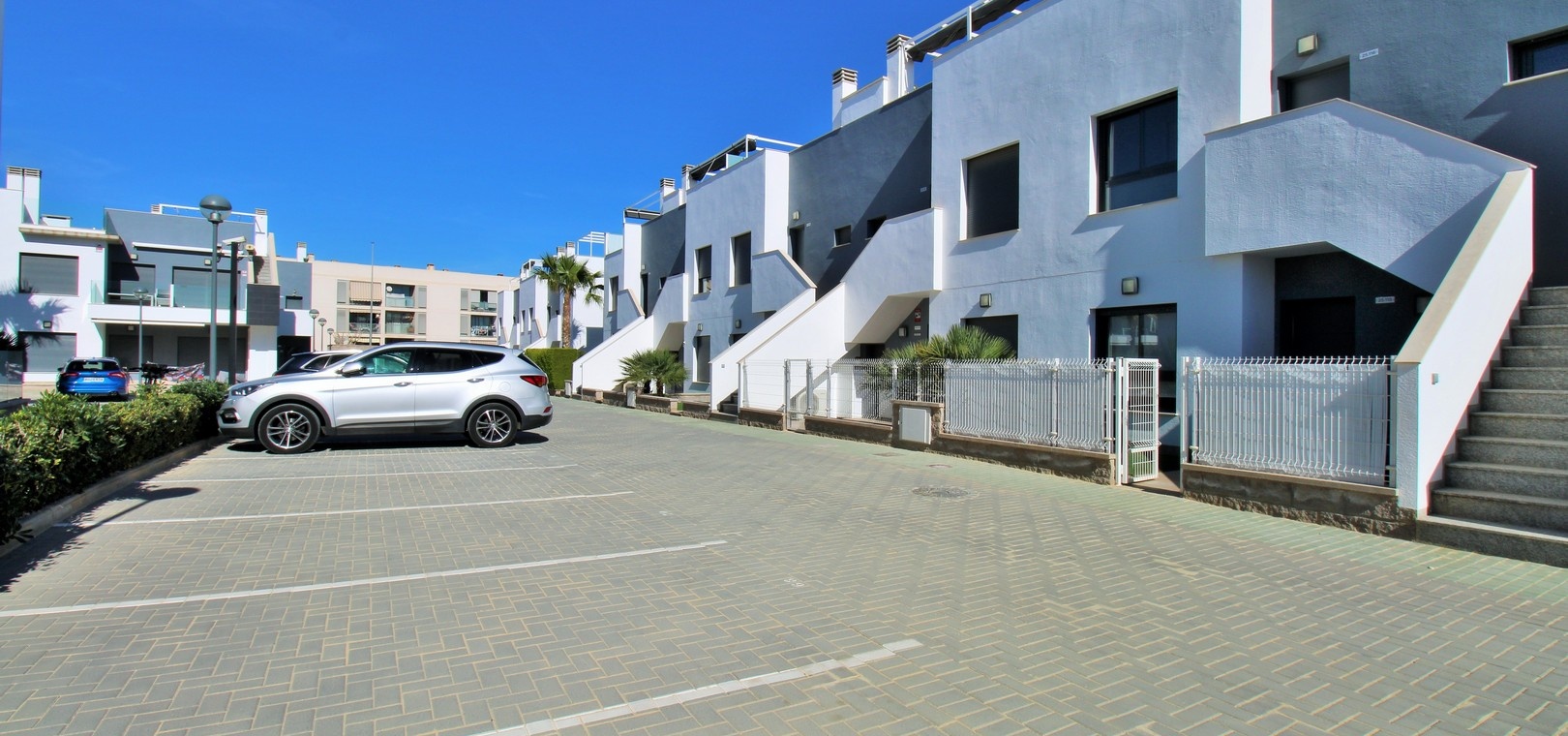 Beautifully presented modern two-bedroom, two-bathroom ground-floor apartment situated in a the highly sought-after gated community of Lamar Resort II in Pilar de la Horadada. Just a few metres from the property, you’ll find two stunning communal pool areas, offering the perfect spot to unwind and soak up the sun. The apartment benefits from two private terraces—one east-facing and one west-facing—so you can enjoy the sunshine throughout the day or find shade when needed. Whether you’re sunbathing, dining al fresco, or simply relaxing with a drink and watching the world go by, these outdoor spaces provide a wonderful extension of your living area.Inside, the spacious and stylish living area is bright and inviting, with large glass doors leading onto the main terrace. The open-plan kitchen is fully fitted with modern appliances, combining practicality with sleek design. Off the living room, you’ll find two well-proportioned bedrooms, both with fitted wardrobes. The master bedroom features an en-suite bathroom with walk-in shower, while a separate bathroom serves the rest of the apartment.Set within a secure, well-maintained complex, the property also includes a large private storage room, perfect for keeping bikes, suitcases, or other belongings. Sold fully furnished with ducted air-conditioning throughout, this is a true turnkey solution—ideal for anyone looking for a stylish, ready-to-move-into modern home.The town centre of Pilar de la Horadada is just a 10-15 minute walk away, offering a fantastic selection of restaurants, bars, shops, and amenities. A large supermarket is also conveniently close by. For beach lovers, the Mediterranean coastline is within easy reach—just a short drive or a 20-30 minute walk. Both Murcia and Alicante airports are easily accessible, with Murcia around 30 minutes away and Alicante approximately an hour’s drive.