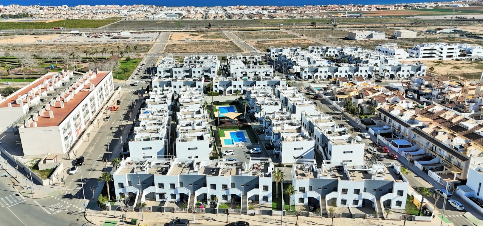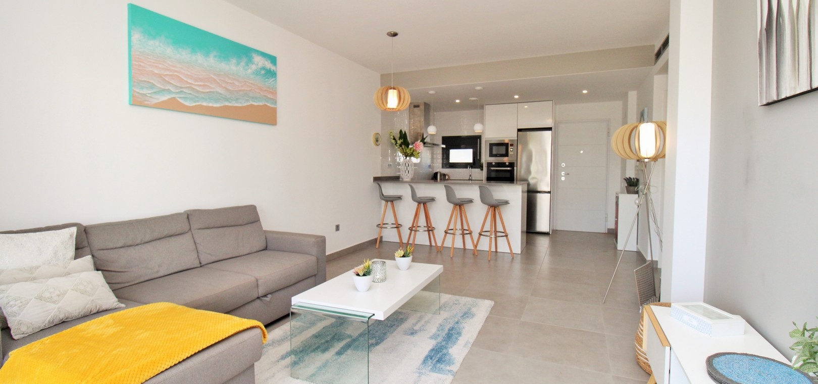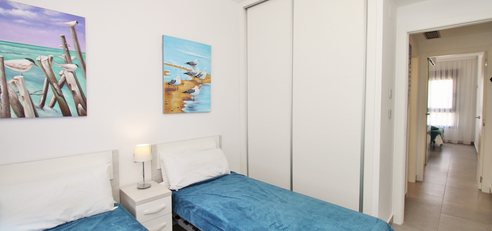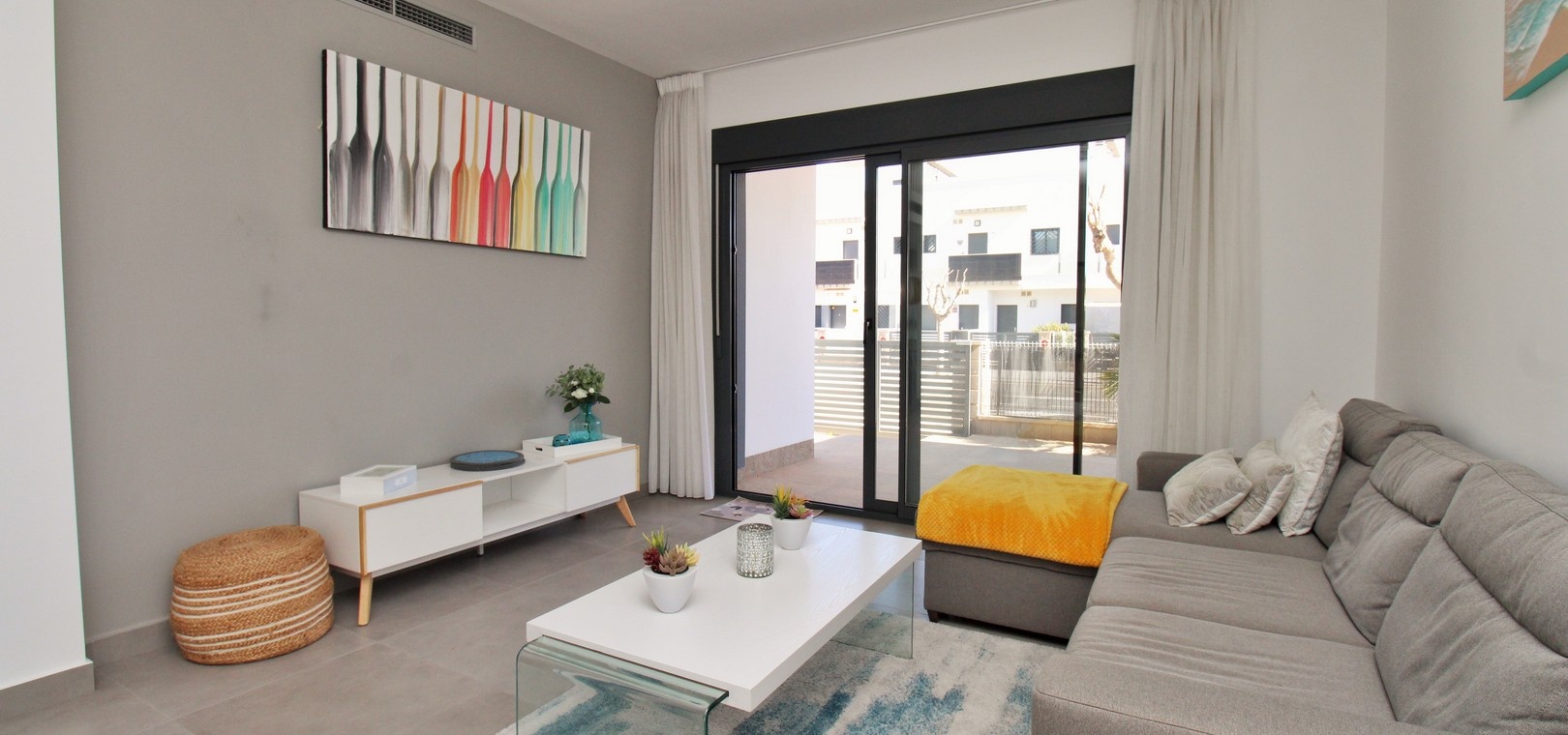 Beautifully presented modern two-bedroom, two-bathroom ground-floor apartment situated in a the highly sought-after gated community of Lamar Resort II in Pilar de la Horadada. Just a few metres from the property, you’ll find two stunning communal pool areas, offering the perfect spot to unwind and soak up the sun. The apartment benefits from two private terraces—one east-facing and one west-facing—so you can enjoy the sunshine throughout the day or find shade when needed. Whether you’re sunbathing, dining al fresco, or simply relaxing with a drink and watching the world go by, these outdoor spaces provide a wonderful extension of your living area.Inside, the spacious and stylish living area is bright and inviting, with large glass doors leading onto the main terrace. The open-plan kitchen is fully fitted with modern appliances, combining practicality with sleek design. Off the living room, you’ll find two well-proportioned bedrooms, both with fitted wardrobes. The master bedroom features an en-suite bathroom with walk-in shower, while a separate bathroom serves the rest of the apartment.Set within a secure, well-maintained complex, the property also includes a large private storage room, perfect for keeping bikes, suitcases, or other belongings. Sold fully furnished with ducted air-conditioning throughout, this is a true turnkey solution—ideal for anyone looking for a stylish, ready-to-move-into modern home.The town centre of Pilar de la Horadada is just a 10-15 minute walk away, offering a fantastic selection of restaurants, bars, shops, and amenities. A large supermarket is also conveniently close by. For beach lovers, the Mediterranean coastline is within easy reach—just a short drive or a 20-30 minute walk. Both Murcia and Alicante airports are easily accessible, with Murcia around 30 minutes away and Alicante approximately an hour’s drive.
