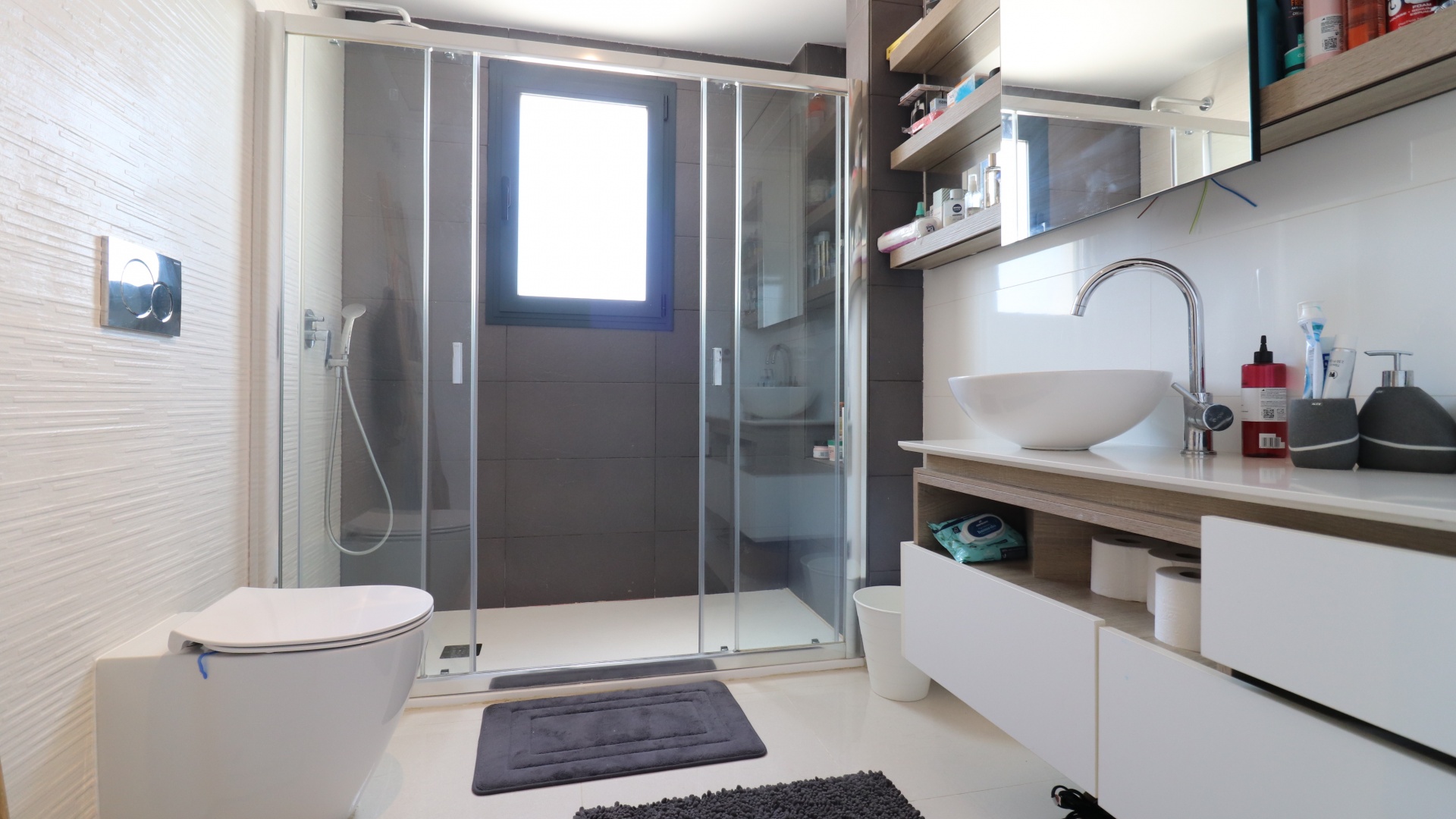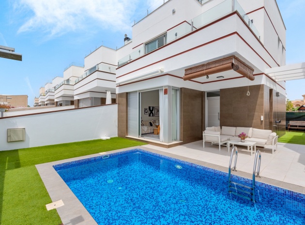 This Superior, Stunning, Luxury, Corner, Four Bedroom, South-East & South-West Facing Semi Detached Villa in La Laguna is located in Ciudad Quesada, close to Pueblo Bravo & La Fiesta. Situated within a 6 minute walk or a minutes drive to the nearest amenities and facilities, including main brand supermarkets... Beaches also at Guardamar in just an 8 minute drive! This fabulous property has been finished to a very high standard, consisting of four levels, comprising on the ground floor of a modern open plan fully fitted kitchen, with a breakfast bar & side door to the garden + parking area; lounge/dining room with lovely decor and finish, with access out to the front gardens + direct access to the communal gardens & swimming pool; and a cloakroom also on this level. On the first floor there are two double bedrooms, the master with en suite bathroom + large sliding doors out to a superb covered terrace, with views over the communal swimming pool; the other bedroom with private terrace too; and a family shower room. On the 2nd floor is an extremely spacious, private roof top solarium, fully equipped with pergola + Jacuzzi, benefiting from spectacular panoramic views all around the area, countryside and salt lakes... The under build consists of a further two double bedrooms, both with en suite shower rooms; and a storeroom on this level too. Outside is a low maintenance graveled and artificial grassed garden, with off road parking, room for a private pool, and plenty of space to relax and entertain, not forgetting the fitted outside kitchen area & utility cupboard! This super property comes with many different extras such as fitted wardrobes, air conditioning throughout, under floor heating in all the bathrooms, sun awnings and more... Simply wow!!!