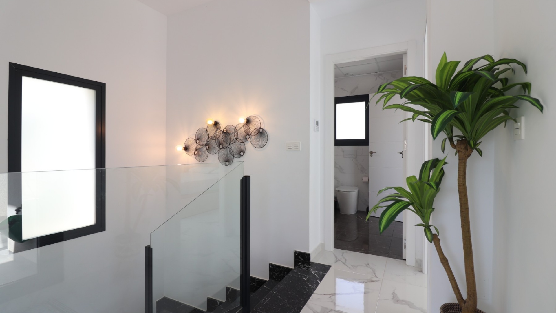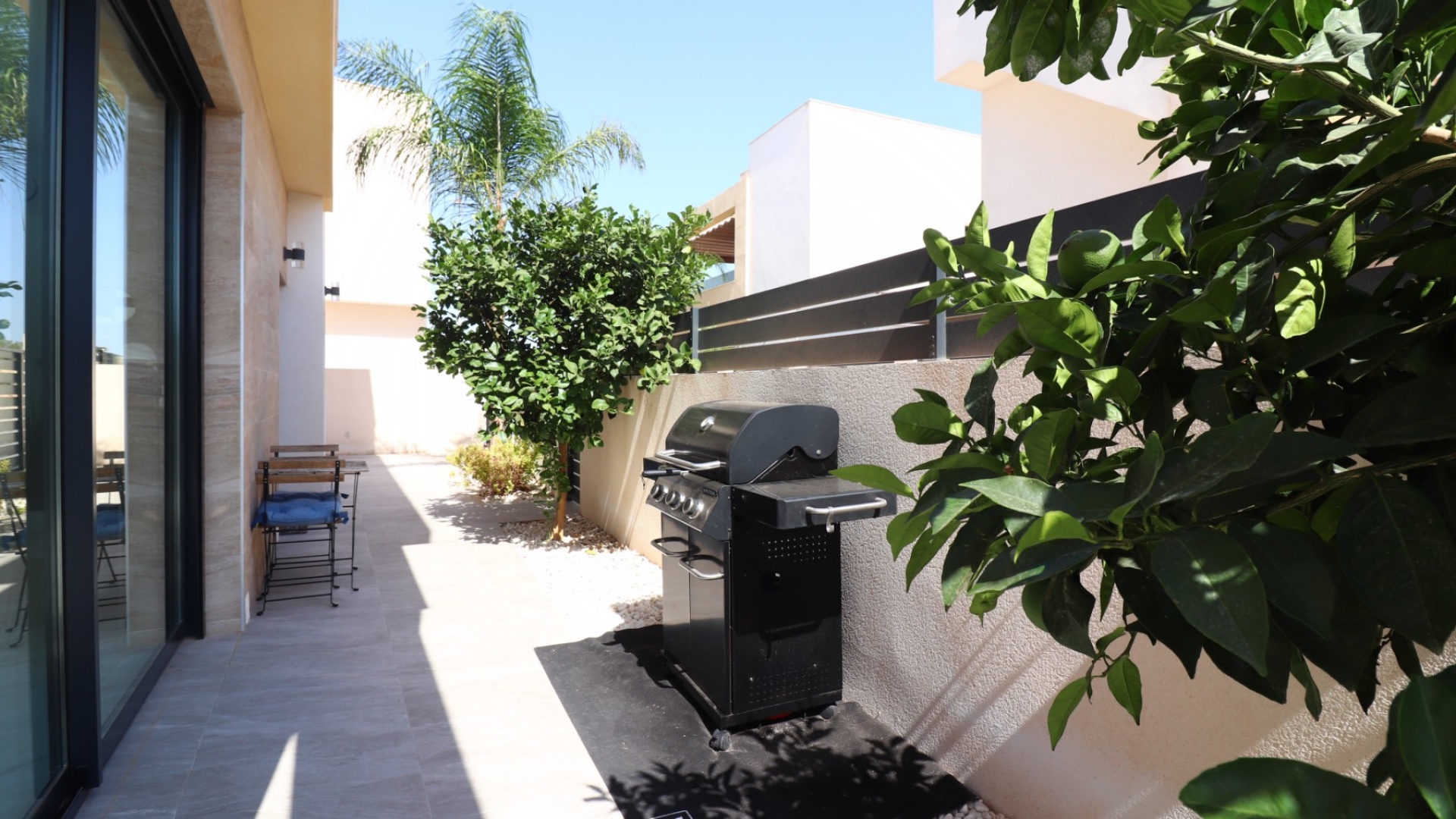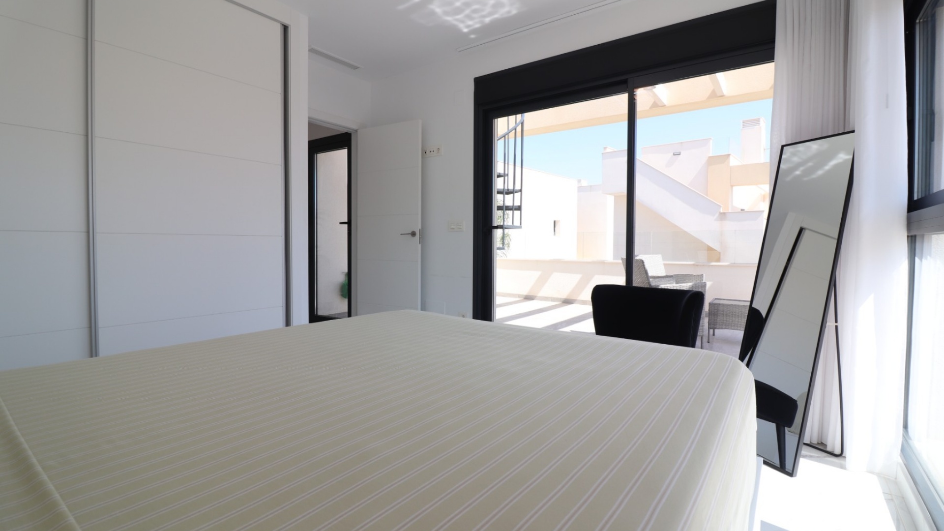 This As New South Facing, Three Bedroom Detached Villa in La Herrada, Los Montesinos is located within a 5 minutes walk of amenities and facilities on the urbanization itself, and just a 15 minutes drive from the beach. The villa features two shower rooms, one cloakroom, and an open-plan kitchen. The huge rooftop solarium offers stunning lake views. Additional features include electric shutters, air conditioning throughout, and fitted wardrobes in all three bedrooms, with two bedrooms having en suite bathrooms. Outside, the property boasts a private tiled and astro-turfed garden, a private 6.5x3 pool, and a shaded patio area next to the pool, perfect for relaxation. Off-road parking is available, and two of the bedrooms lead out to a nicely sized shaded terrace with slight lake views on the first floor. Located in Costa Blanca South, this modern villa, built in 2021, offers quality finishes, a 135m2 build size on a 213m2 plot, and has no community fees. THIS PROPERTY ALSO BENEFITS FROM A TOURIST LICENSE!