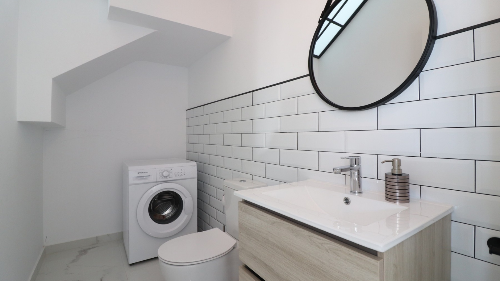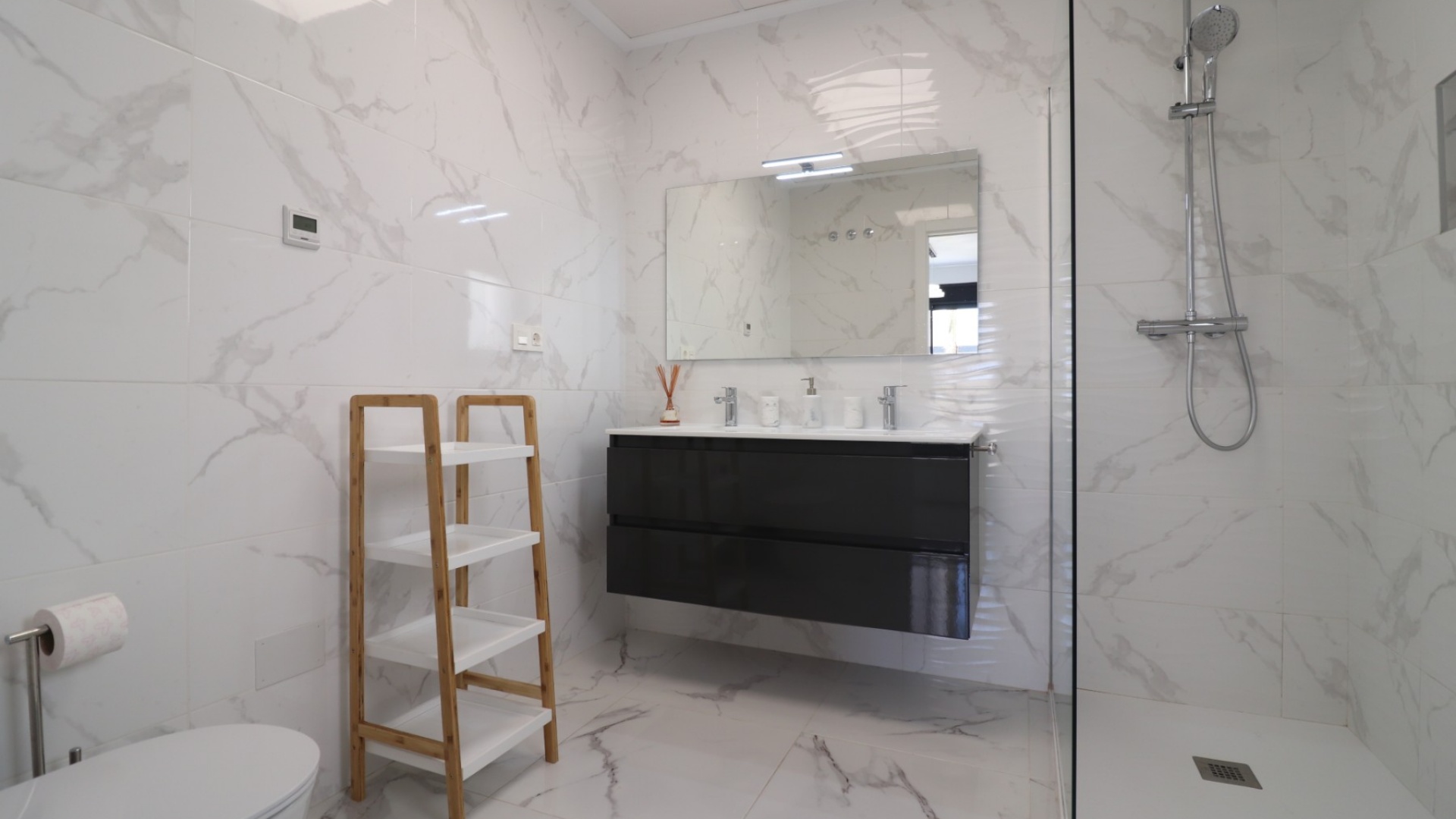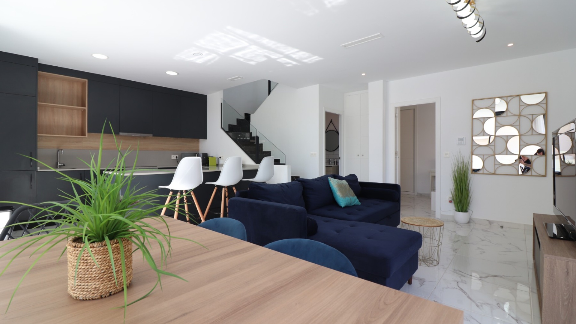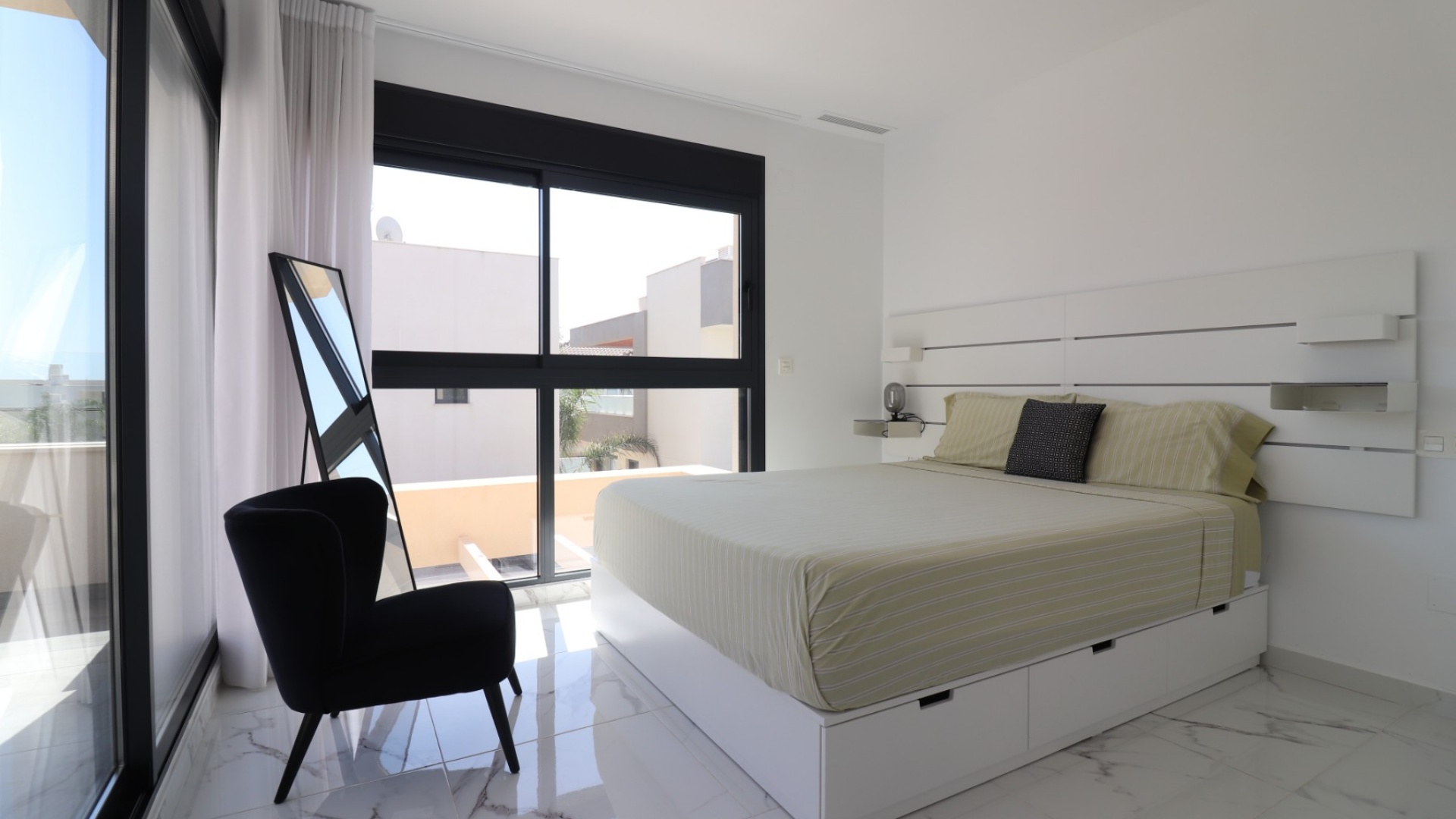 This As New South Facing, Three Bedroom Detached Villa in La Herrada, Los Montesinos is located within a 5 minutes walk of amenities and facilities on the urbanization itself, and just a 15 minutes drive from the beach. The villa features two shower rooms, one cloakroom, and an open-plan kitchen. The huge rooftop solarium offers stunning lake views. Additional features include electric shutters, air conditioning throughout, and fitted wardrobes in all three bedrooms, with two bedrooms having en suite bathrooms. Outside, the property boasts a private tiled and astro-turfed garden, a private 6.5x3 pool, and a shaded patio area next to the pool, perfect for relaxation. Off-road parking is available, and two of the bedrooms lead out to a nicely sized shaded terrace with slight lake views on the first floor. Located in Costa Blanca South, this modern villa, built in 2021, offers quality finishes, a 135m2 build size on a 213m2 plot, and has no community fees. THIS PROPERTY ALSO BENEFITS FROM A TOURIST LICENSE!