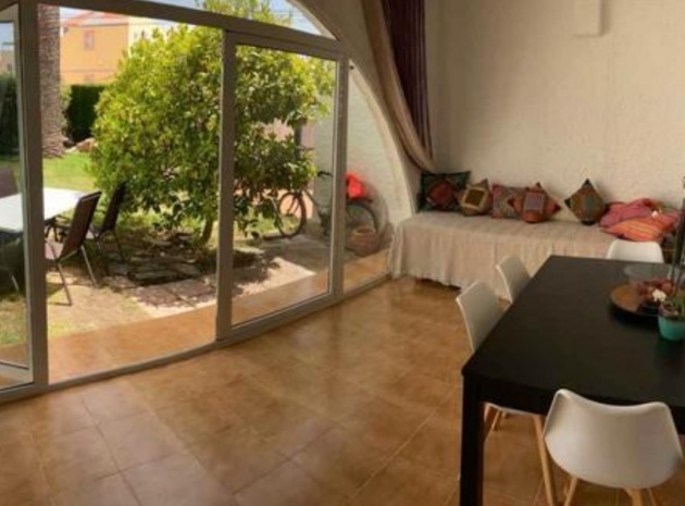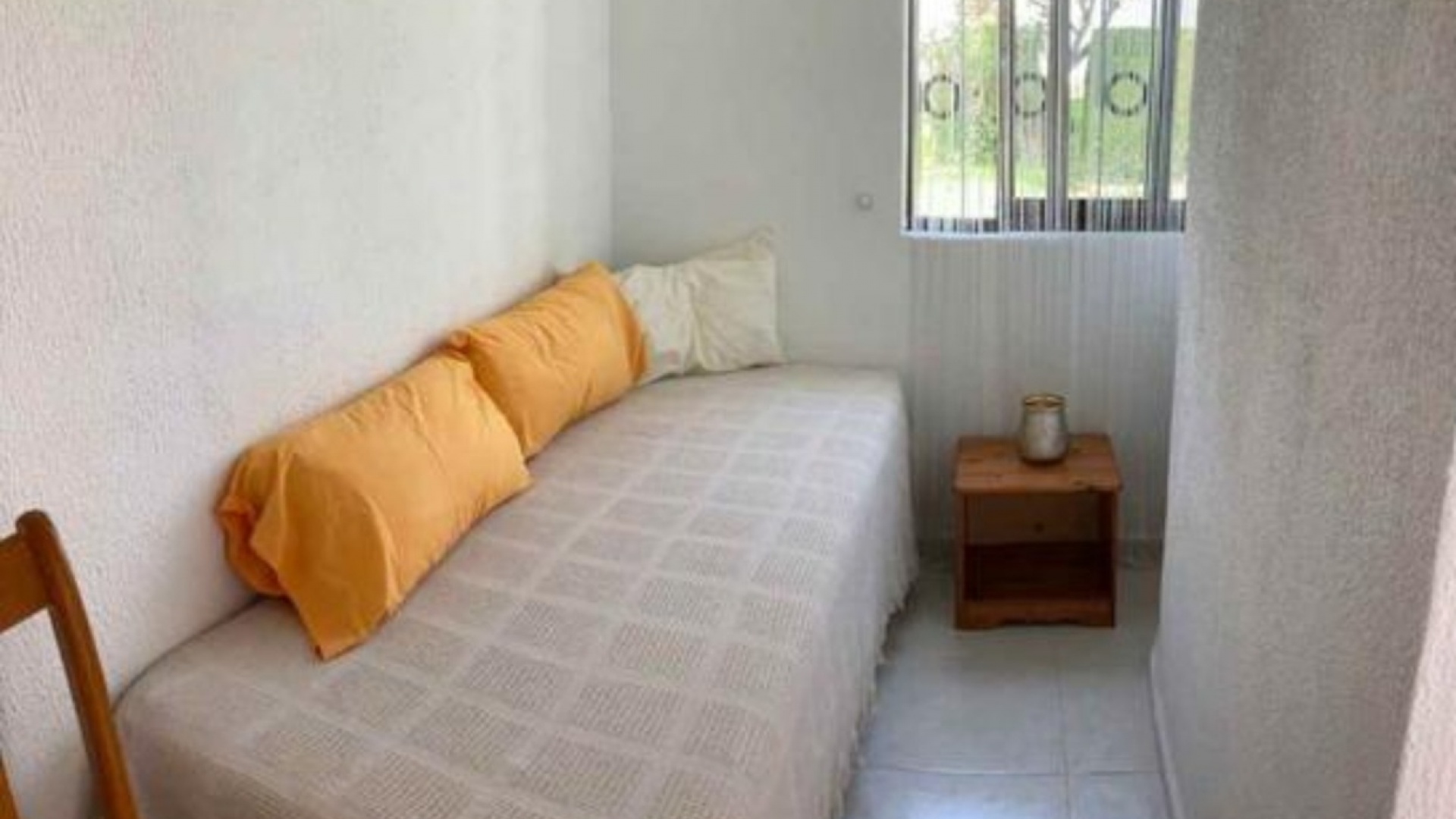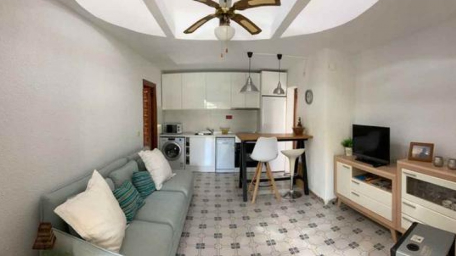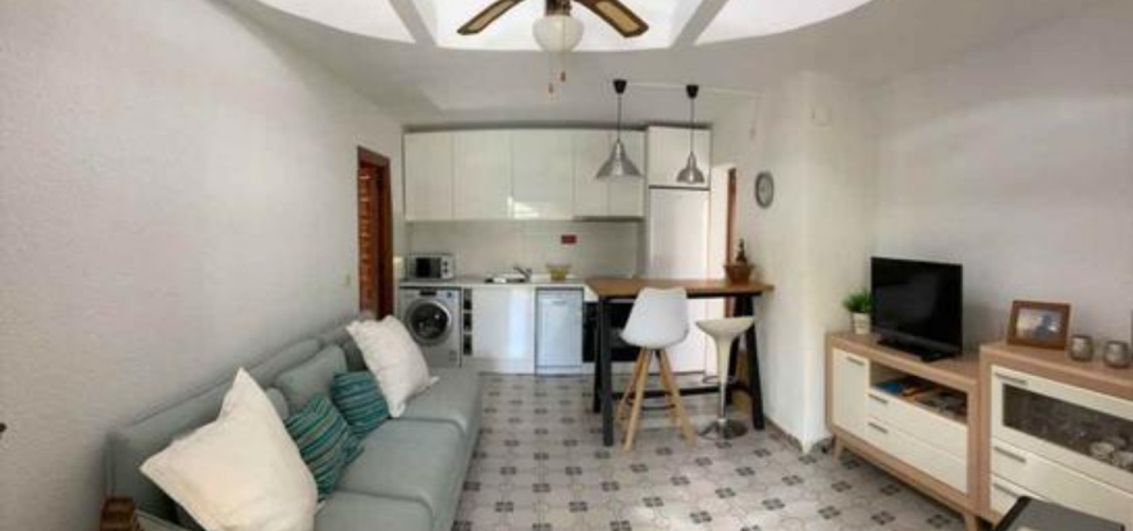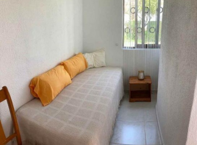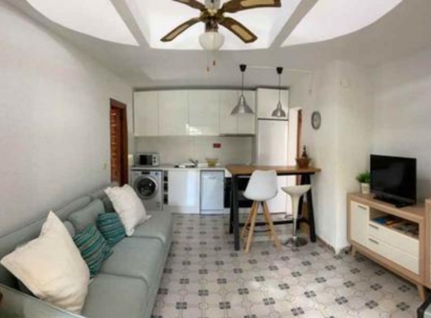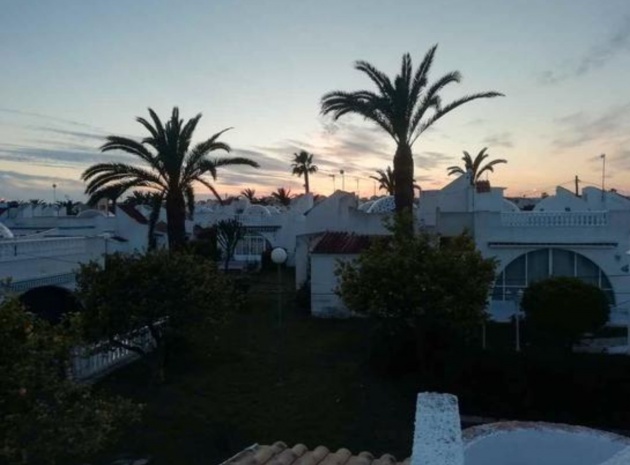 Beautiful Bungalow in Las Chismosas, Orihuela Costa, has 2 bedrooms, bathroom, kitchen, living room and closed terrace, renovated kitchen with all appliances, bathroom with shower, PVC floors, pellet stove, fans, closed terrace, with roof top solarium, furnished, could do with some modernisation which is refelected in the asking price. 10 minutes from beaches and great coves, 5 minutes CC la Zenia, next to the municipal sports center, schools, institutes, supermarkets, restaurants.... Very quiet urbanization with large green areas, plants and fruit trees.