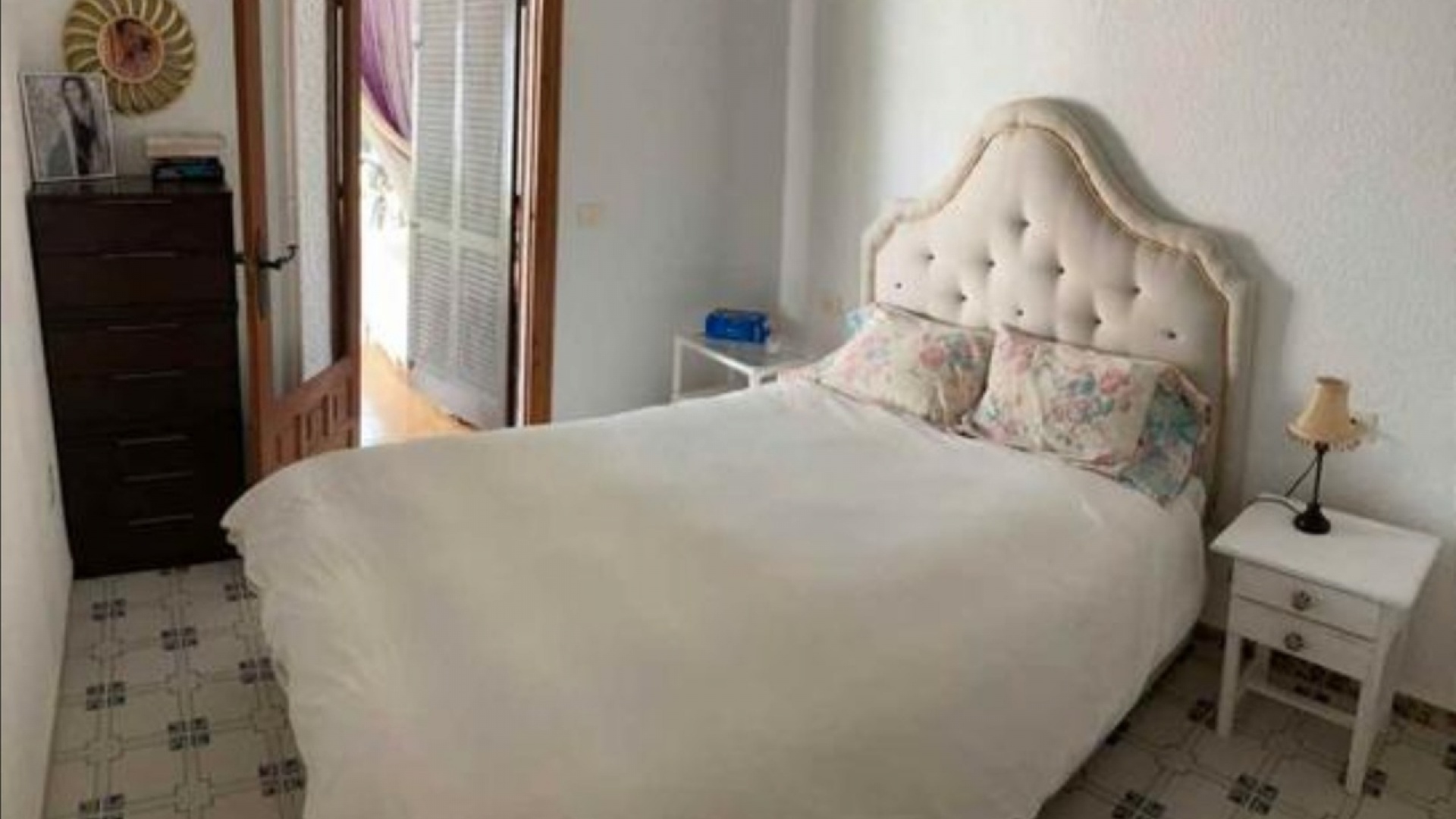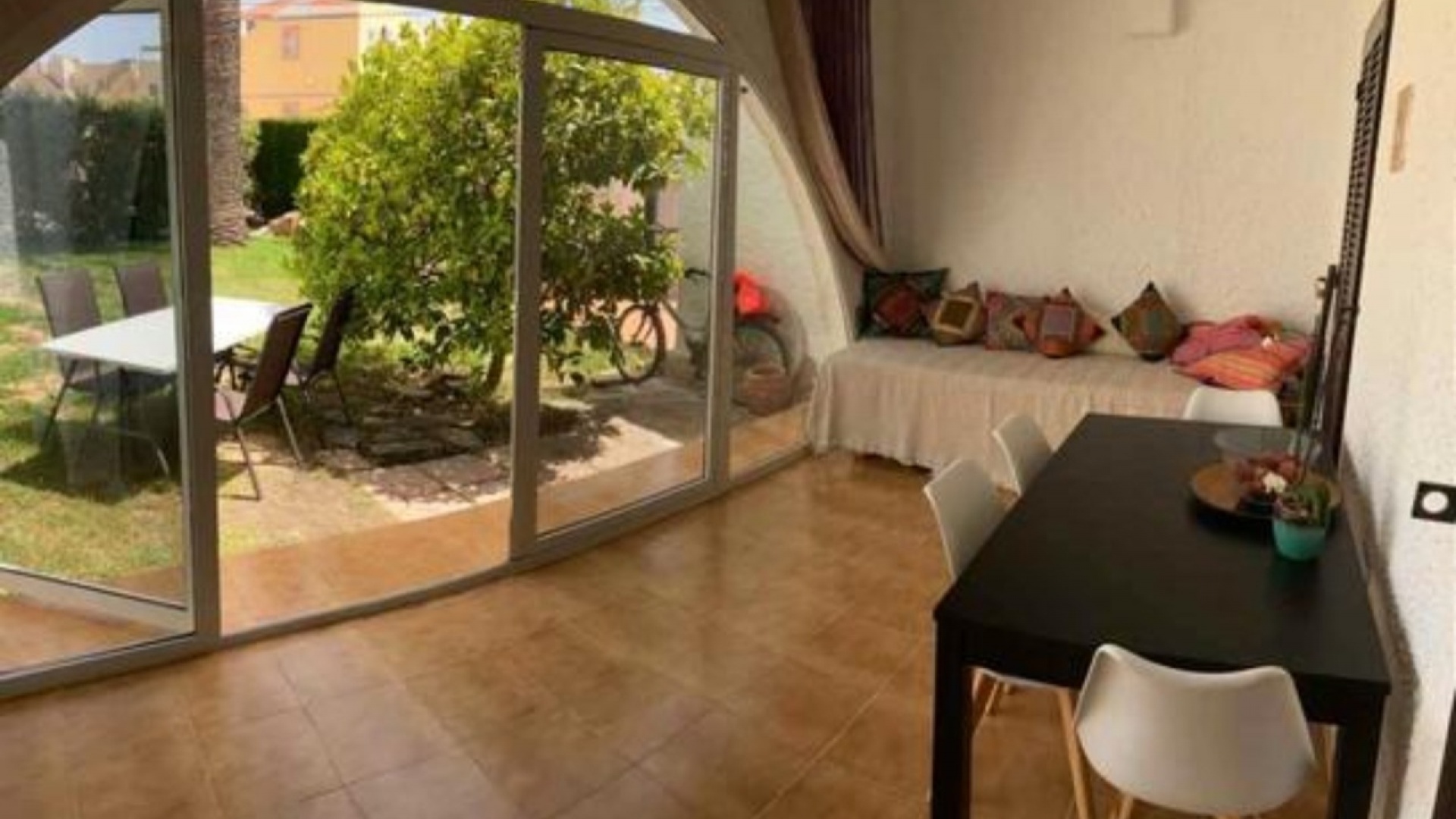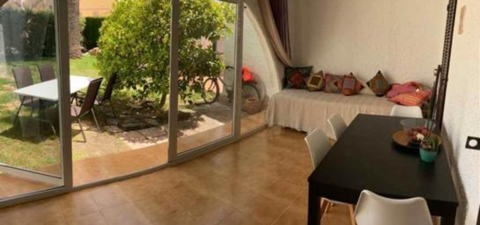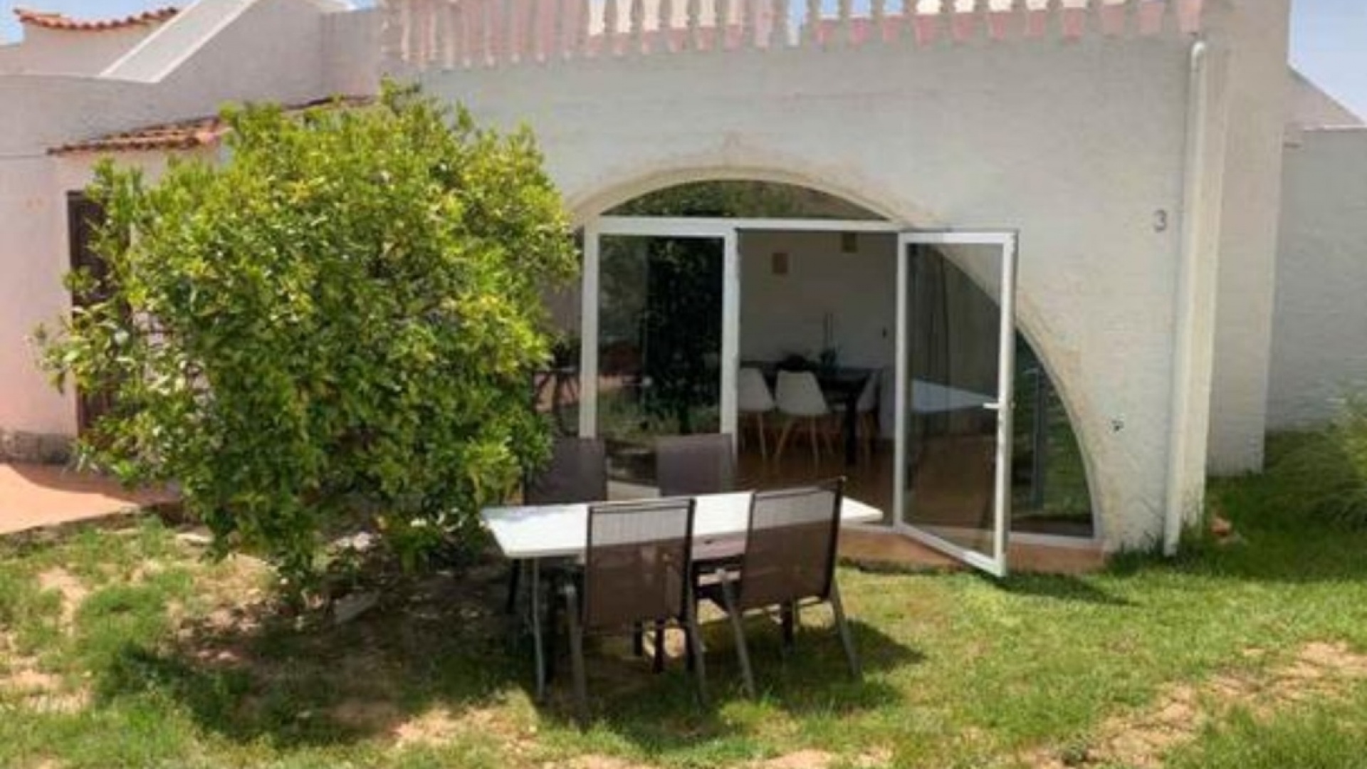 Beautiful Bungalow in Las Chismosas, Orihuela Costa, has 2 bedrooms, bathroom, kitchen, living room and closed terrace, renovated kitchen with all appliances, bathroom with shower, PVC floors, pellet stove, fans, closed terrace, with roof top solarium, furnished, could do with some modernisation which is refelected in the asking price. 10 minutes from beaches and great coves, 5 minutes CC la Zenia, next to the municipal sports center, schools, institutes, supermarkets, restaurants.... Very quiet urbanization with large green areas, plants and fruit trees.