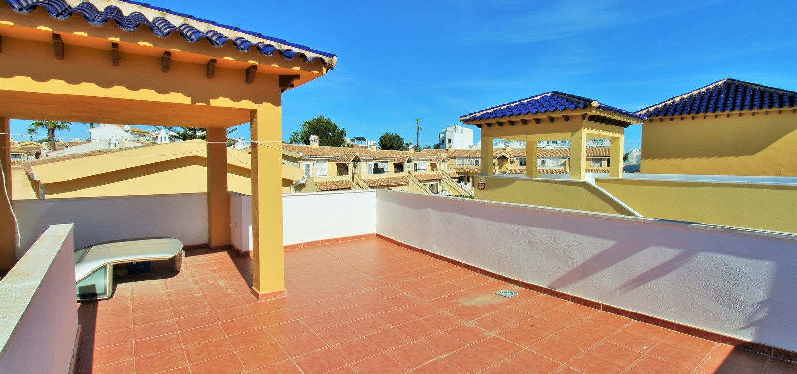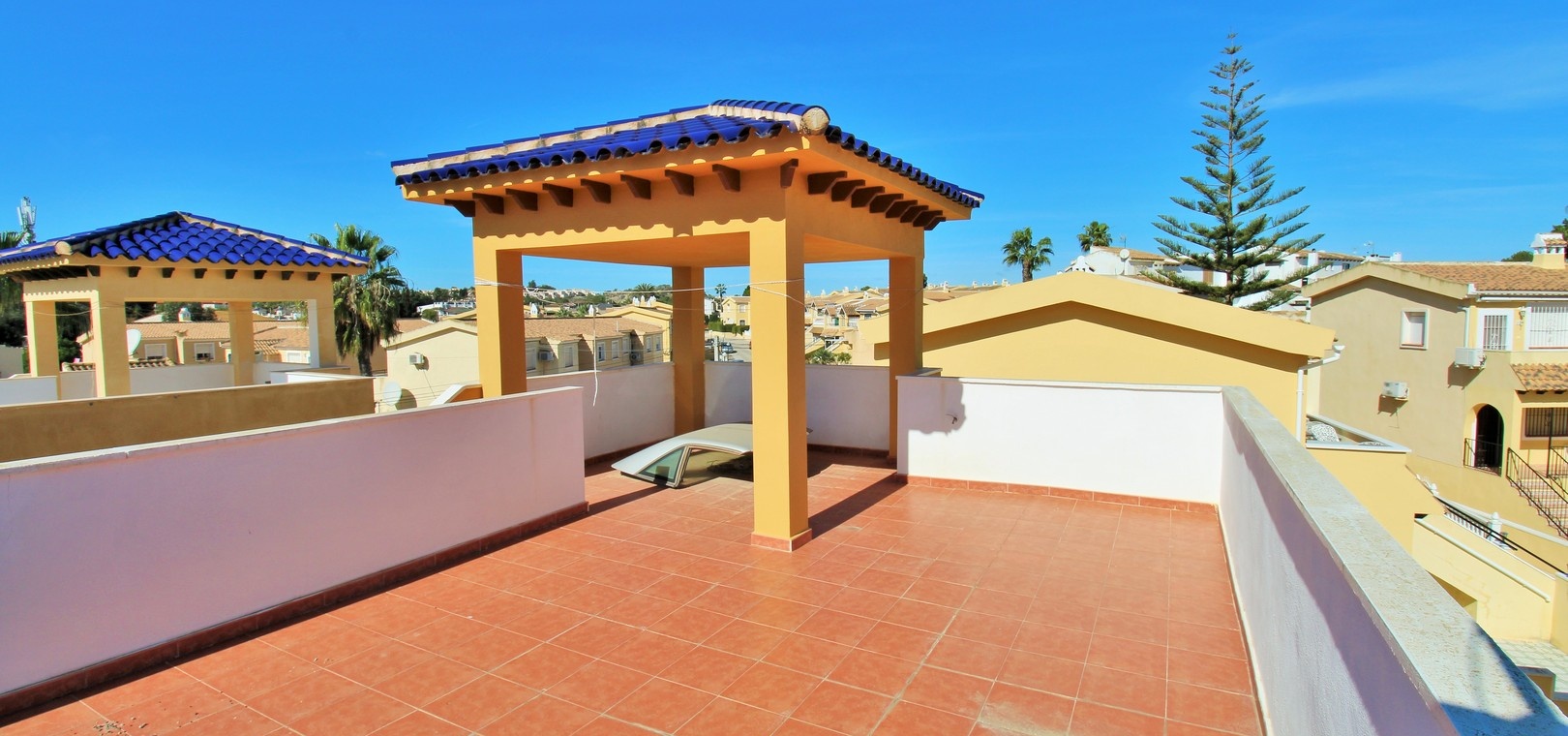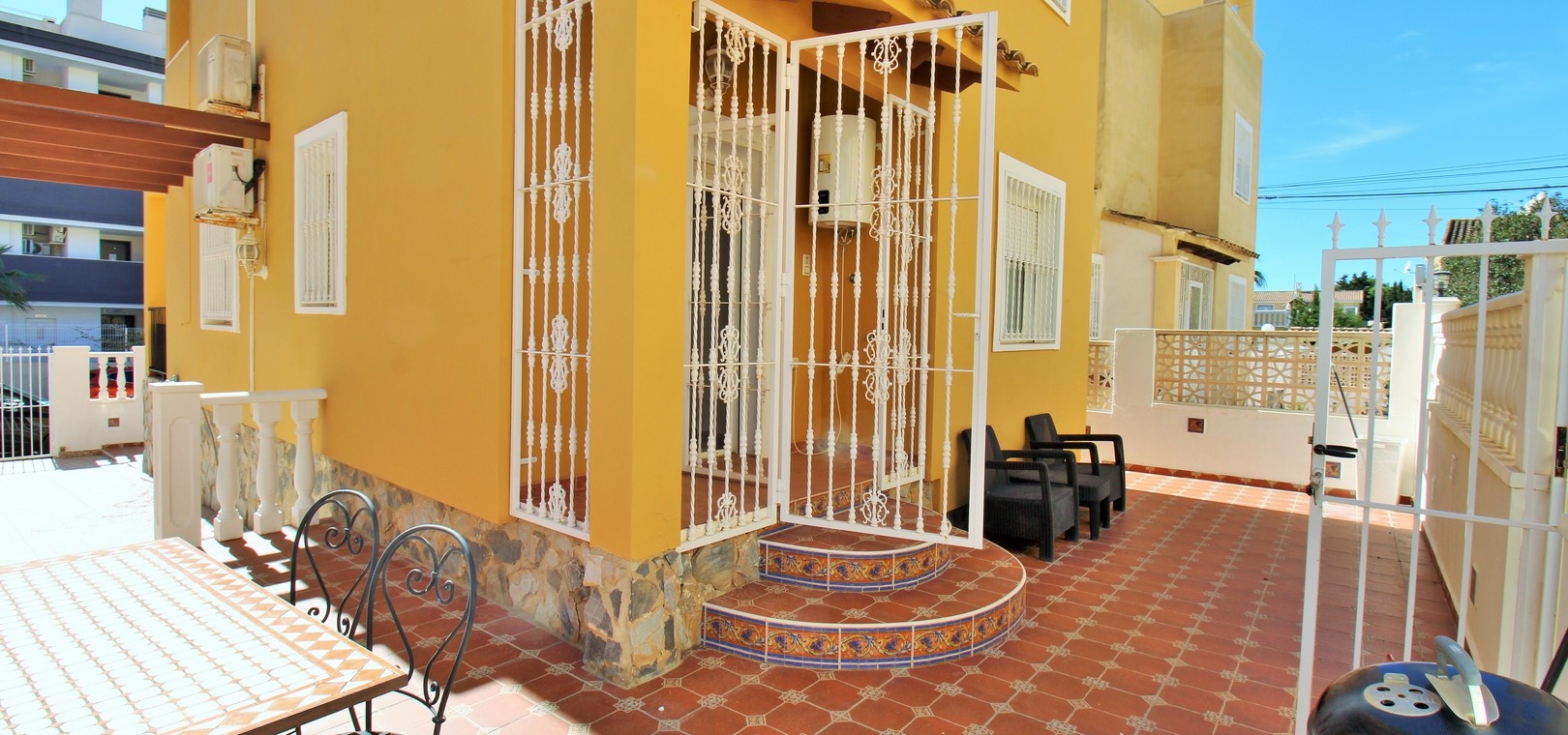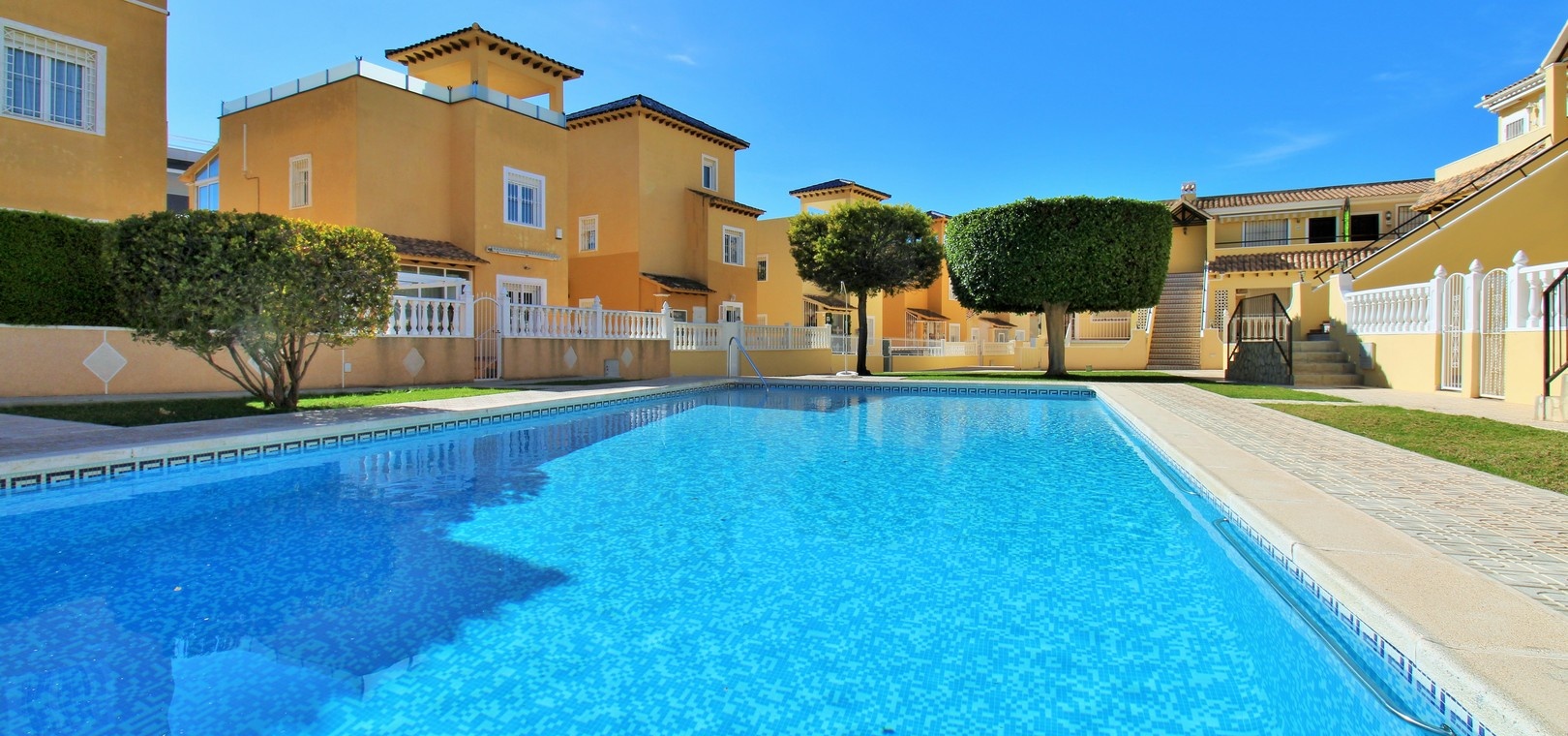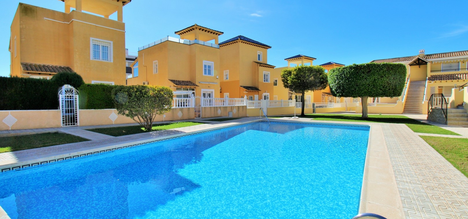 This charming South-facing, three-bedroom detached villa is nestled in the sought-after community of Lomas del Golf, Villamartin. Just a 10-minute walk from the renowned Villamartin Plaza and golf course, the property enjoys all-day sunshine and direct access to a beautifully maintained communal pool.The ground floor features a bright and airy lounge-dining area with an open-plan kitchen, a double bedroom with fitted wardrobes, and a shower room. Upstairs, you’ll find two additional bedrooms, both with fitted wardrobes, and a family bathroom. The master bedroom opens onto a covered balcony, with stairs leading up to a spacious roof solarium offering lovely views of the pool and surrounding area.Designed for outdoor living, the villa boasts a tiled garden, off-road parking, and a raised terrace. The kitchen provides direct access to the garden and communal pool, while a convenient storage/utility area is tucked beneath the terrace. The property is sold fully furnished, including white goods and air-conditioning, making it move-in ready.Whether you're looking for a full-time residence or a holiday retreat, this well-maintained villa is an excellent choice. Ideally located just a short stroll from vibrant bars, restaurants, shops, and a supermarket, it’s also a quick drive to Zenia Boulevard shopping centre, the blue flag beaches of Orihuela Costa, and prestigious golf courses like Las Ramblas, Campoamor, and Las Colinas.