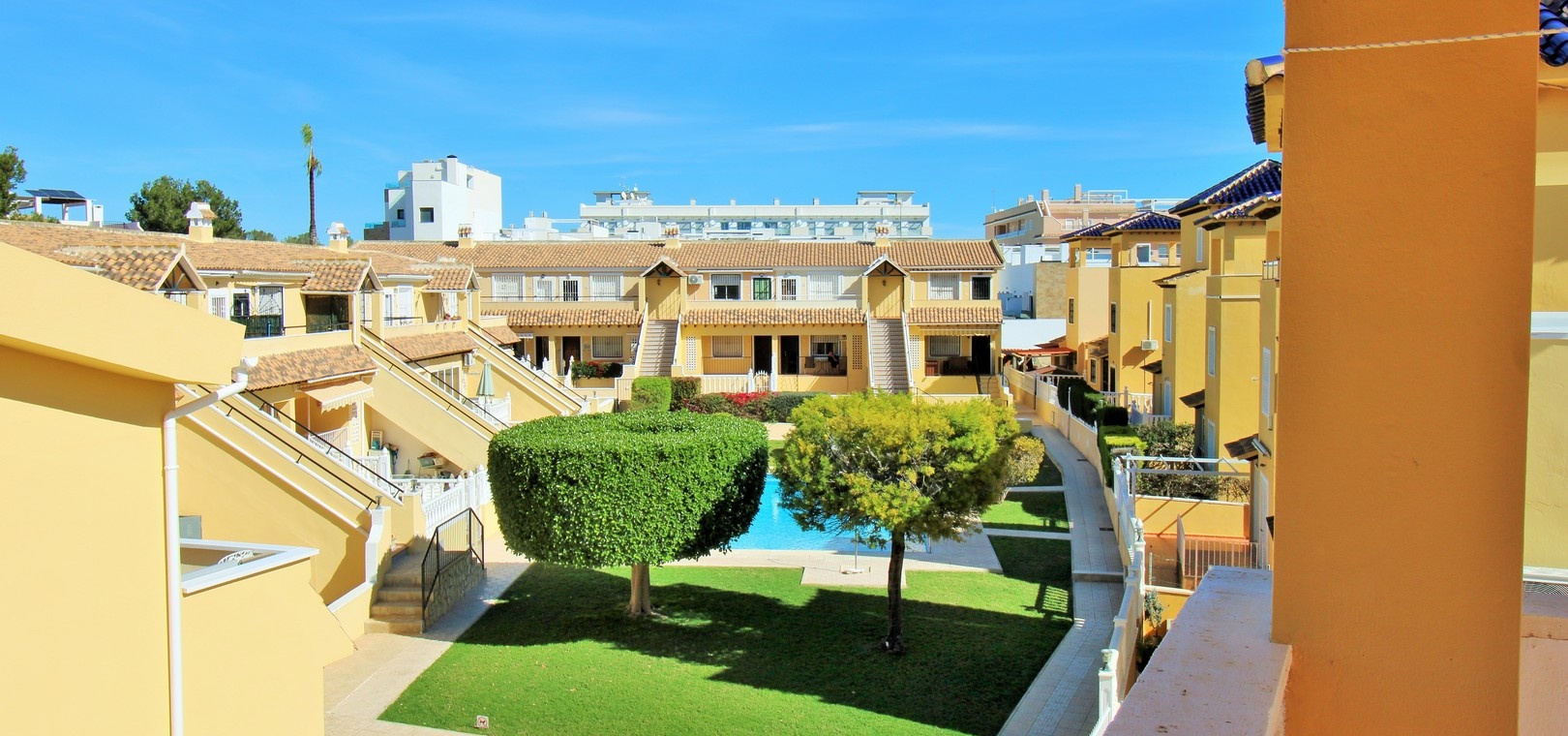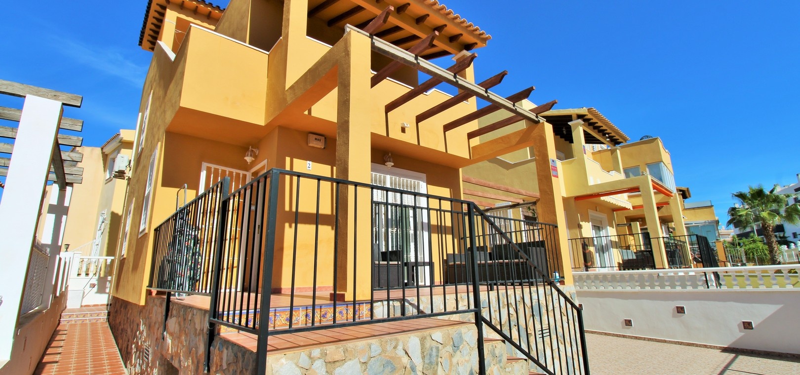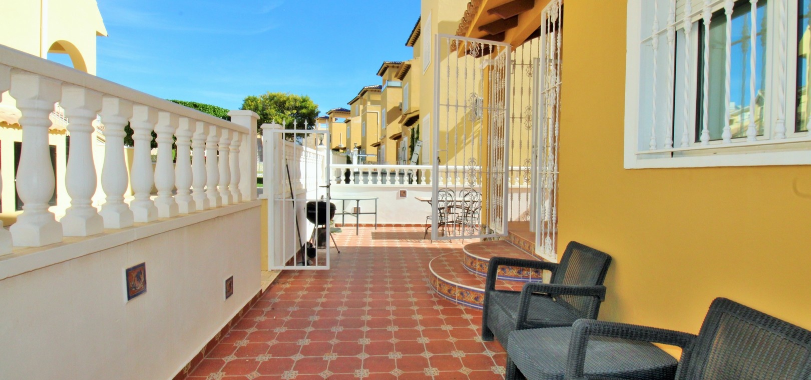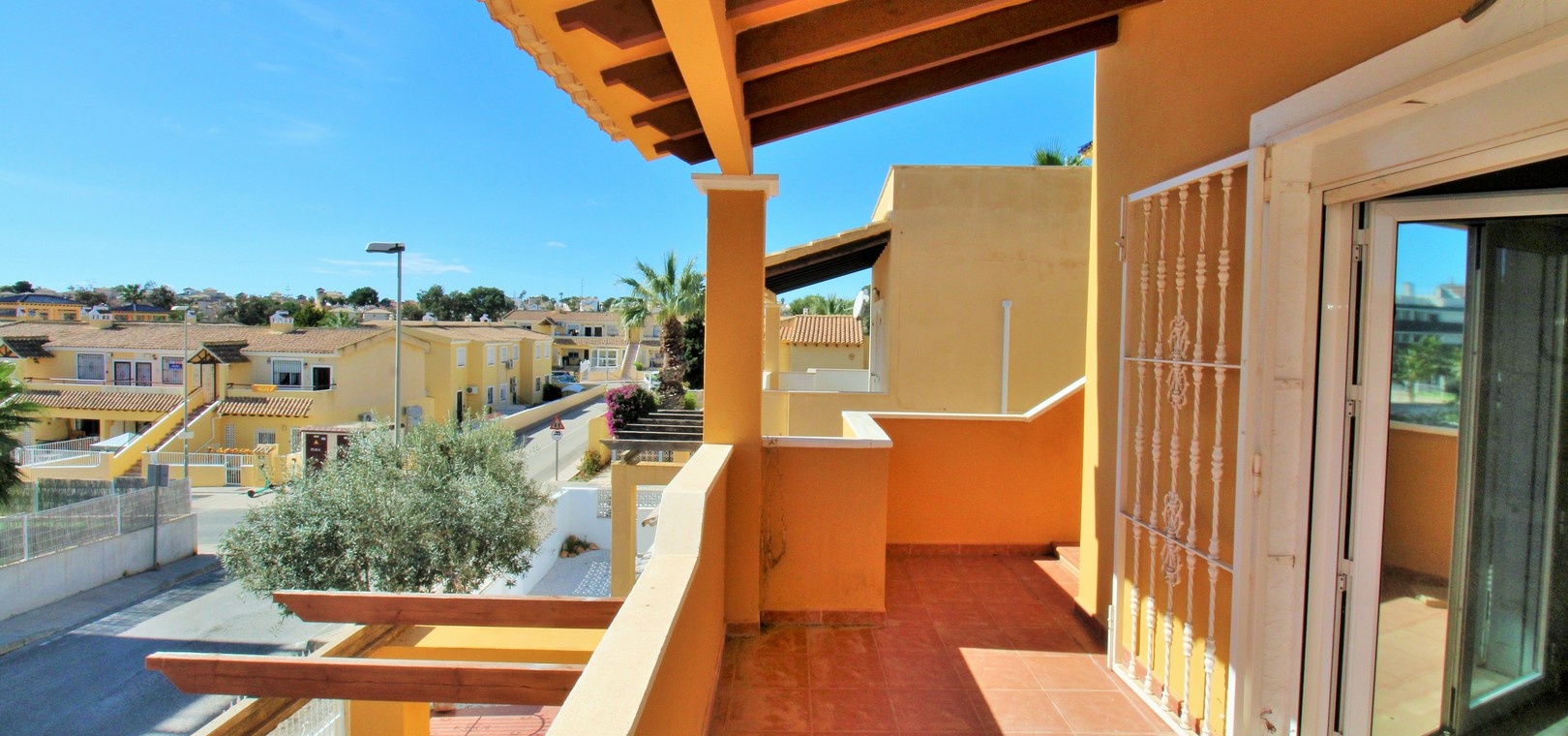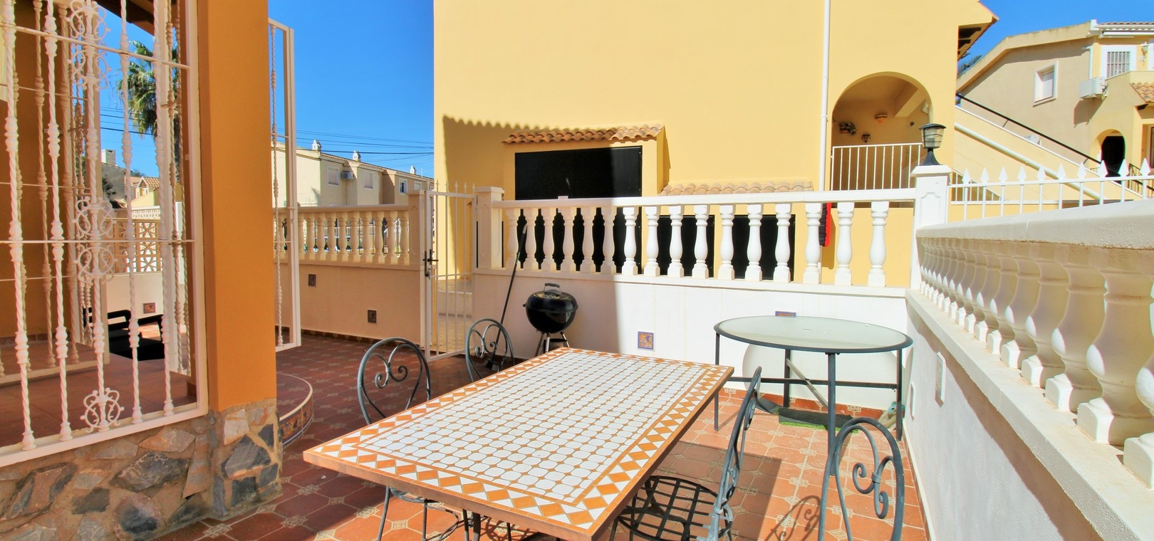 This charming South-facing, three-bedroom detached villa is nestled in the sought-after community of Lomas del Golf, Villamartin. Just a 10-minute walk from the renowned Villamartin Plaza and golf course, the property enjoys all-day sunshine and direct access to a beautifully maintained communal pool.The ground floor features a bright and airy lounge-dining area with an open-plan kitchen, a double bedroom with fitted wardrobes, and a shower room. Upstairs, you’ll find two additional bedrooms, both with fitted wardrobes, and a family bathroom. The master bedroom opens onto a covered balcony, with stairs leading up to a spacious roof solarium offering lovely views of the pool and surrounding area.Designed for outdoor living, the villa boasts a tiled garden, off-road parking, and a raised terrace. The kitchen provides direct access to the garden and communal pool, while a convenient storage/utility area is tucked beneath the terrace. The property is sold fully furnished, including white goods and air-conditioning, making it move-in ready.Whether you're looking for a full-time residence or a holiday retreat, this well-maintained villa is an excellent choice. Ideally located just a short stroll from vibrant bars, restaurants, shops, and a supermarket, it’s also a quick drive to Zenia Boulevard shopping centre, the blue flag beaches of Orihuela Costa, and prestigious golf courses like Las Ramblas, Campoamor, and Las Colinas.