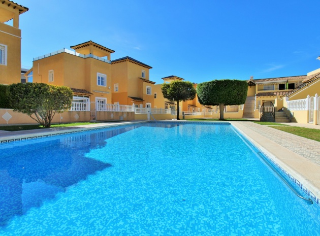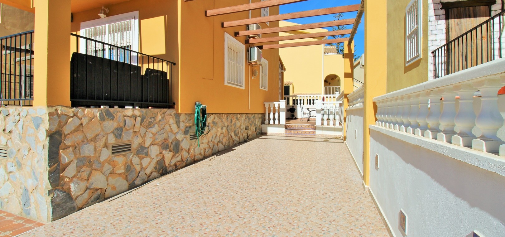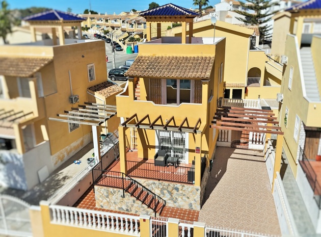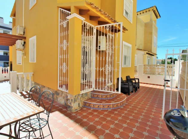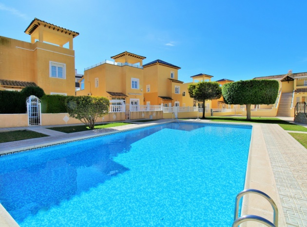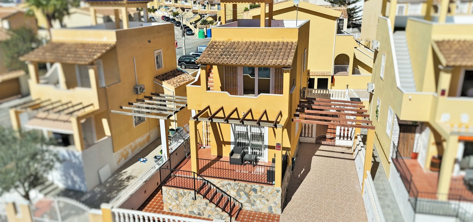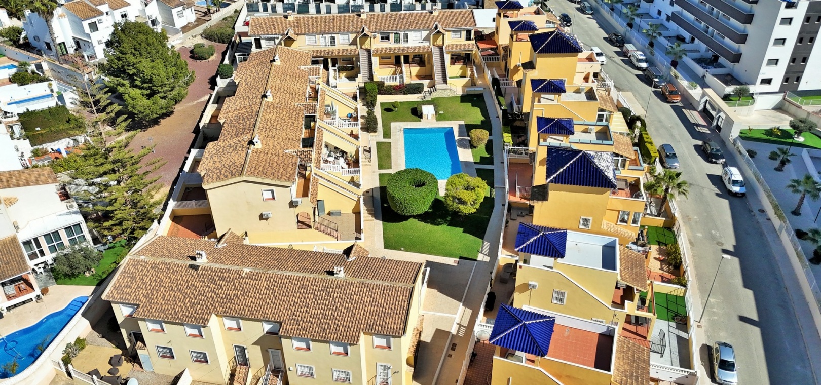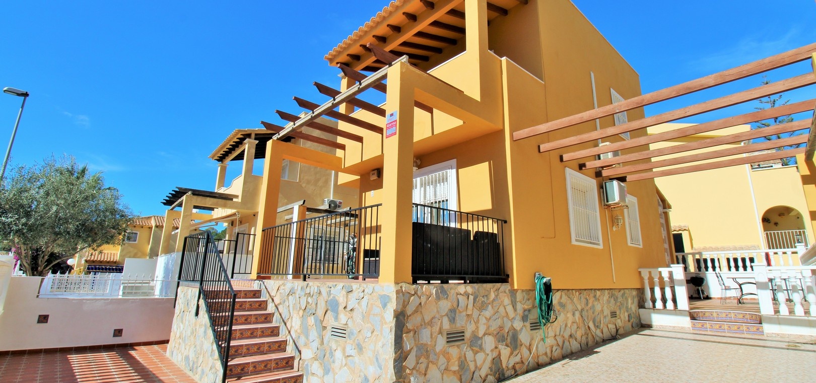 This charming South-facing, three-bedroom detached villa is nestled in the sought-after community of Lomas del Golf, Villamartin. Just a 10-minute walk from the renowned Villamartin Plaza and golf course, the property enjoys all-day sunshine and direct access to a beautifully maintained communal pool.The ground floor features a bright and airy lounge-dining area with an open-plan kitchen, a double bedroom with fitted wardrobes, and a shower room. Upstairs, you’ll find two additional bedrooms, both with fitted wardrobes, and a family bathroom. The master bedroom opens onto a covered balcony, with stairs leading up to a spacious roof solarium offering lovely views of the pool and surrounding area.Designed for outdoor living, the villa boasts a tiled garden, off-road parking, and a raised terrace. The kitchen provides direct access to the garden and communal pool, while a convenient storage/utility area is tucked beneath the terrace. The property is sold fully furnished, including white goods and air-conditioning, making it move-in ready.Whether you're looking for a full-time residence or a holiday retreat, this well-maintained villa is an excellent choice. Ideally located just a short stroll from vibrant bars, restaurants, shops, and a supermarket, it’s also a quick drive to Zenia Boulevard shopping centre, the blue flag beaches of Orihuela Costa, and prestigious golf courses like Las Ramblas, Campoamor, and Las Colinas.
