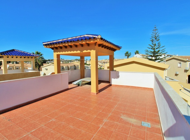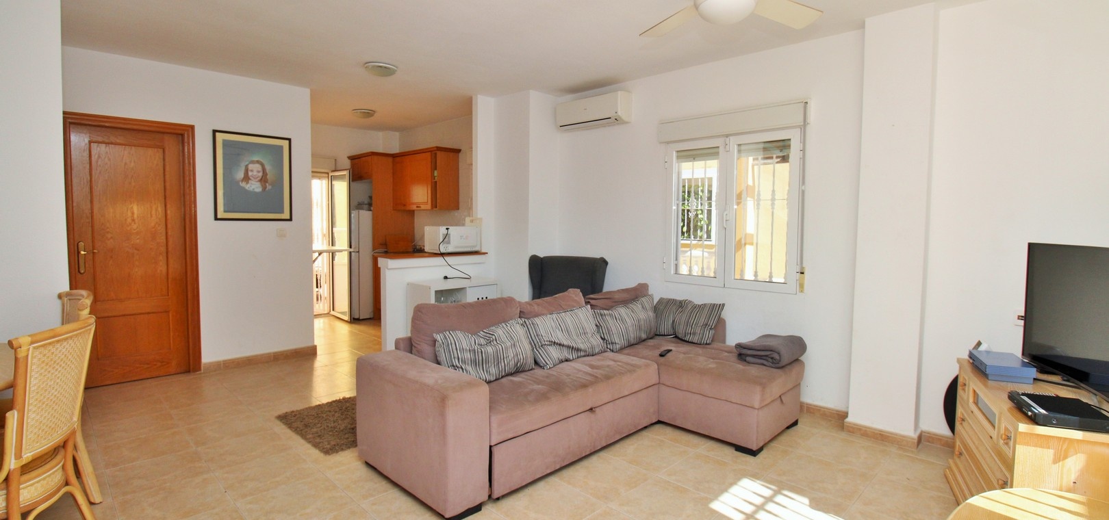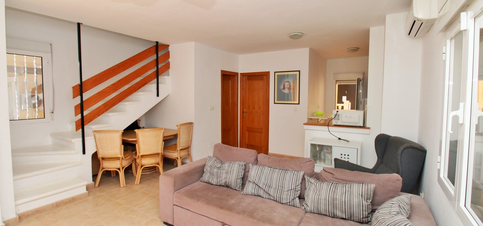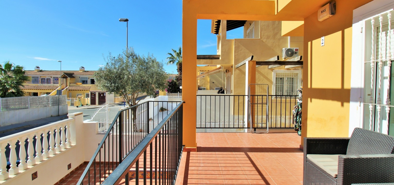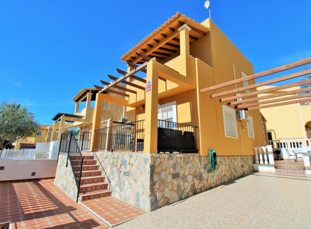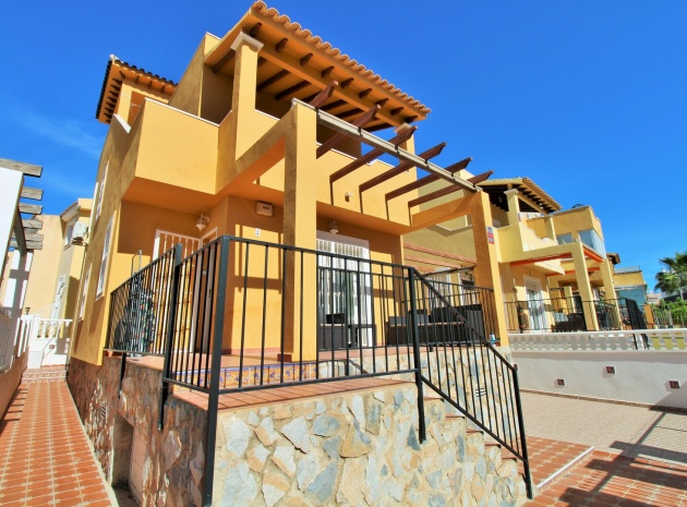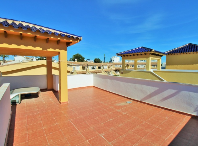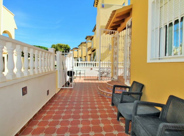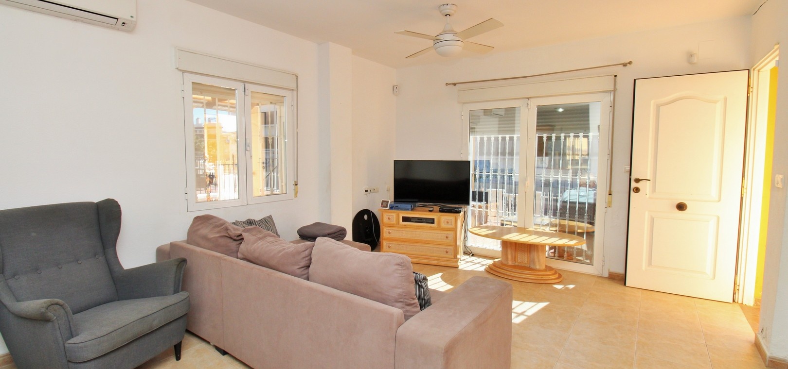 This charming South-facing, three-bedroom detached villa is nestled in the sought-after community of Lomas del Golf, Villamartin. Just a 10-minute walk from the renowned Villamartin Plaza and golf course, the property enjoys all-day sunshine and direct access to a beautifully maintained communal pool.The ground floor features a bright and airy lounge-dining area with an open-plan kitchen, a double bedroom with fitted wardrobes, and a shower room. Upstairs, you’ll find two additional bedrooms, both with fitted wardrobes, and a family bathroom. The master bedroom opens onto a covered balcony, with stairs leading up to a spacious roof solarium offering lovely views of the pool and surrounding area.Designed for outdoor living, the villa boasts a tiled garden, off-road parking, and a raised terrace. The kitchen provides direct access to the garden and communal pool, while a convenient storage/utility area is tucked beneath the terrace. The property is sold fully furnished, including white goods and air-conditioning, making it move-in ready.Whether you're looking for a full-time residence or a holiday retreat, this well-maintained villa is an excellent choice. Ideally located just a short stroll from vibrant bars, restaurants, shops, and a supermarket, it’s also a quick drive to Zenia Boulevard shopping centre, the blue flag beaches of Orihuela Costa, and prestigious golf courses like Las Ramblas, Campoamor, and Las Colinas.