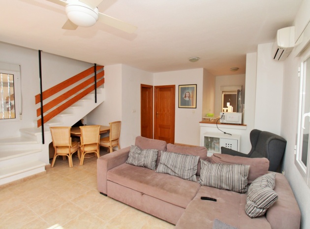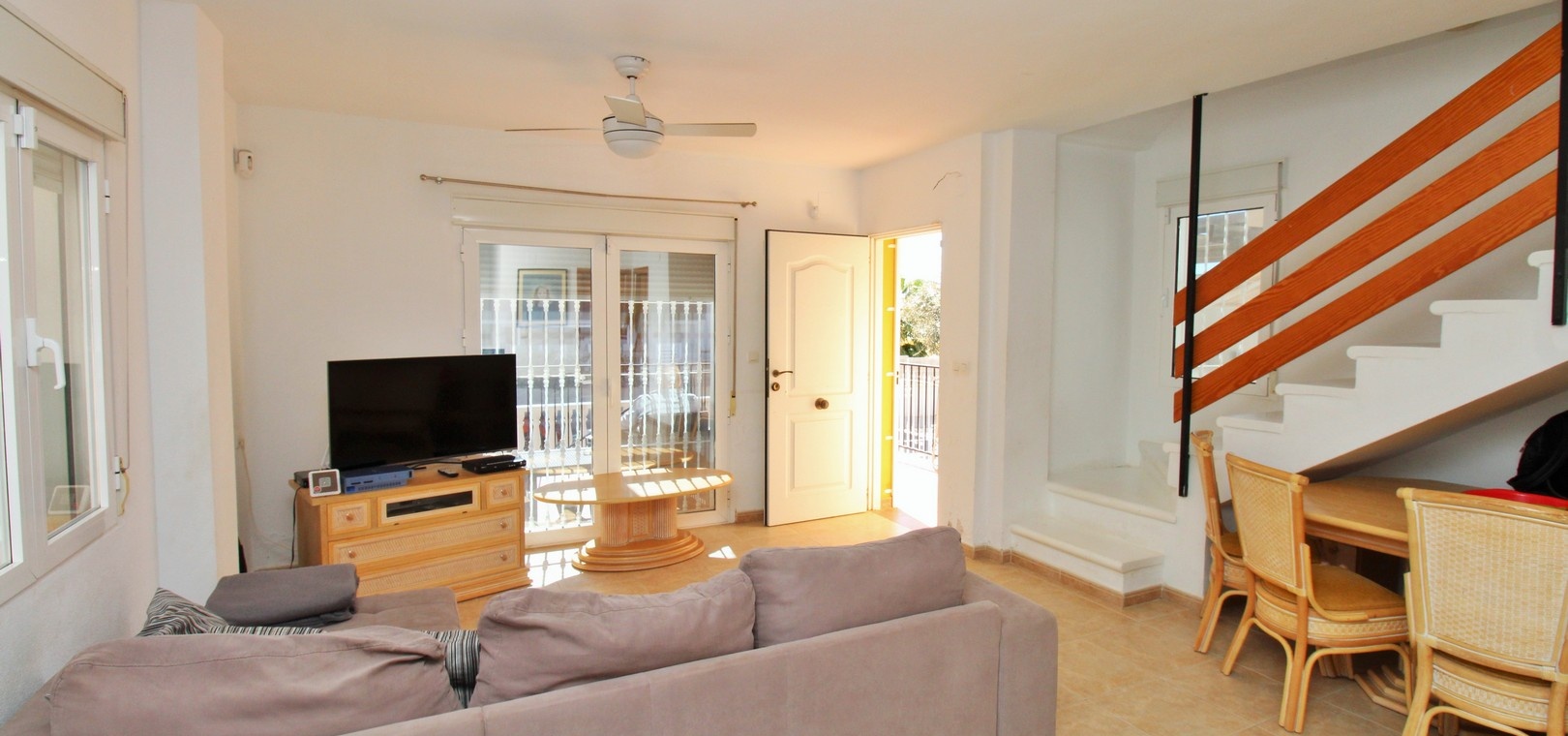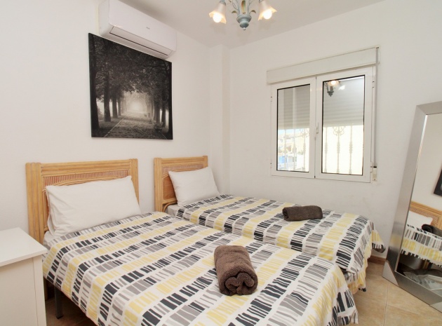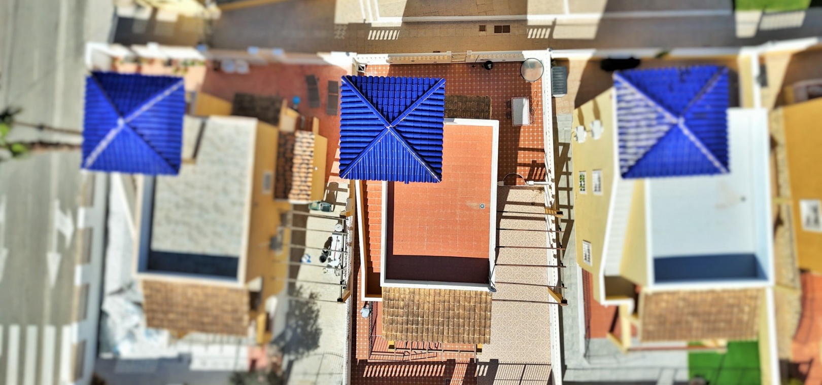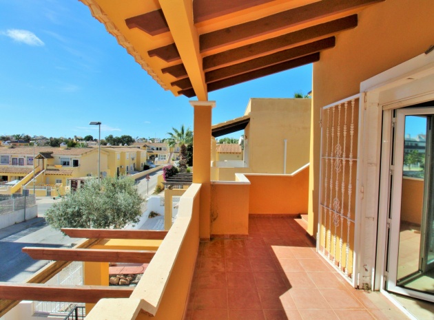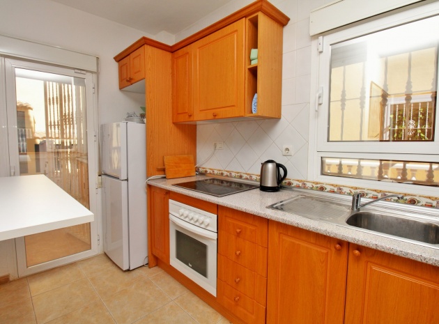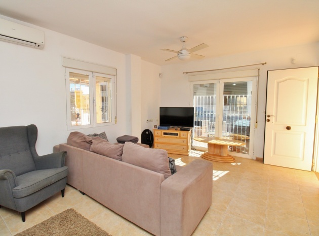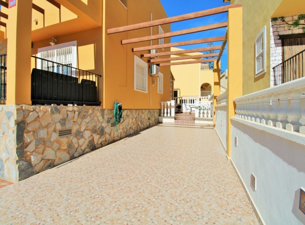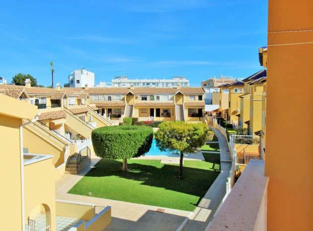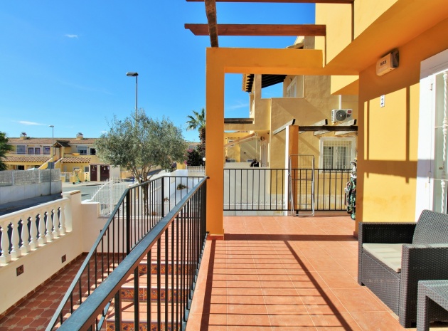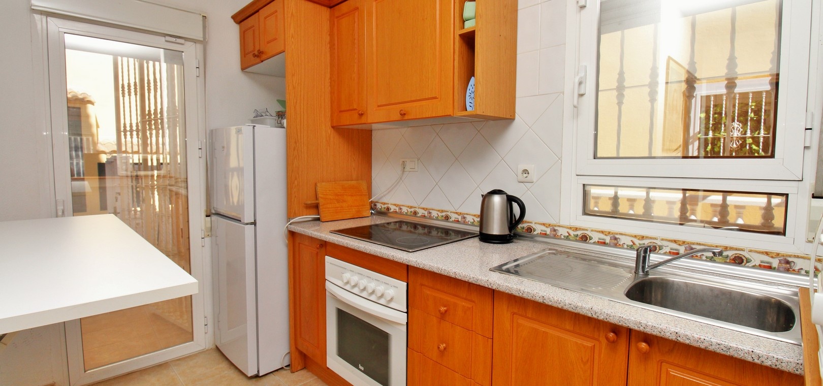 This charming South-facing, three-bedroom detached villa is nestled in the sought-after community of Lomas del Golf, Villamartin. Just a 10-minute walk from the renowned Villamartin Plaza and golf course, the property enjoys all-day sunshine and direct access to a beautifully maintained communal pool.The ground floor features a bright and airy lounge-dining area with an open-plan kitchen, a double bedroom with fitted wardrobes, and a shower room. Upstairs, you’ll find two additional bedrooms, both with fitted wardrobes, and a family bathroom. The master bedroom opens onto a covered balcony, with stairs leading up to a spacious roof solarium offering lovely views of the pool and surrounding area.Designed for outdoor living, the villa boasts a tiled garden, off-road parking, and a raised terrace. The kitchen provides direct access to the garden and communal pool, while a convenient storage/utility area is tucked beneath the terrace. The property is sold fully furnished, including white goods and air-conditioning, making it move-in ready.Whether you're looking for a full-time residence or a holiday retreat, this well-maintained villa is an excellent choice. Ideally located just a short stroll from vibrant bars, restaurants, shops, and a supermarket, it’s also a quick drive to Zenia Boulevard shopping centre, the blue flag beaches of Orihuela Costa, and prestigious golf courses like Las Ramblas, Campoamor, and Las Colinas.