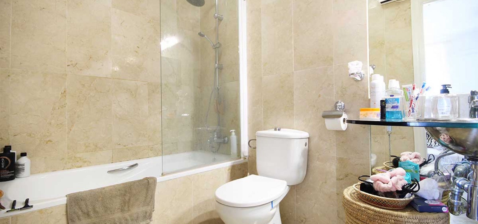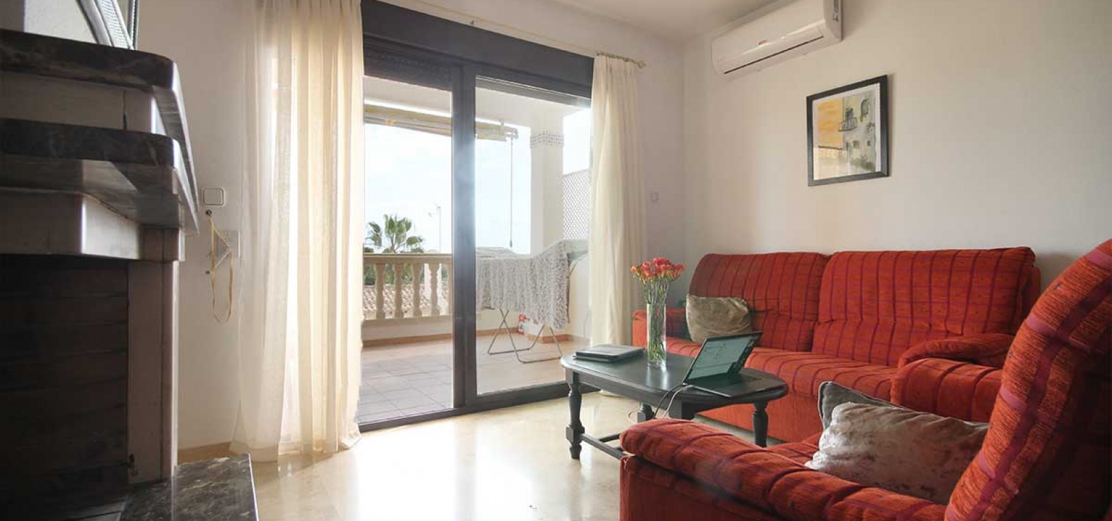 Lounge/diner with a feature fire place, hot and cold A/C & doors out to the balcony, open plan kitchen, separate utility area, 2 x double bedrooms both with fitted wardrobes, the main bedroom has an en suite bathroom, 1 x shower room, underground parking, lift, access to a communal swimming pool & much more.