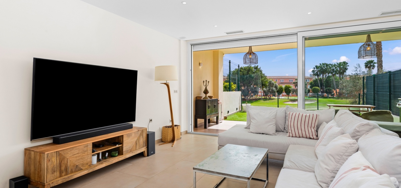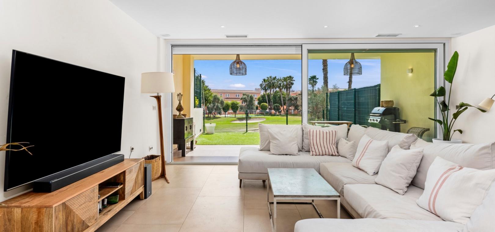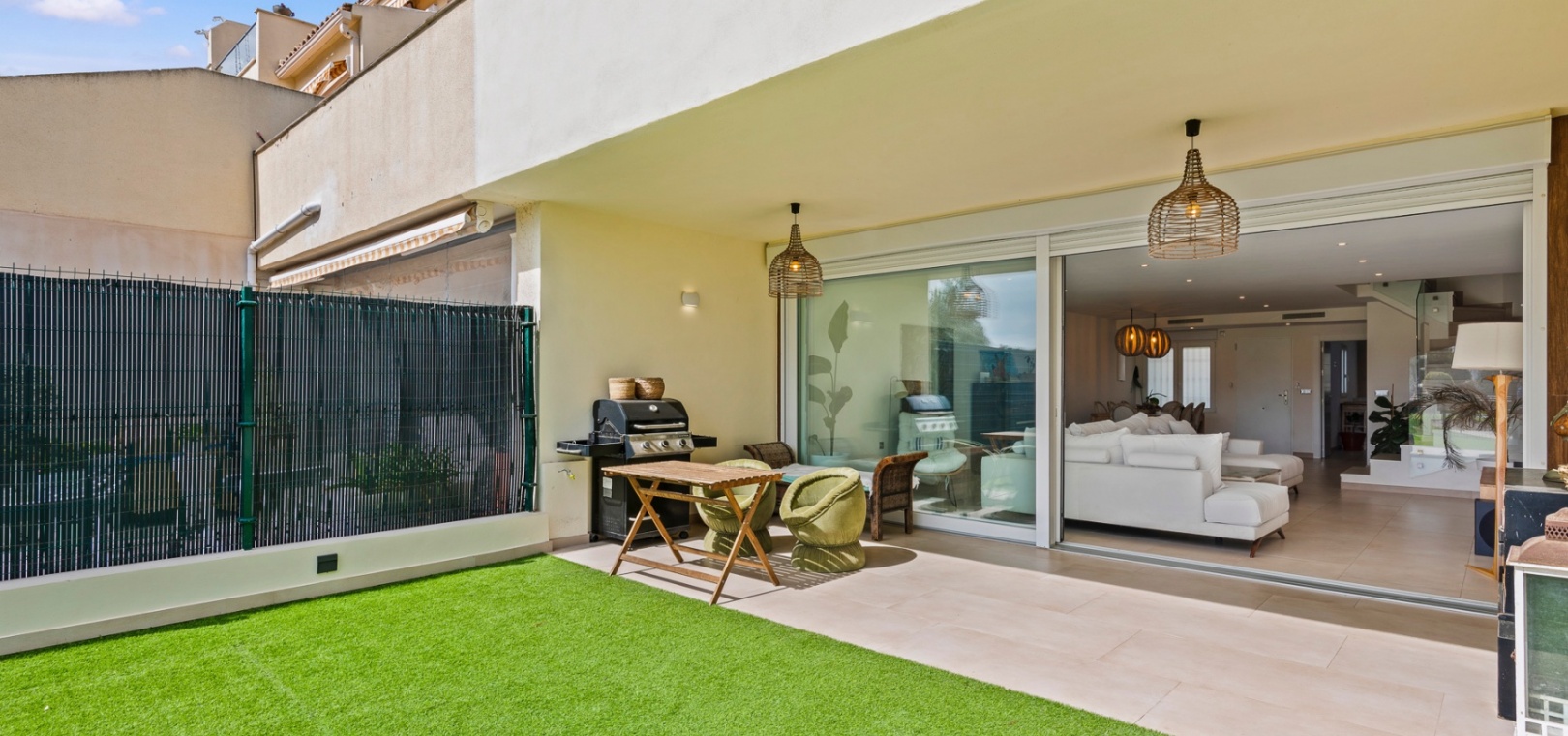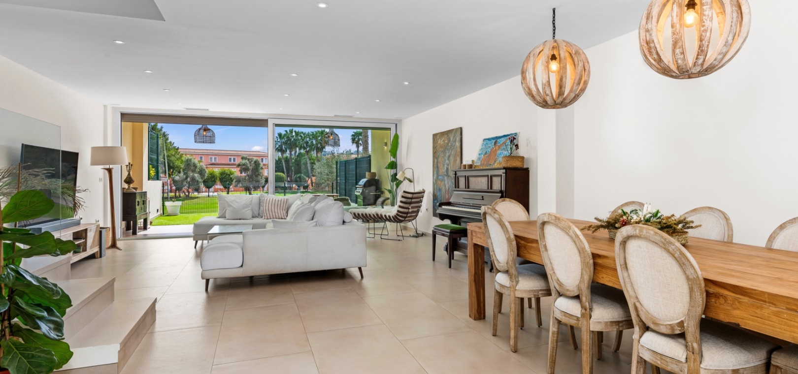 The main floor features a bright and open-plan living and dining area that extends onto a covered terrace and private garden, creating a seamless indoor-outdoor flow. The modern kitchen is designed for practicality, and this level also includes a guest bathroom.