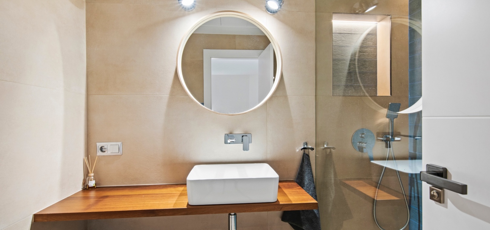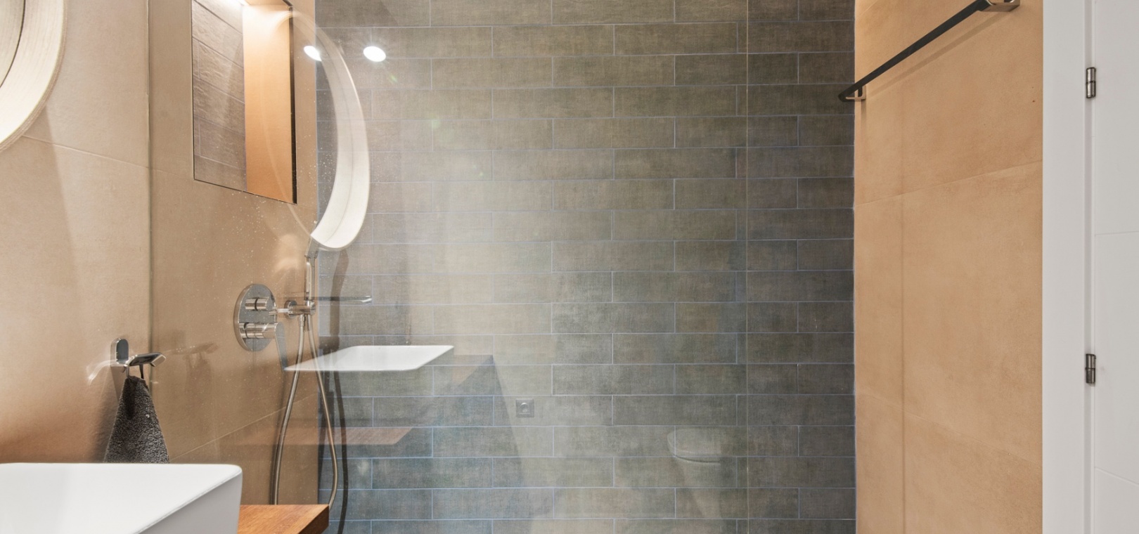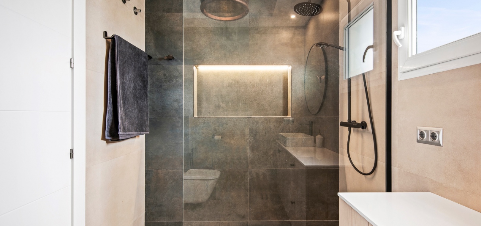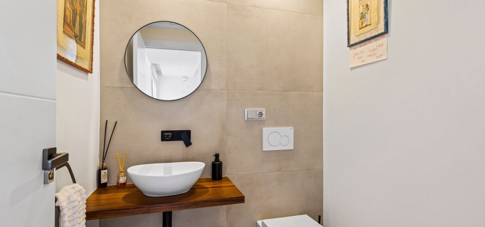 The main floor features a bright and open-plan living and dining area that extends onto a covered terrace and private garden, creating a seamless indoor-outdoor flow. The modern kitchen is designed for practicality, and this level also includes a guest bathroom.