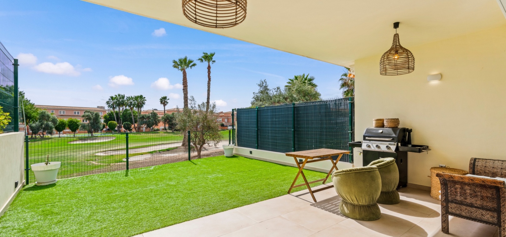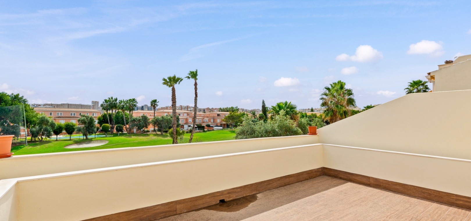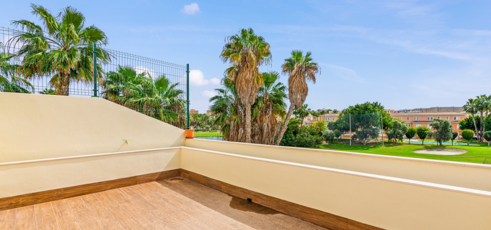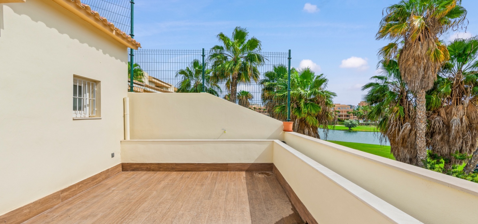 Upstairs, the home offers three well-sized bedrooms, including a primary suite with a private terrace, a spacious walk-in closet, and an en-suite bathroom. Built-in wardrobes provide additional storage, and the solarium offers a perfect space to relax while enjoying green zone views.