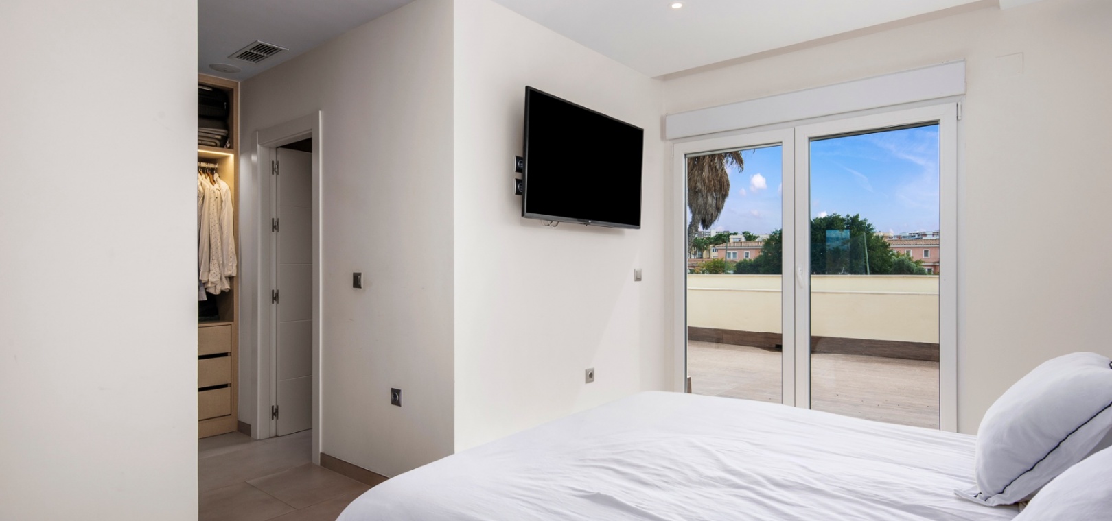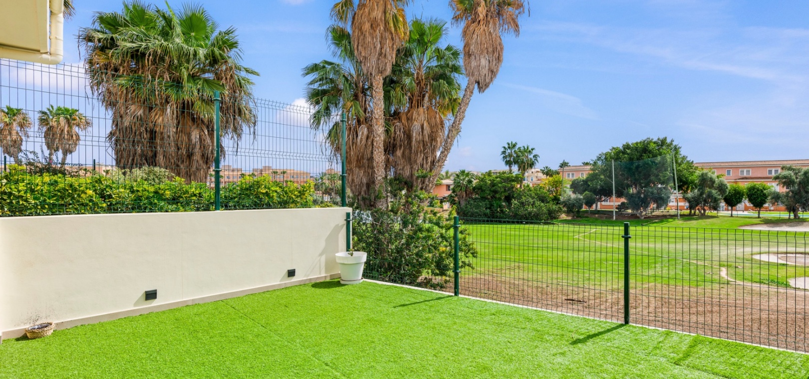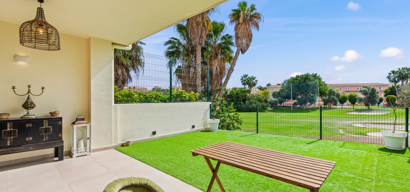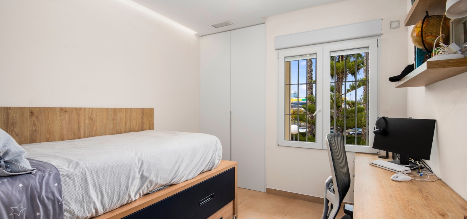 Upstairs, the home offers three well-sized bedrooms, including a primary suite with a private terrace, a spacious walk-in closet, and an en-suite bathroom. Built-in wardrobes provide additional storage, and the solarium offers a perfect space to relax while enjoying green zone views.