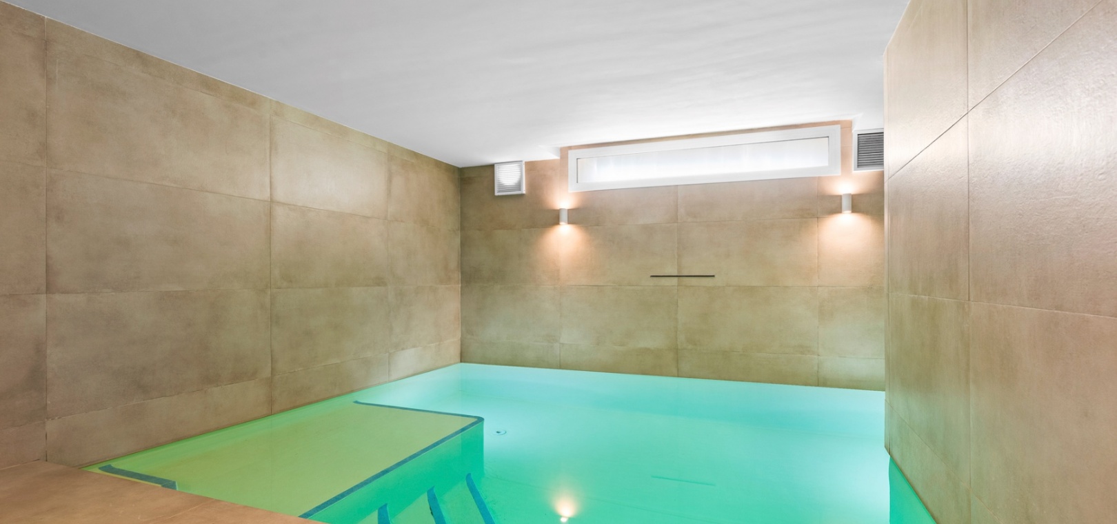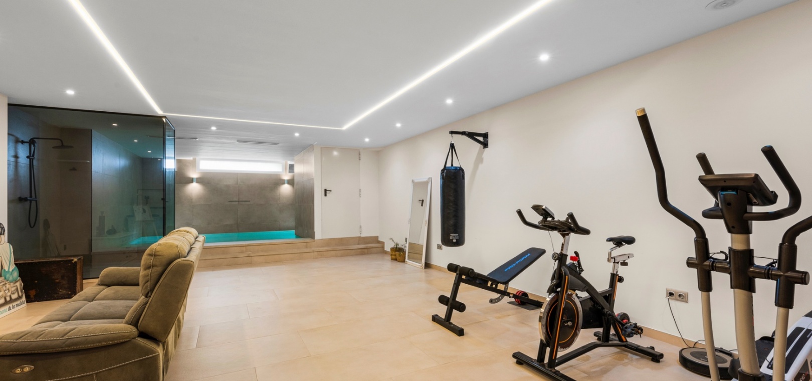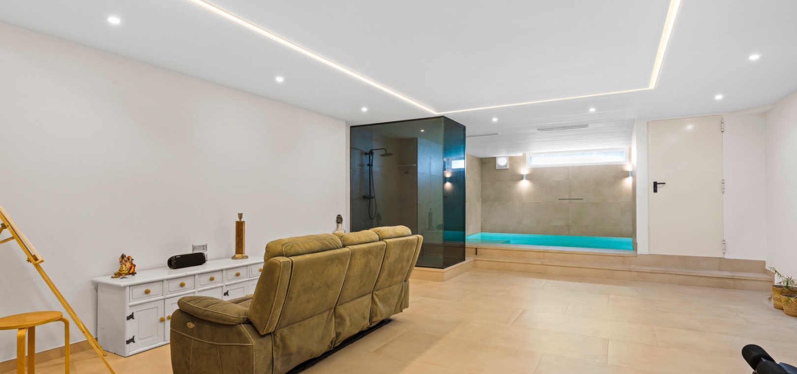 The lower level includes a private garage, a storage room, and a large recreation area, suitable for various uses such as a home gym or entertainment space. The lower level also features a private indoor pool. The property also benefits from access to communal amenities, including a swimming pool, beautifully maintained gardens, and a jacuzzi.
