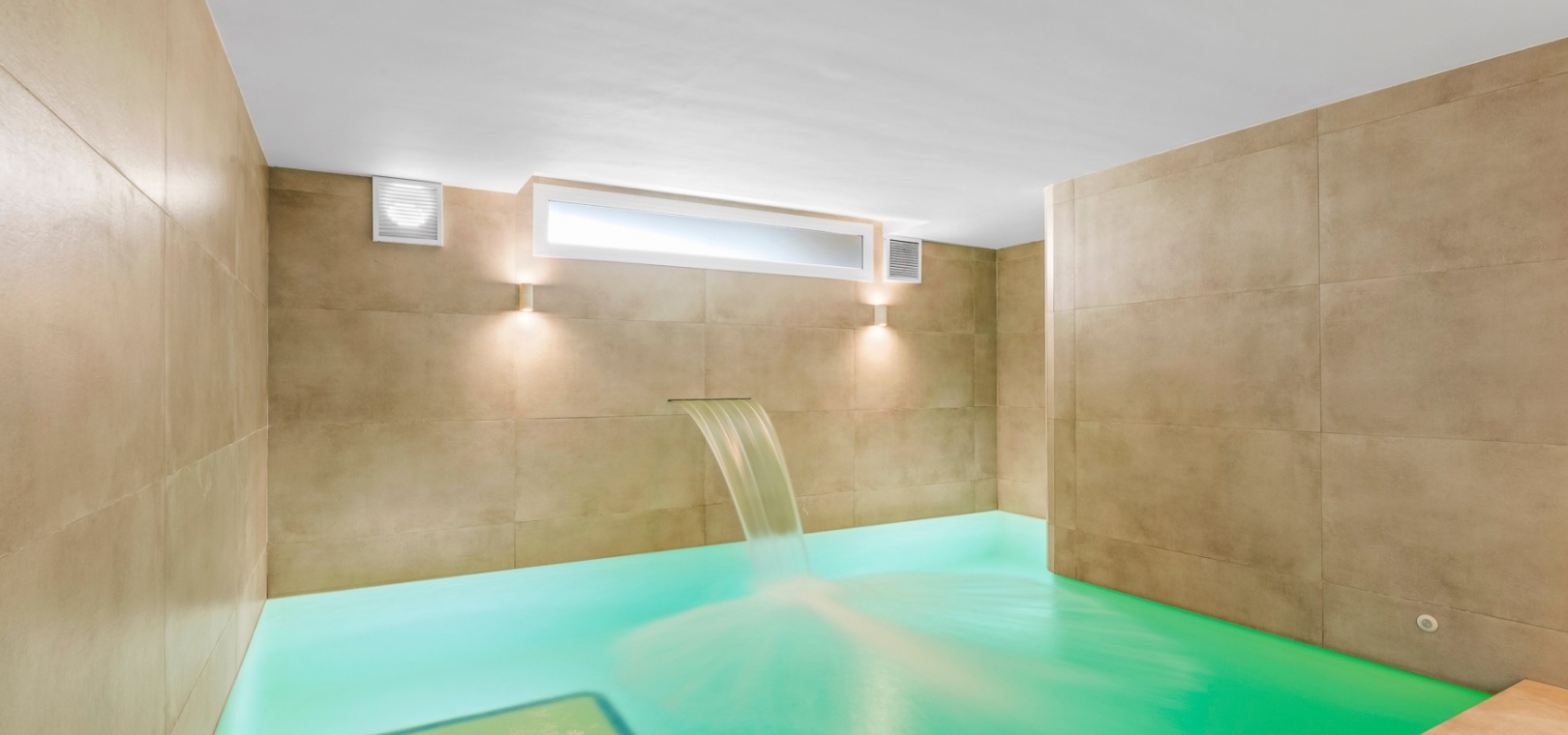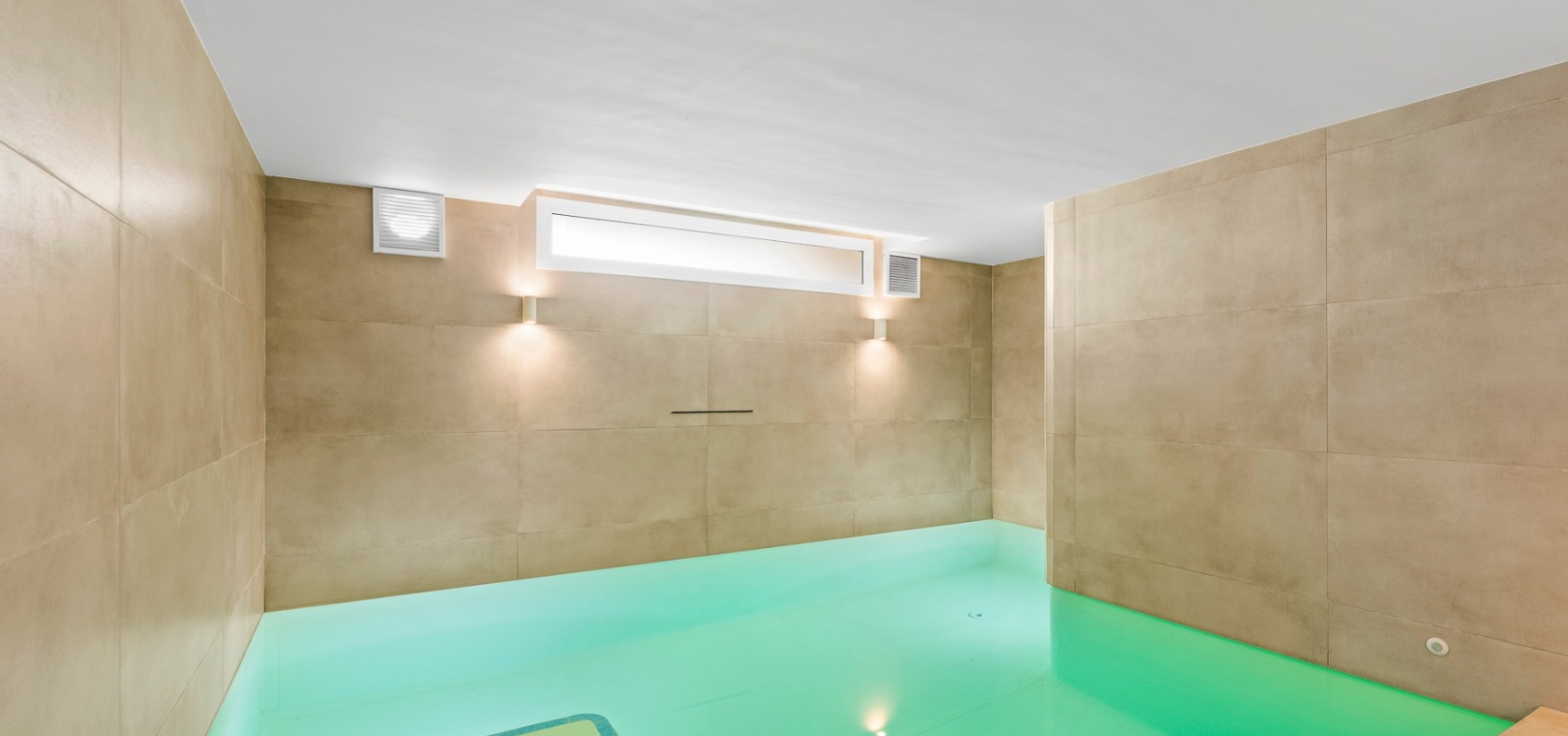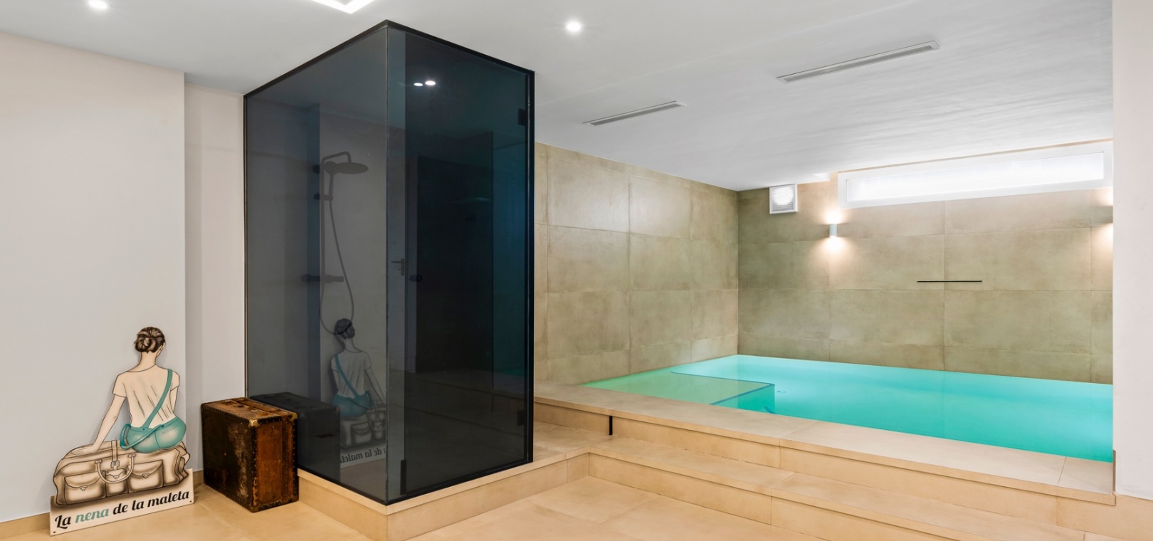 The lower level includes a private garage, a storage room, and a large recreation area, suitable for various uses such as a home gym or entertainment space. The lower level also features a private indoor pool. The property also benefits from access to communal amenities, including a swimming pool, beautifully maintained gardens, and a jacuzzi.