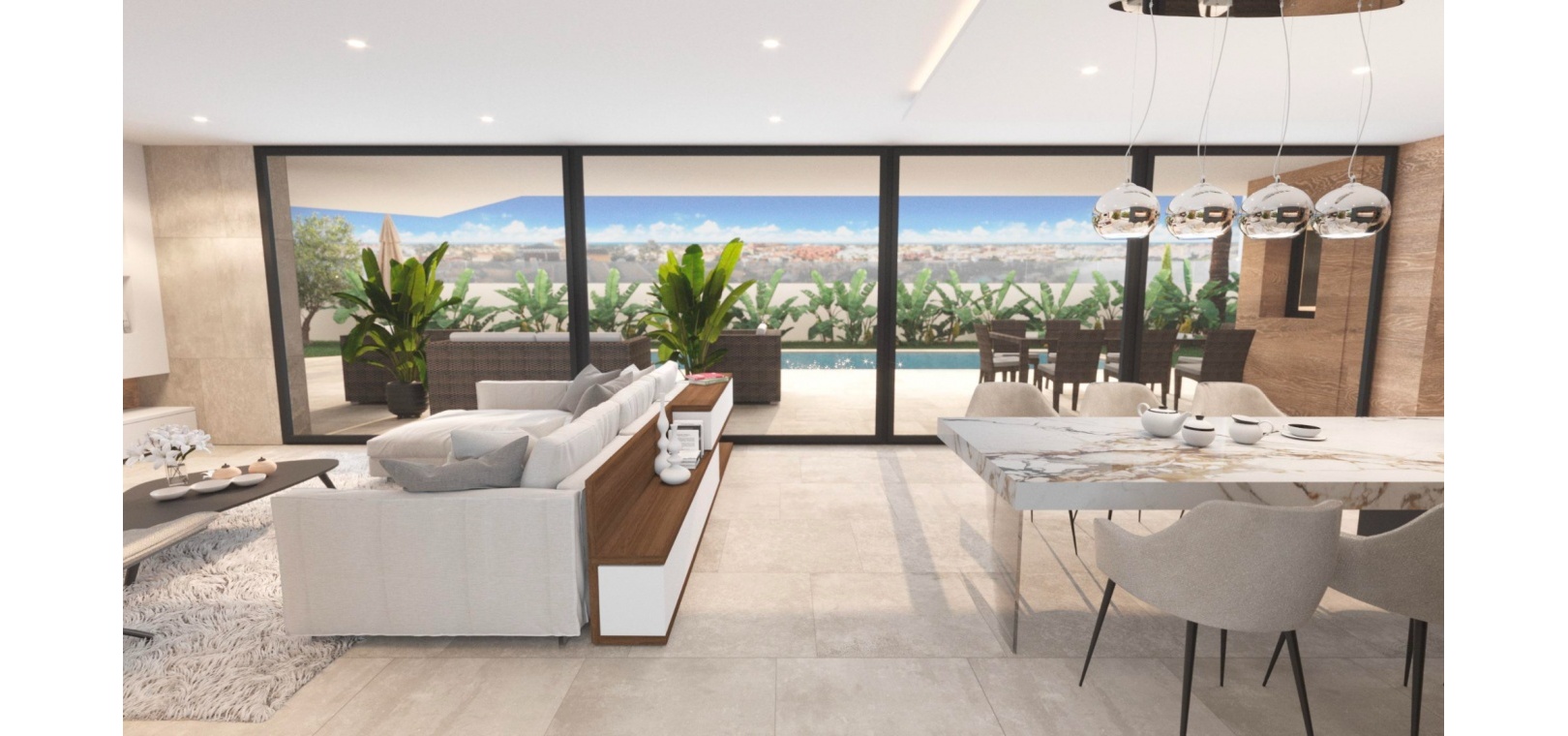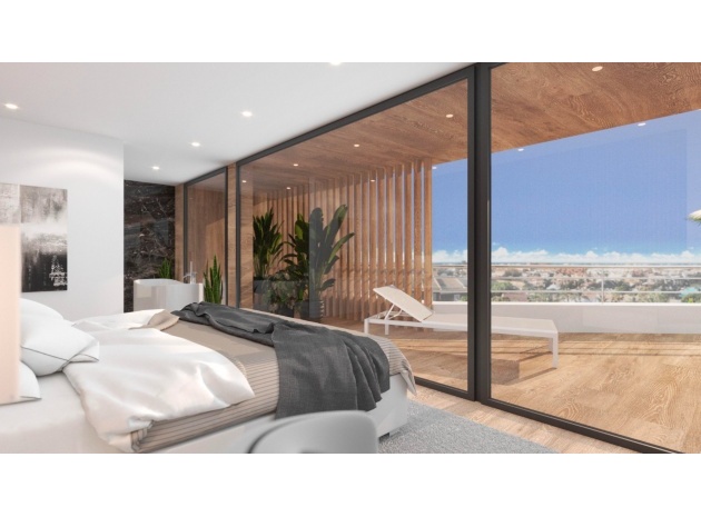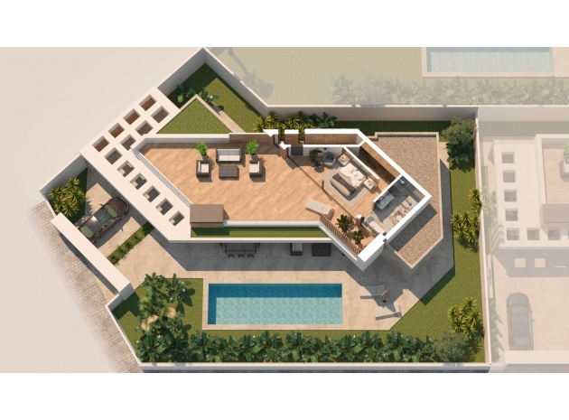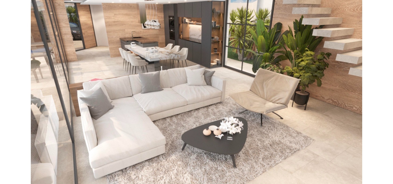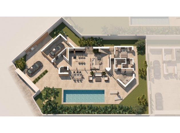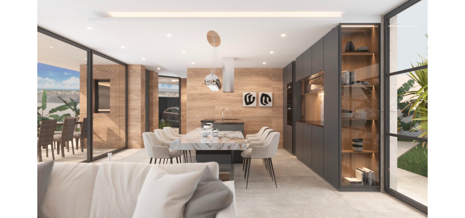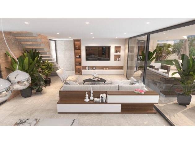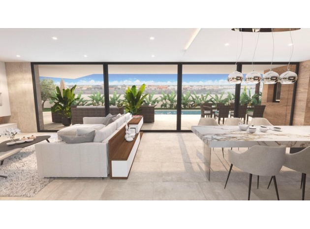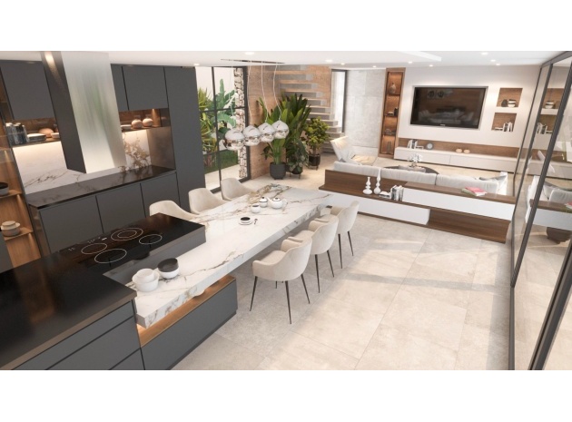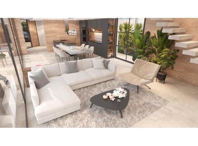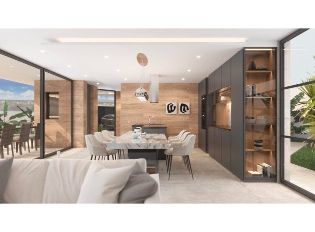Built with top-quality materials, this villa is equipped with state-of-the-art smart home technology (Domótica), underfloor heating, and integrated air conditioning throughout, ensuring comfort in every season. The open-plan living area seamlessly integrates a designer kitchen with a stylish island and attached dining table, making it the perfect space for entertaining.
