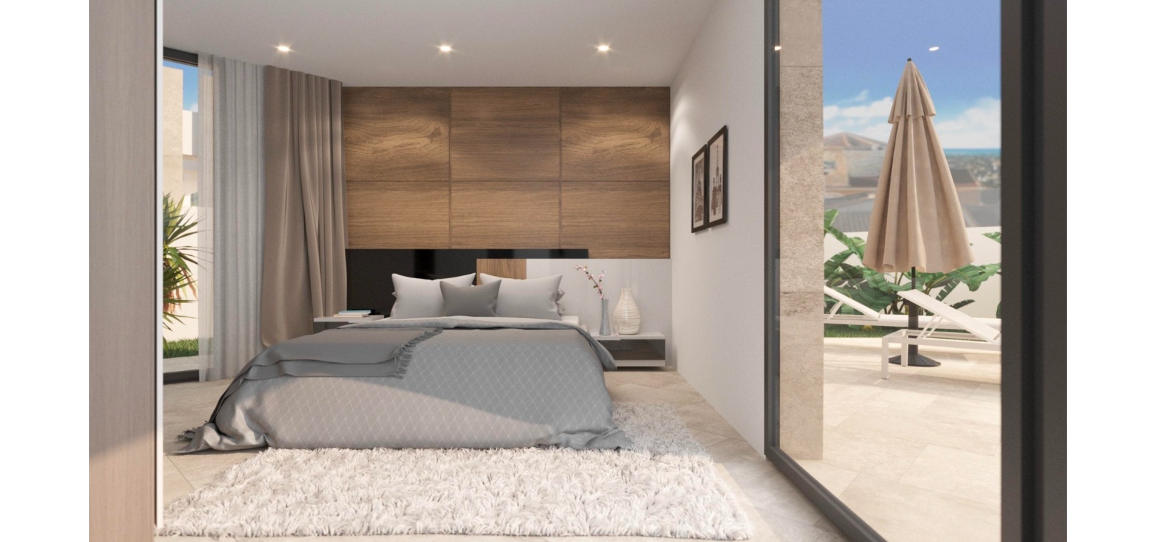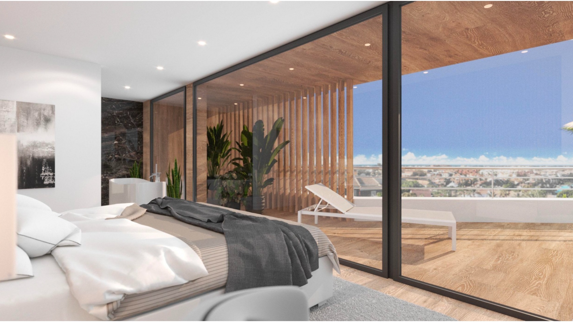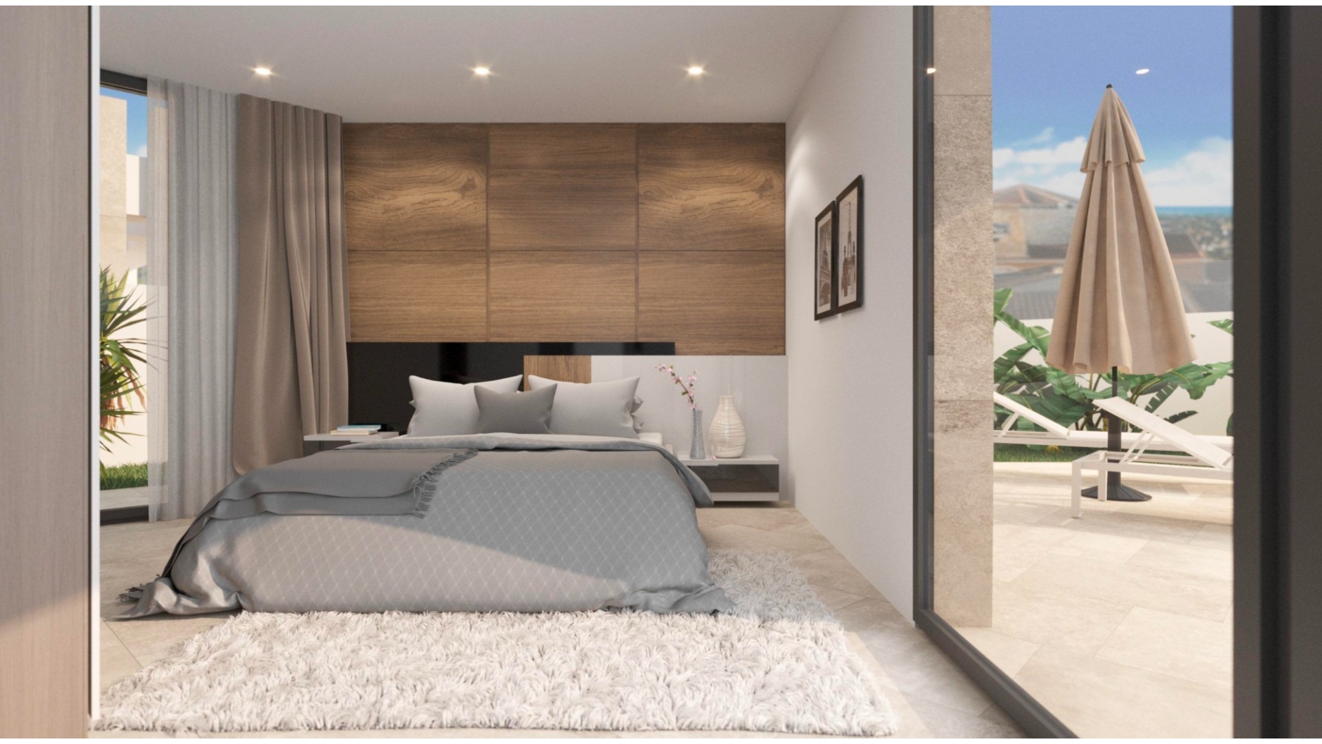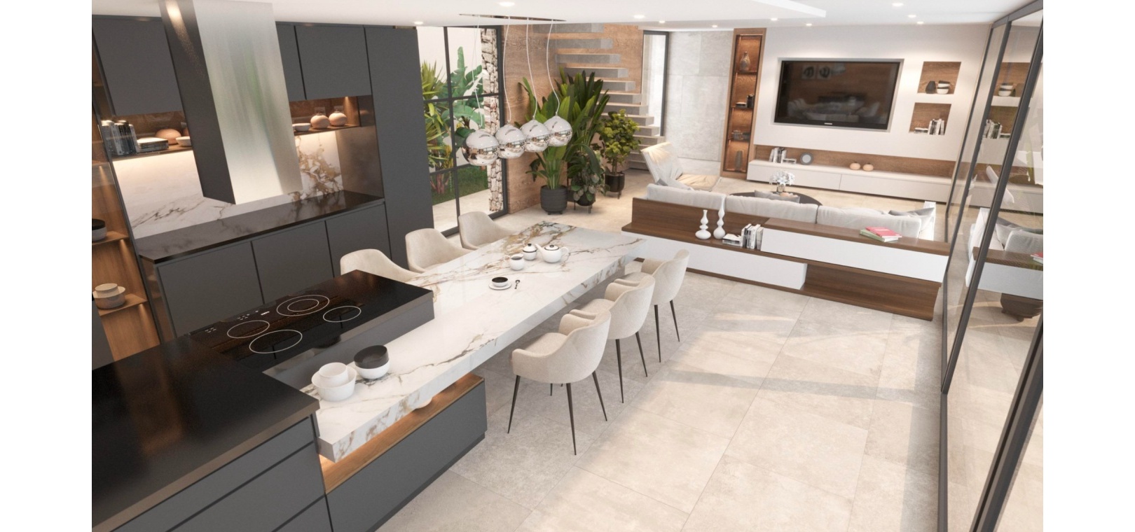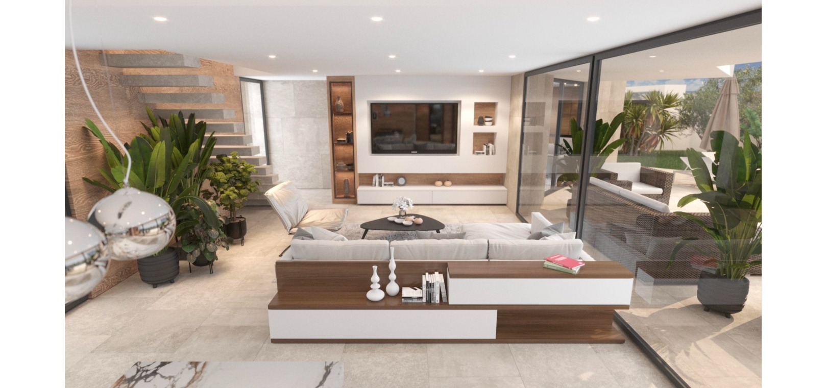 Built with top-quality materials, this villa is equipped with state-of-the-art smart home technology (Domótica), underfloor heating, and integrated air conditioning throughout, ensuring comfort in every season. The open-plan living area seamlessly integrates a designer kitchen with a stylish island and attached dining table, making it the perfect space for entertaining.