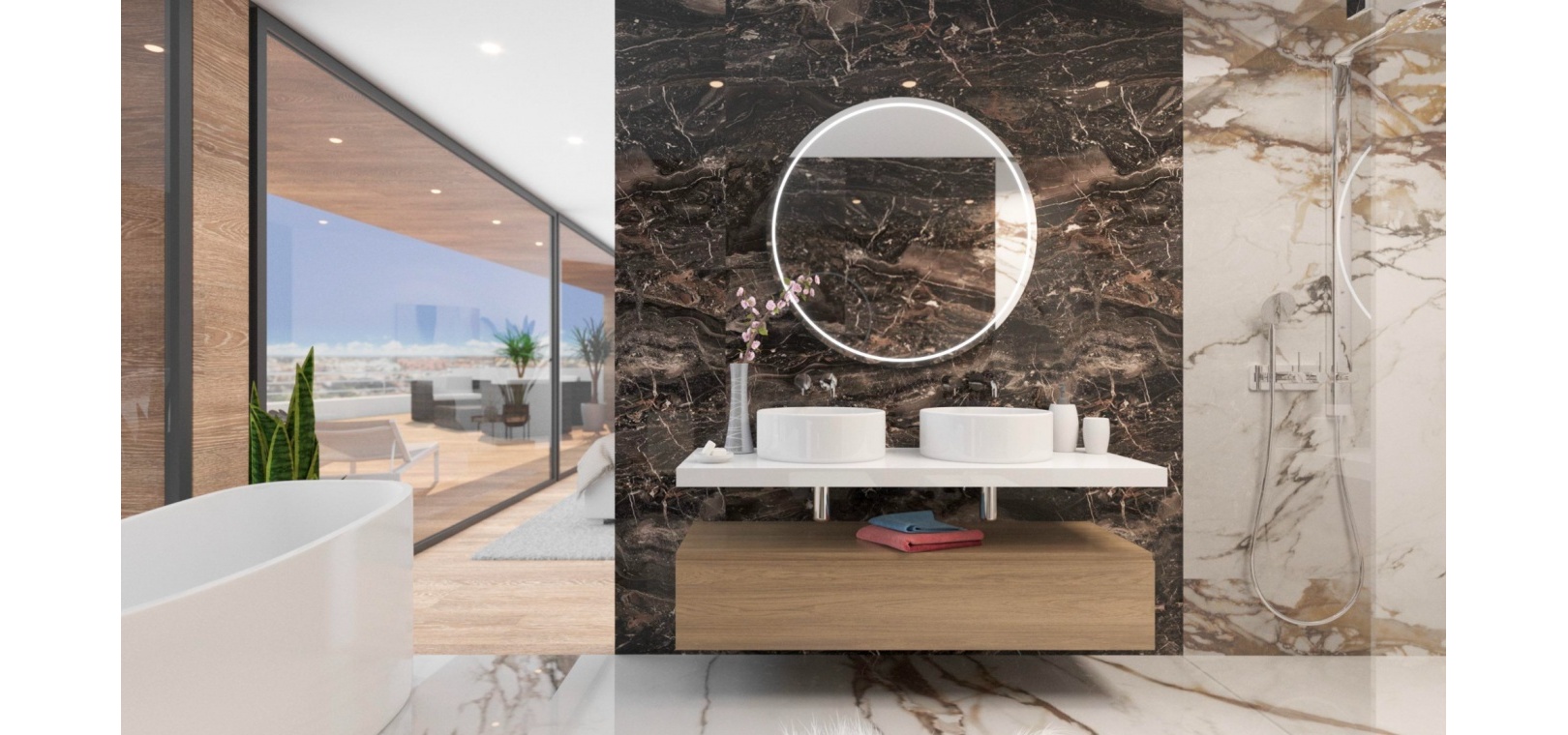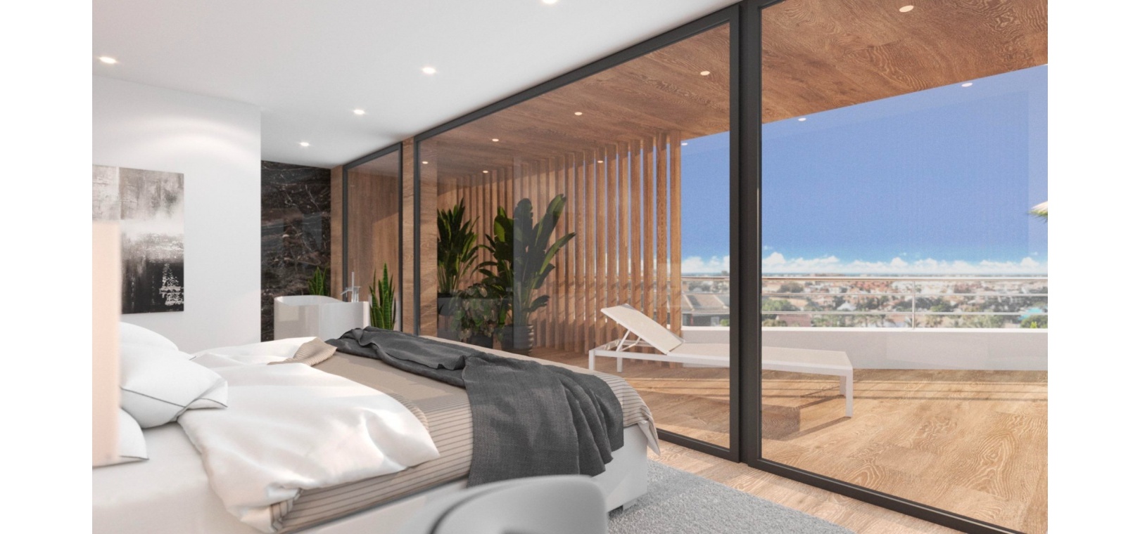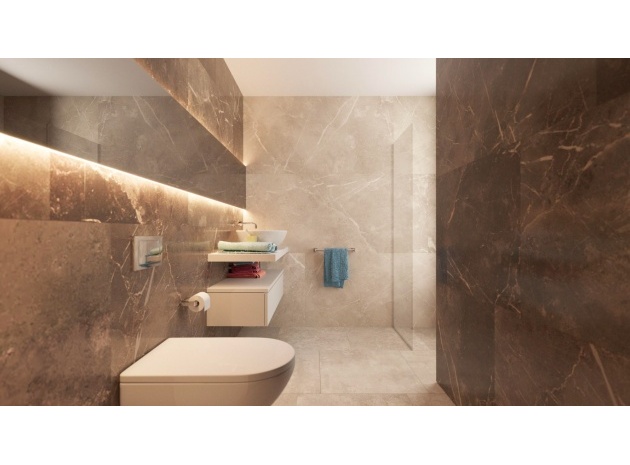 On the ground floor, two spacious double bedrooms come with their own en-suite bathrooms, while the upper level is dedicated to the impressive master suite, complete with a walk-in wardrobe and access to a large solarium, ideal for relaxation and enjoying the surroundings.