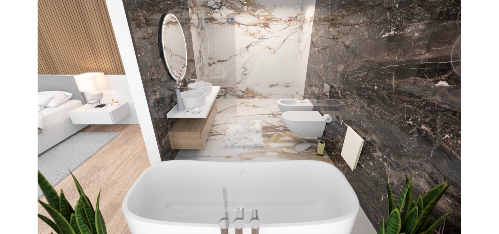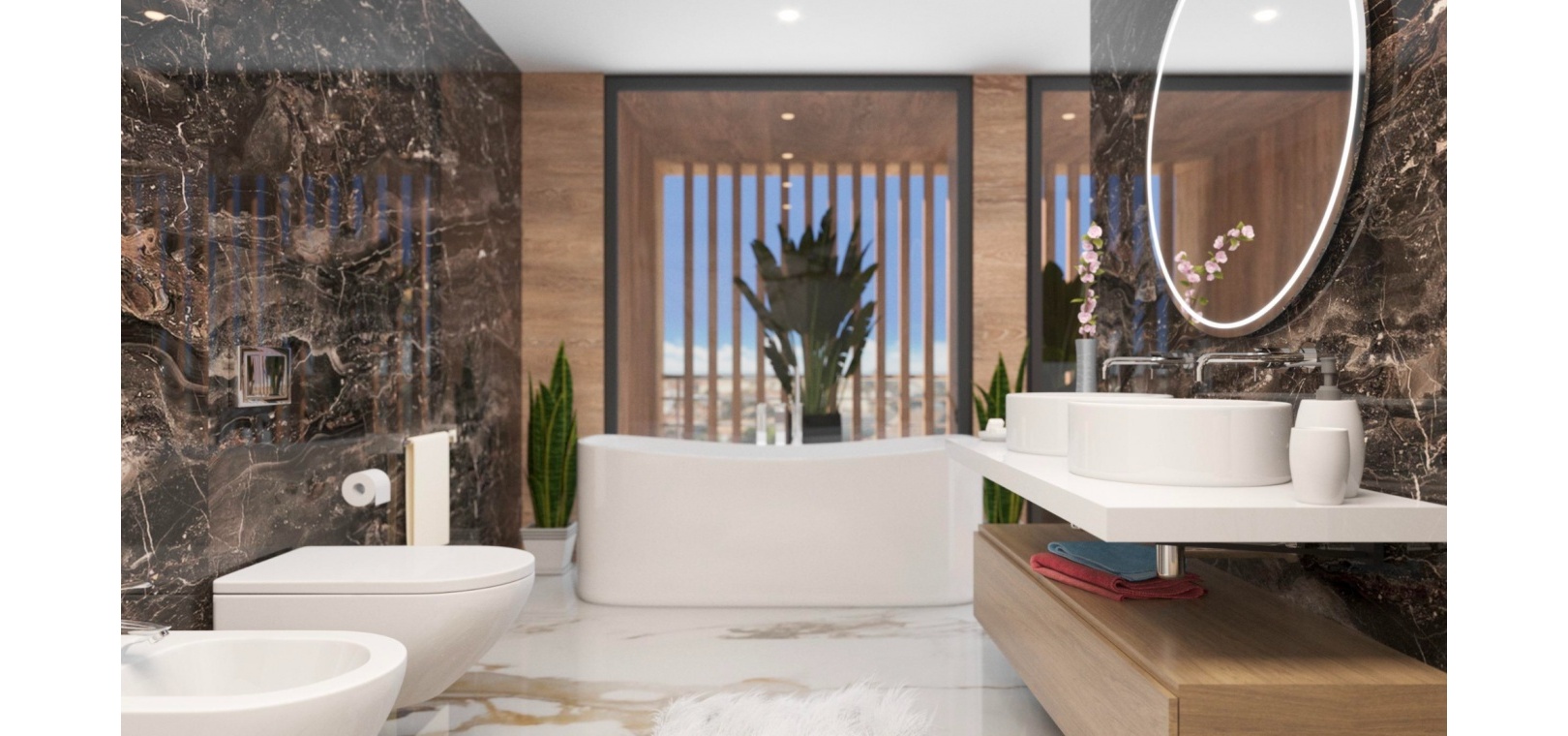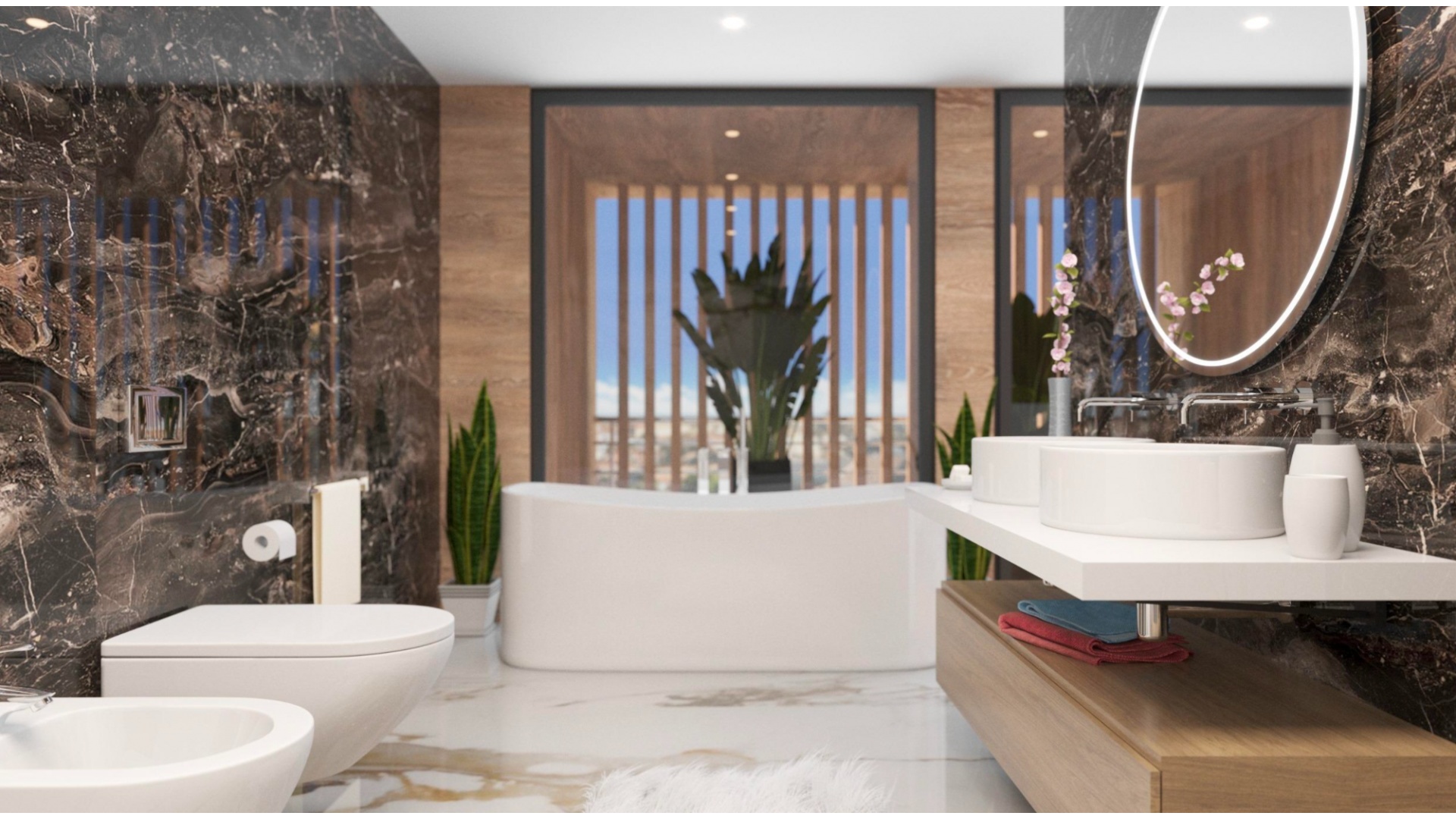 On the ground floor, two spacious double bedrooms come with their own en-suite bathrooms, while the upper level is dedicated to the impressive master suite, complete with a walk-in wardrobe and access to a large solarium, ideal for relaxation and enjoying the surroundings.