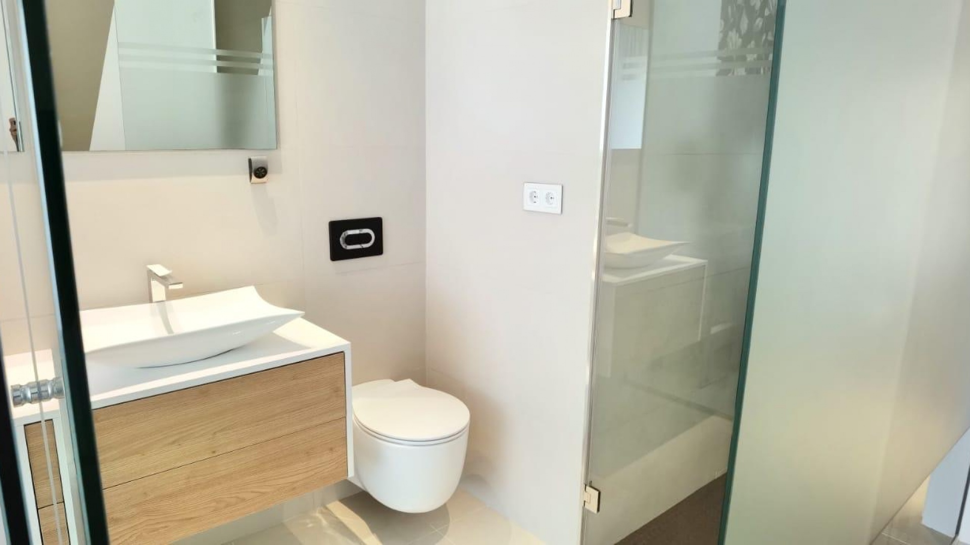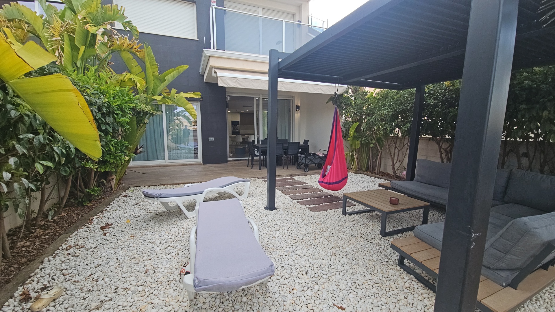 Ground-floor apartment of 89m² with a contemporary design. The property features a living-dining area, open-plan kitchen, 3 bedrooms, and 2 bathrooms, one of them en-suite. It boasts a spacious 57m² terrace with a barbecue and pergola.