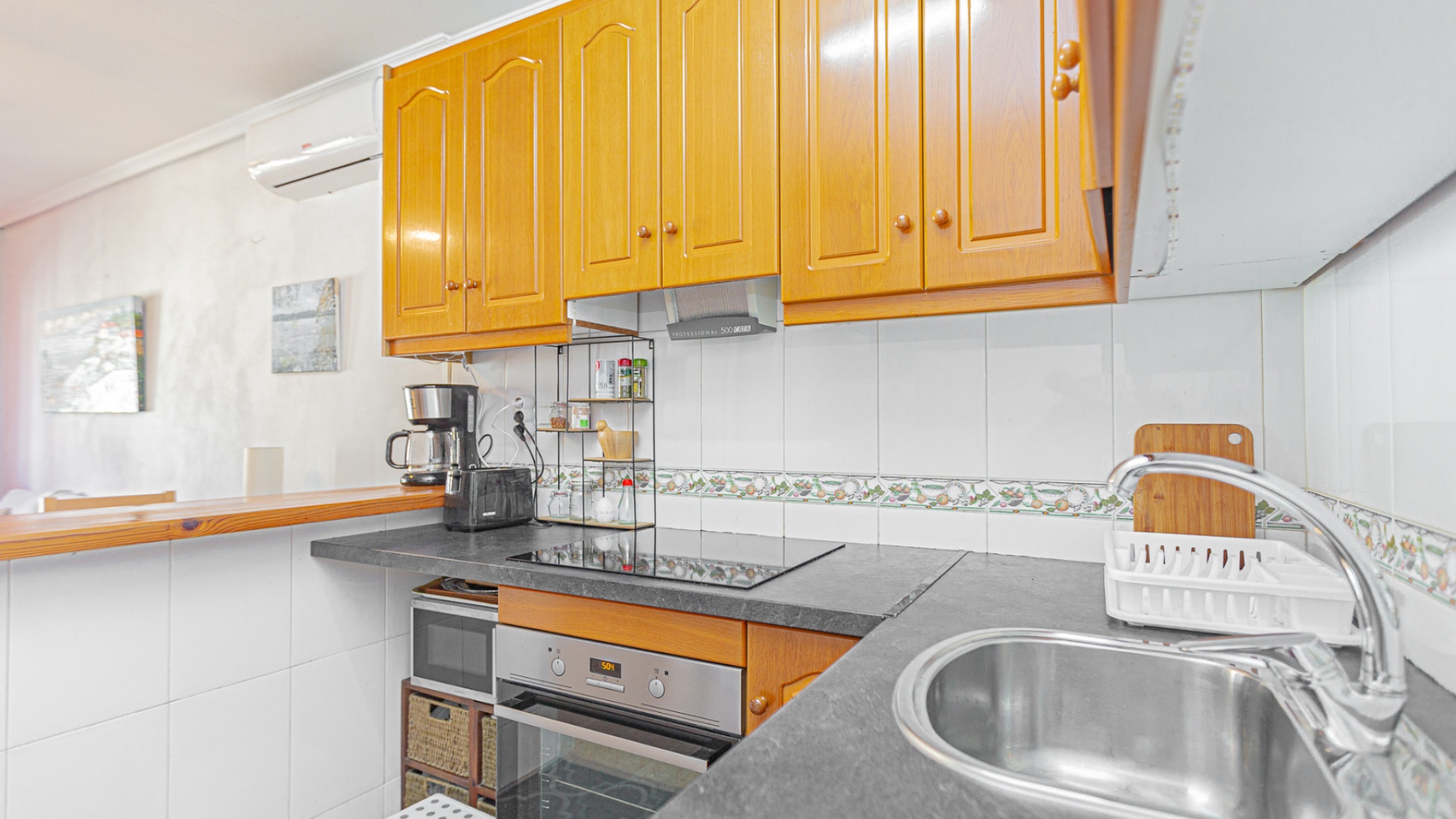 The current owner has made several recent improvements, including repainting the solarium, replacing the floor tiles, upgrading the kitchen worktop, and installing nearly new furniture and a water heater in excellent condition.