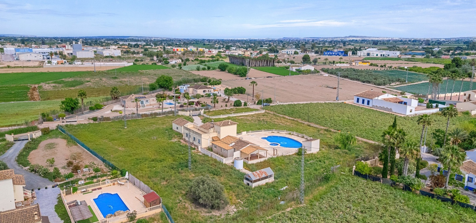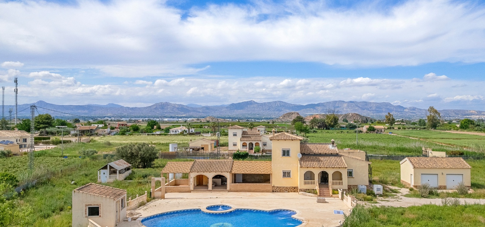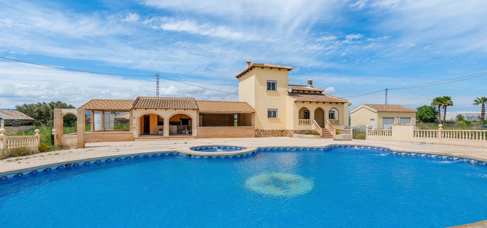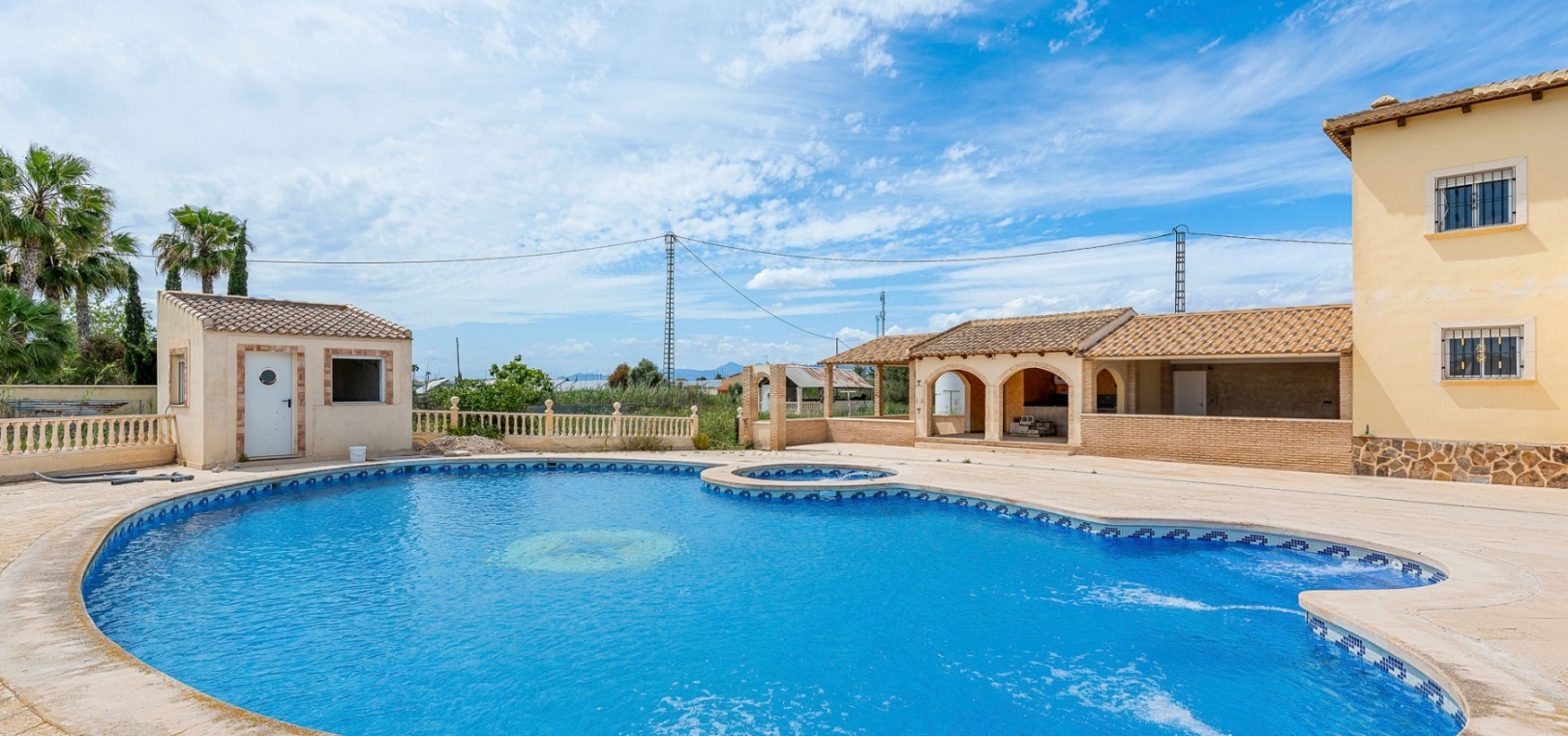 This detached property, set on a spacious 10,014 m² plot in the municipality of Callosa de Segura, offers approximately 225 m² of built area with a layout designed for comfort and outdoor living. The main house includes five bedrooms and four bathrooms, distributed between the ground floor and an upper level. The upstairs features a bedroom with an en-suite bathroom and access to a private solarium terrace with open views.