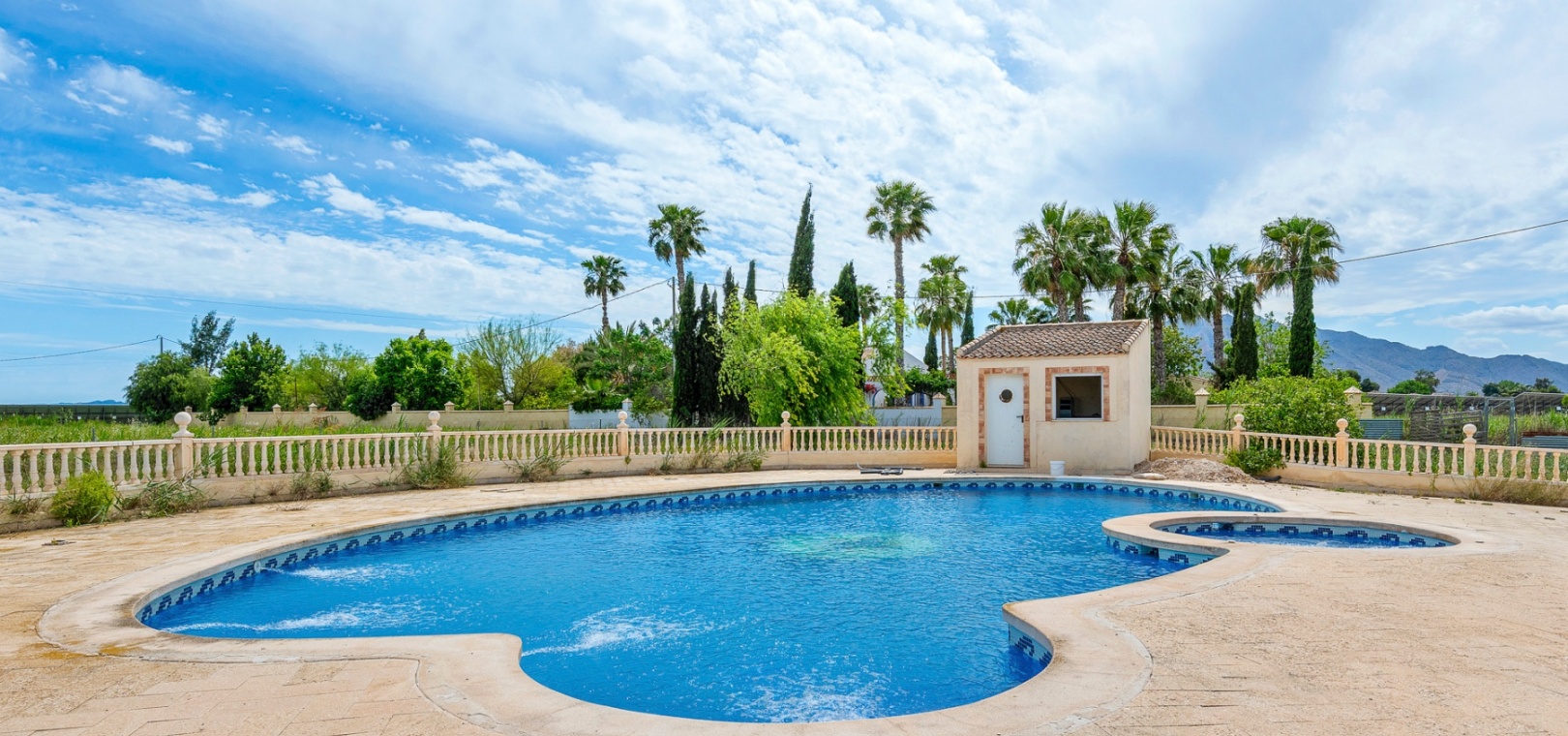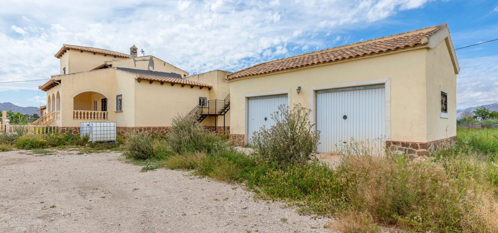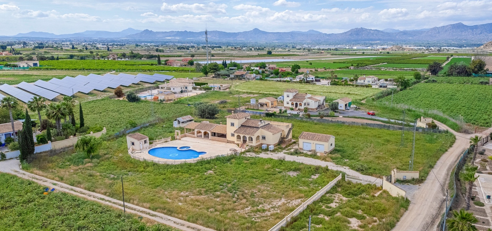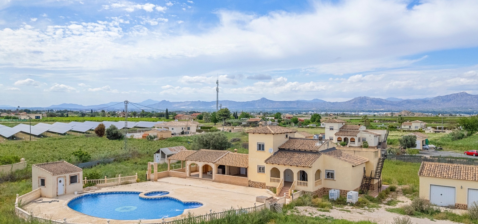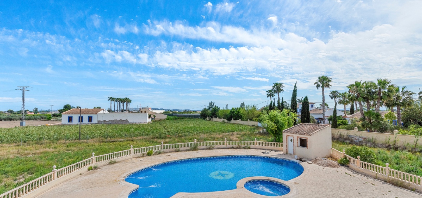 This detached property, set on a spacious 10,014 m² plot in the municipality of Callosa de Segura, offers approximately 225 m² of built area with a layout designed for comfort and outdoor living. The main house includes five bedrooms and four bathrooms, distributed between the ground floor and an upper level. The upstairs features a bedroom with an en-suite bathroom and access to a private solarium terrace with open views.