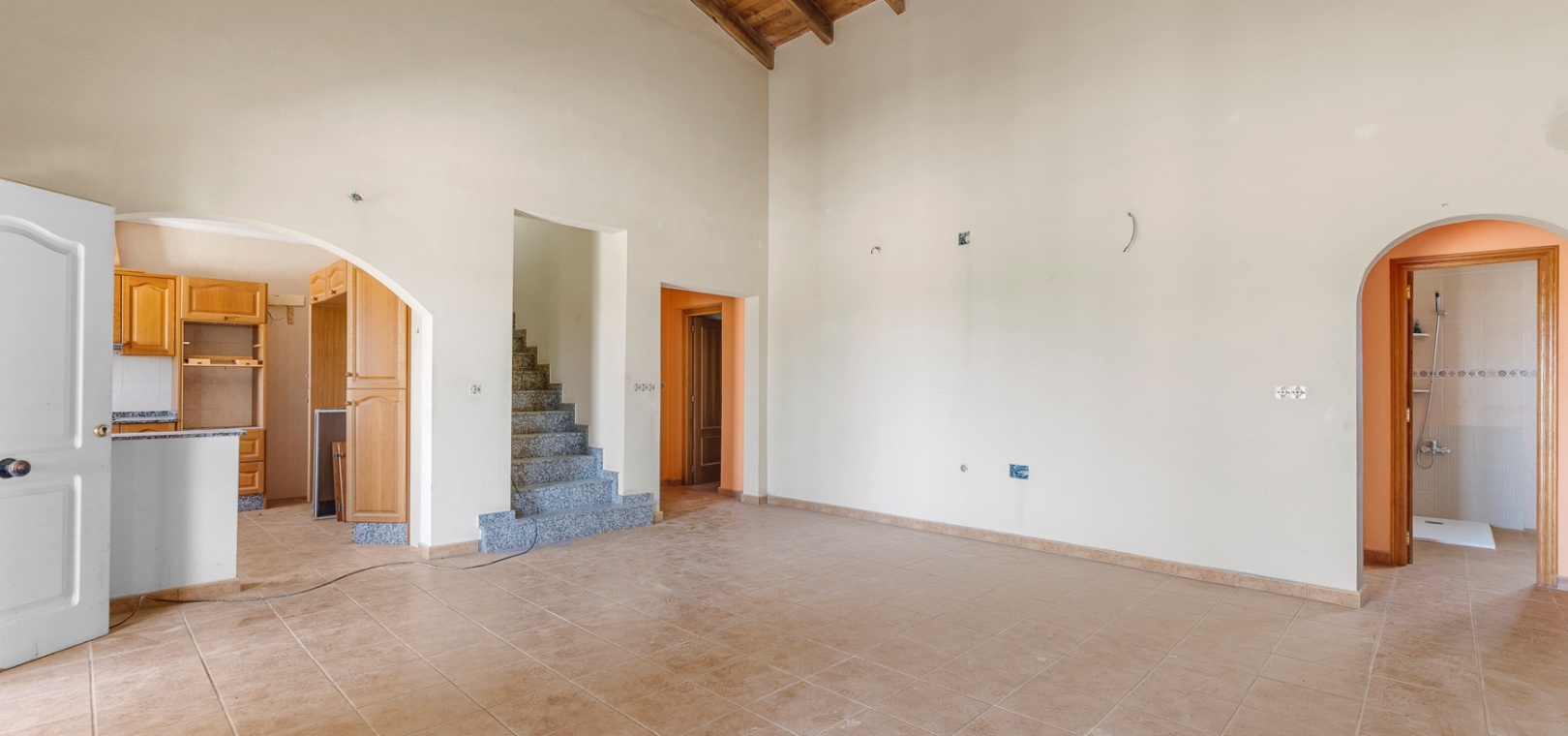 On the ground floor, the heart of the home is a large living-dining room with double-height ceilings and pitched roof structure, creating a bright and open atmosphere. From here, you can access various rooms, including a practical kitchen that opens directly to a covered patio—perfect for outdoor dining near the summer kitchen and barbecue area.