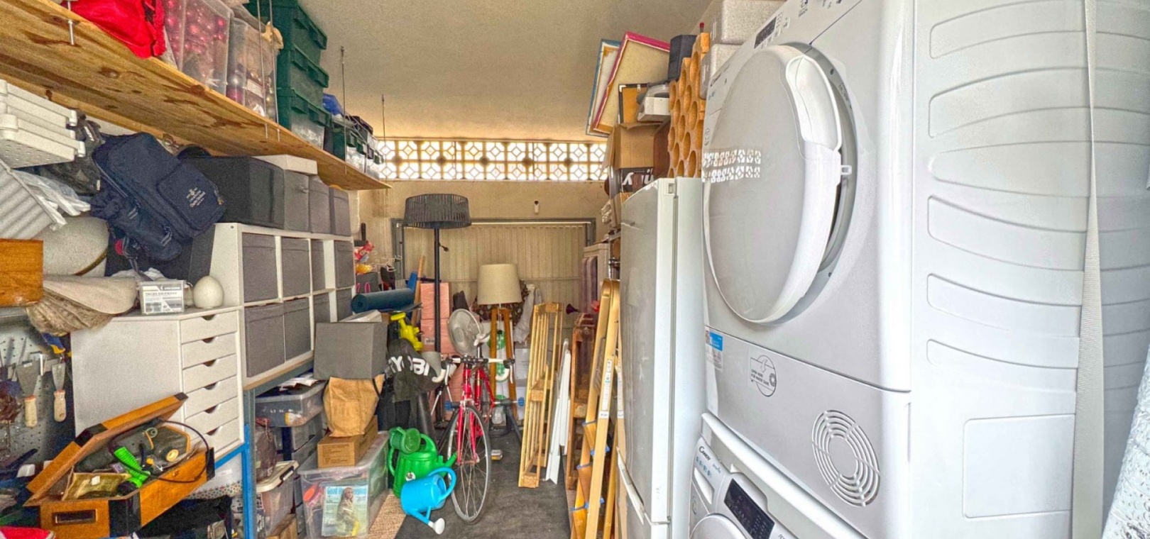 The large private garage not only houses your car but also doubles as a functional utility space with laundry area, dryer, and a new boiler — combining convenience and storage in one.