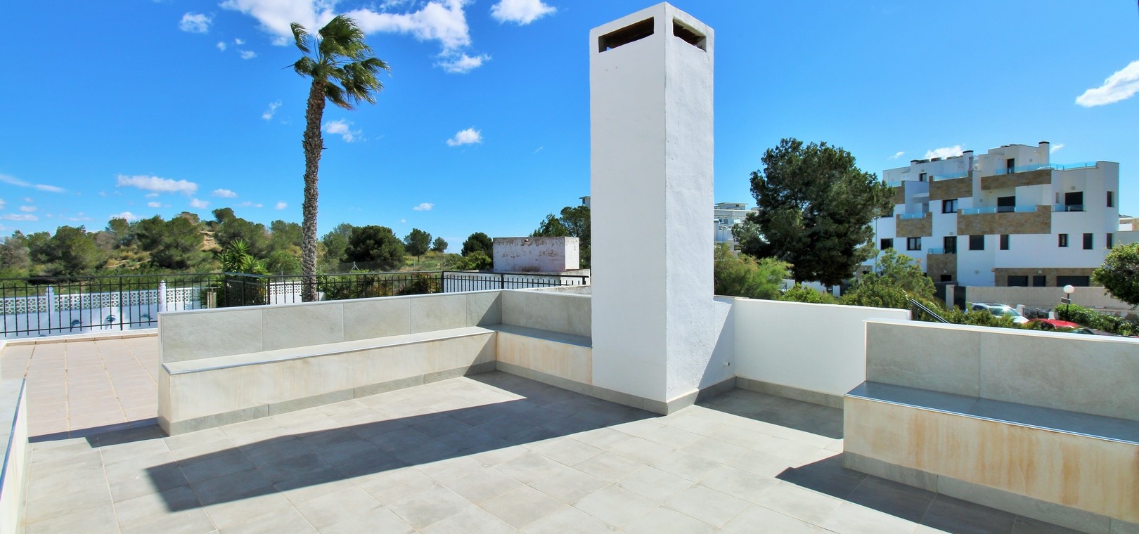 Set on a generous 432m2 plot, this characterful semi-detached villa enjoys excellent outdoor space, including a private pool with surrounding terrace, rooftop solarium, and a private garage with separate storage room.Inside, the accommodation is arranged over one level. An entrance hallway leads into a bright lounge and dining area, complete with feature fireplace, and a separate fitted kitchen. A small hallway connects two double bedrooms with built-in wardrobes, a family bathroom, and a second bathroom with walk-in shower and utility area. There is a second living area just off the main lounge, which could be converted into a third bedroom if desired. The property benefits from air conditioning and gas-oil central heating and is offered furnished, including white goods.Homes offering this amount of outdoor space in Lomas del Golf, and the wider Orihuela Costa are increasingly difficult to come by. Quietly situated yet just a short walk to the renowned Villamartin Plaza and golf course, and only an 8-minute drive to the beaches and Zenia Boulevard.Early viewing is recommended.