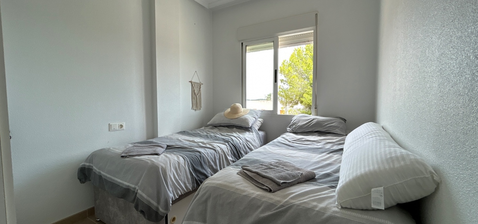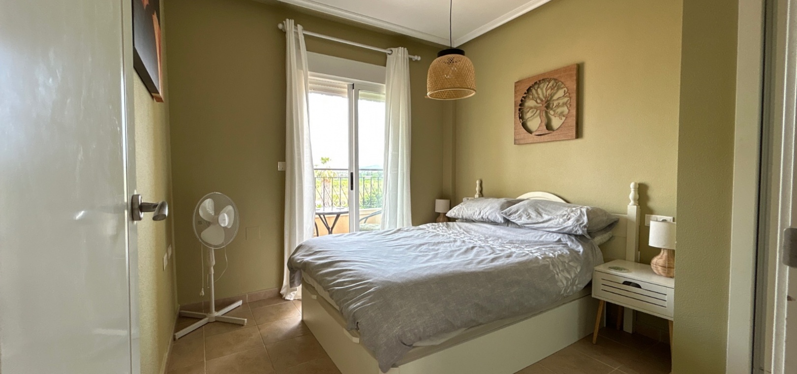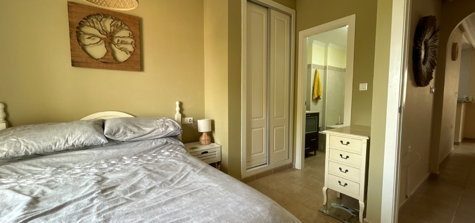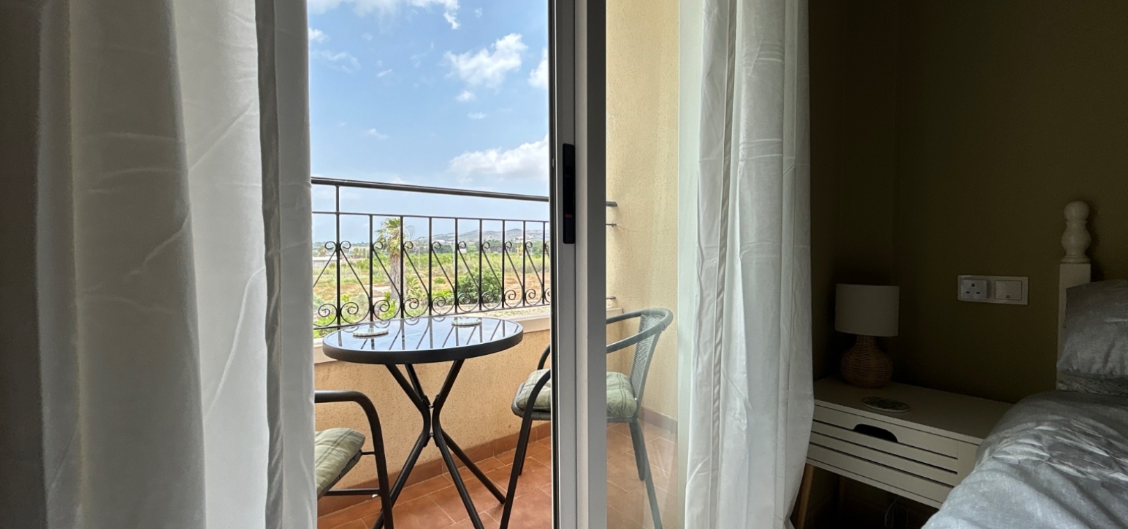 The master bedroom features built-in wardrobes, an en-suite bathroom, and its own small balcony. The second bedroom is a simple and comfortable guest room, and there’s an additional bathroom for guests.