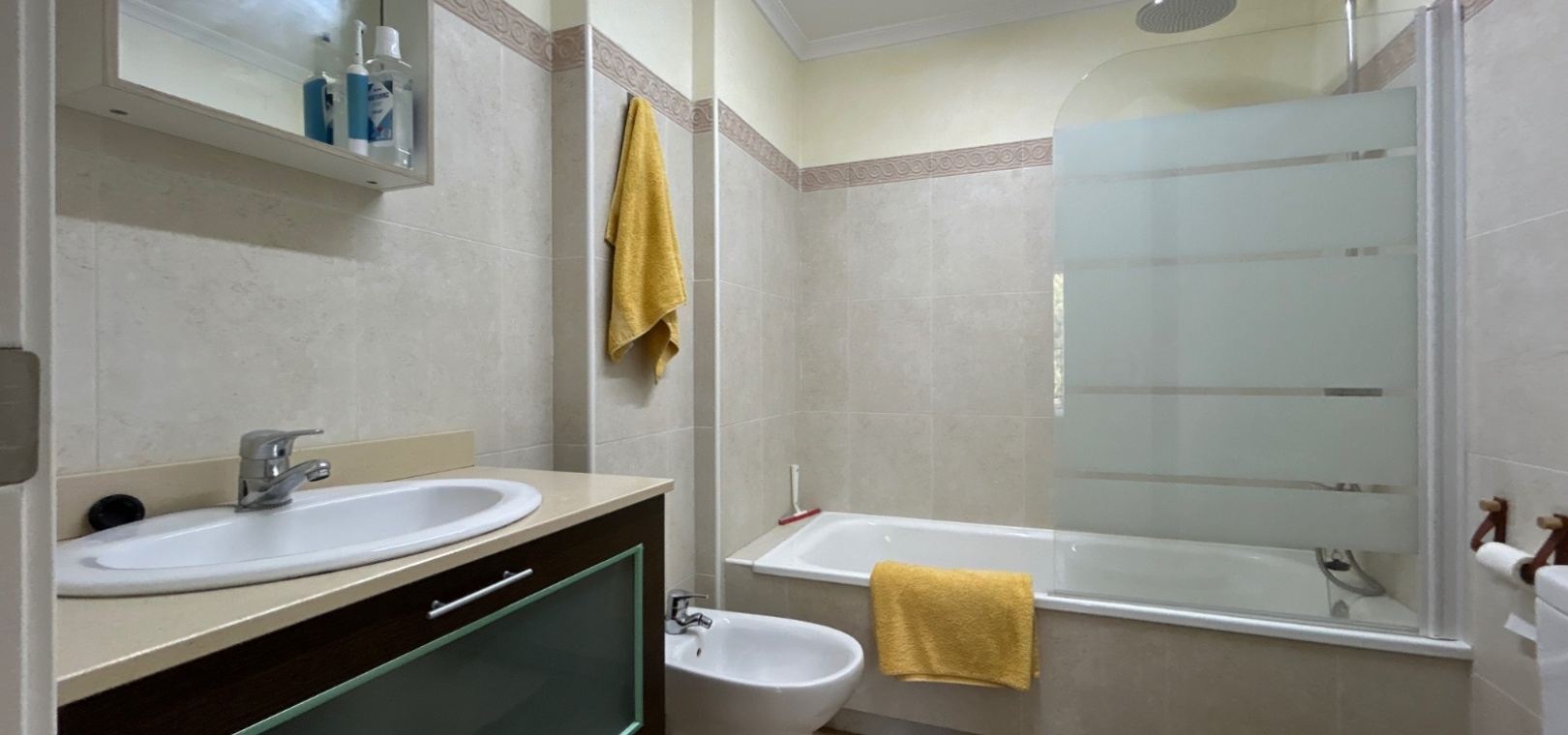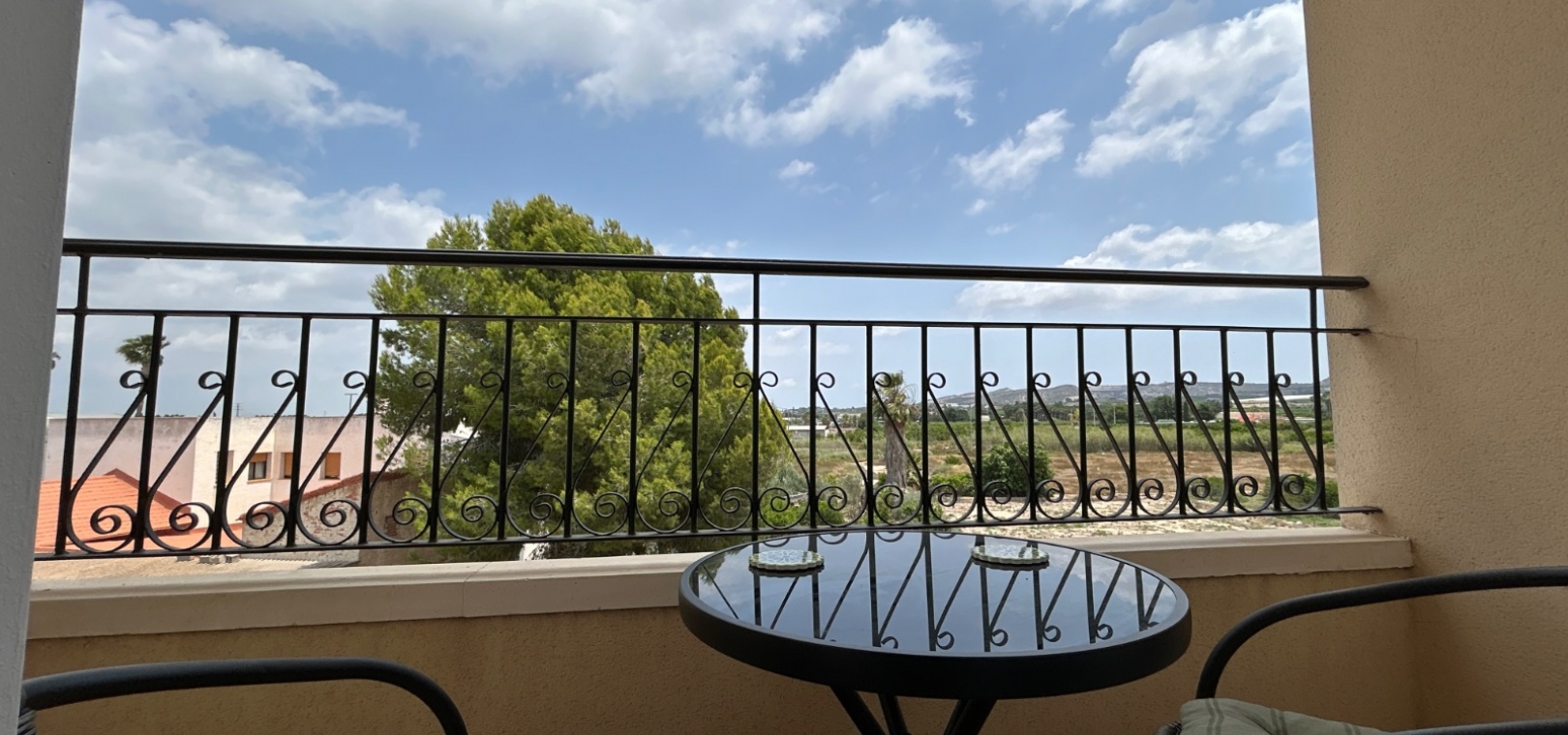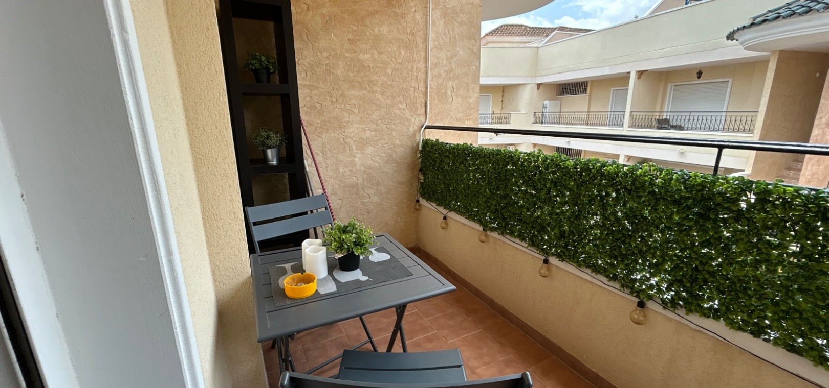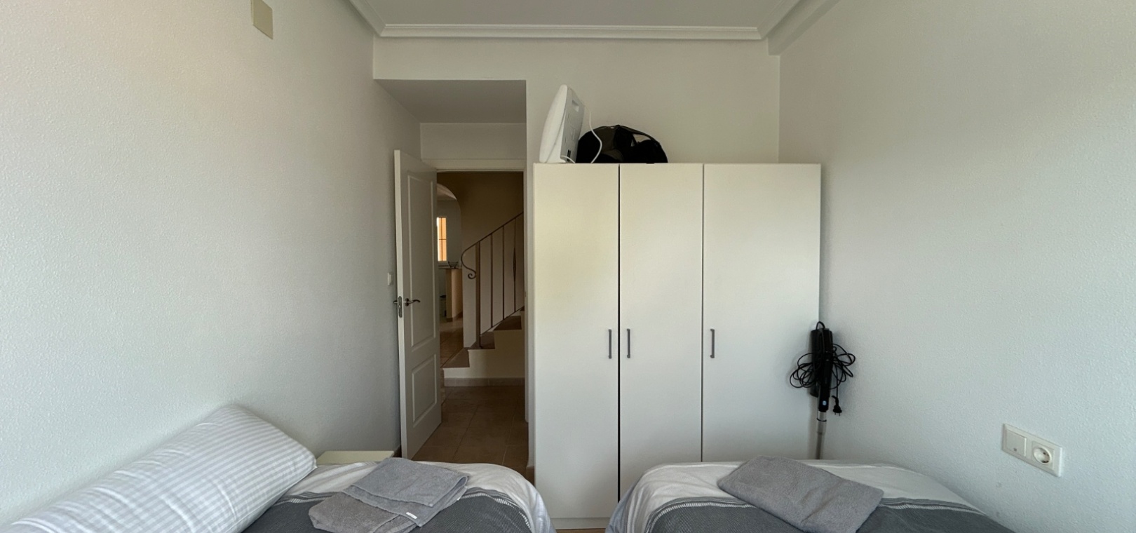 The master bedroom features built-in wardrobes, an en-suite bathroom, and its own small balcony. The second bedroom is a simple and comfortable guest room, and there’s an additional bathroom for guests.
