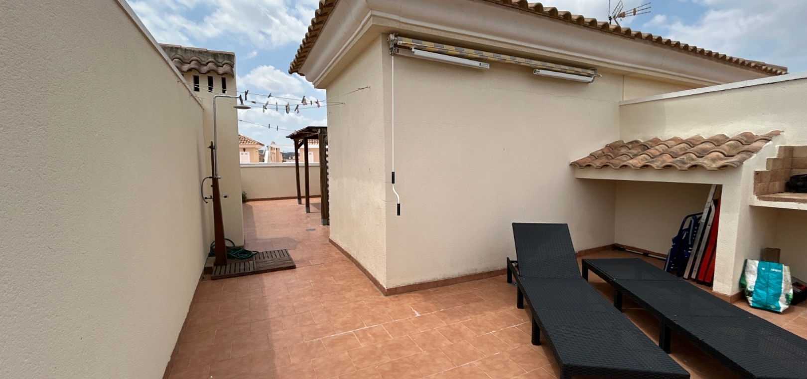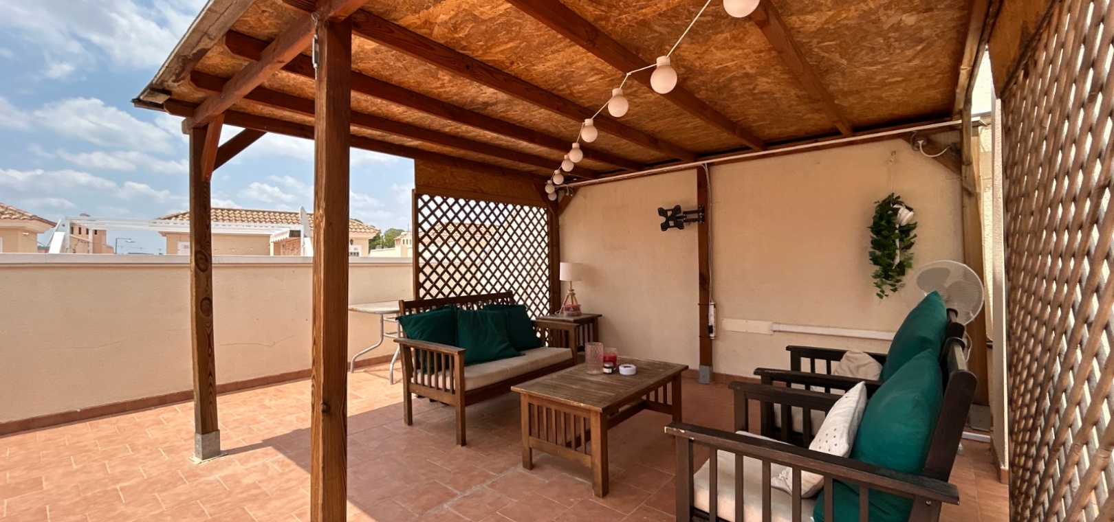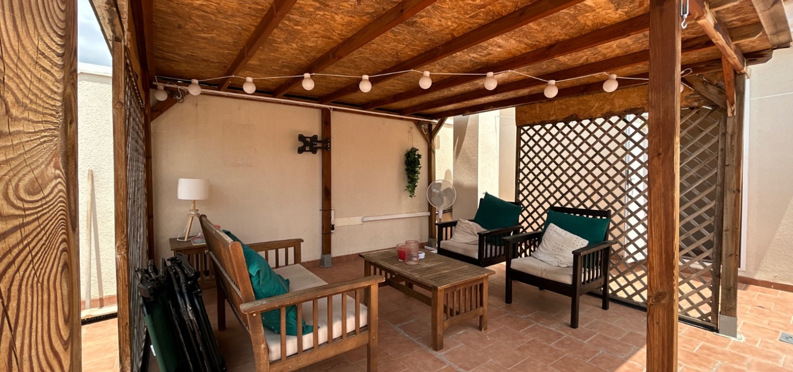 Upstairs, the real highlight of this property awaits: a large private solarium. One side features a built-in, covered lounge and dining area—designed with a modern wooden structure and closed roof, perfect for relaxing under soft lighting or watching TV outdoors. On the other side, an open-air lounge space invites you to soak up the sun or entertain under the stars.