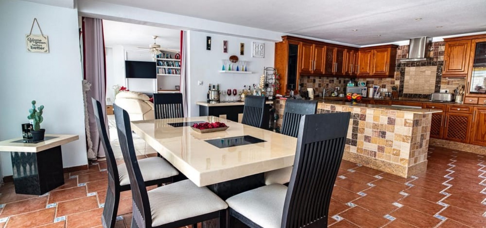 The villa has a built surface area of 245 m2 which distributes over a large living room with open fireplace with direct access to the garden