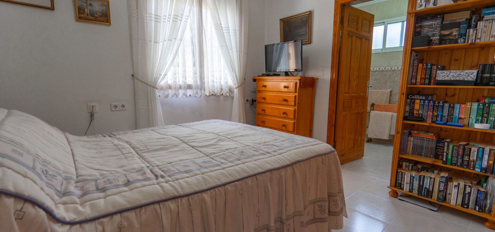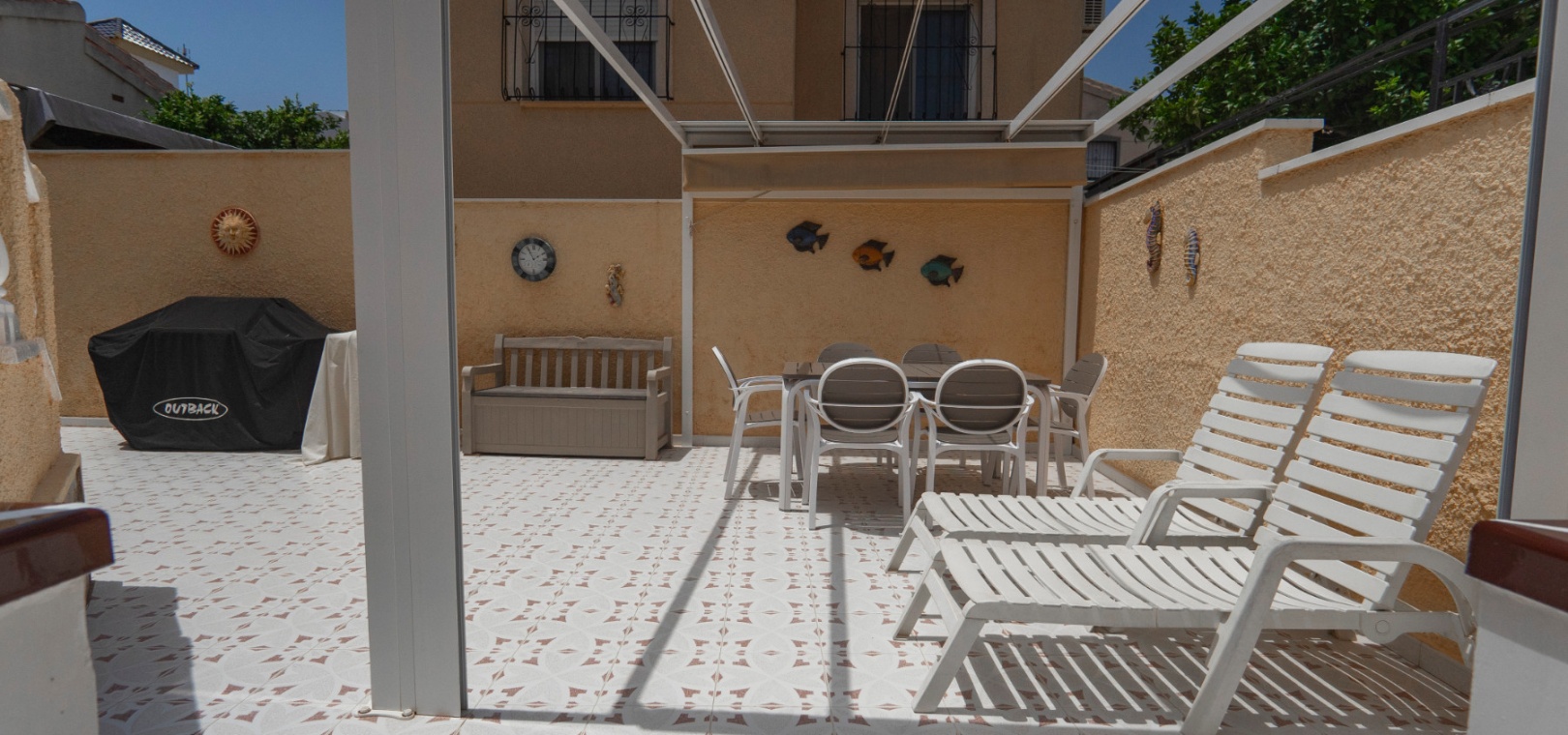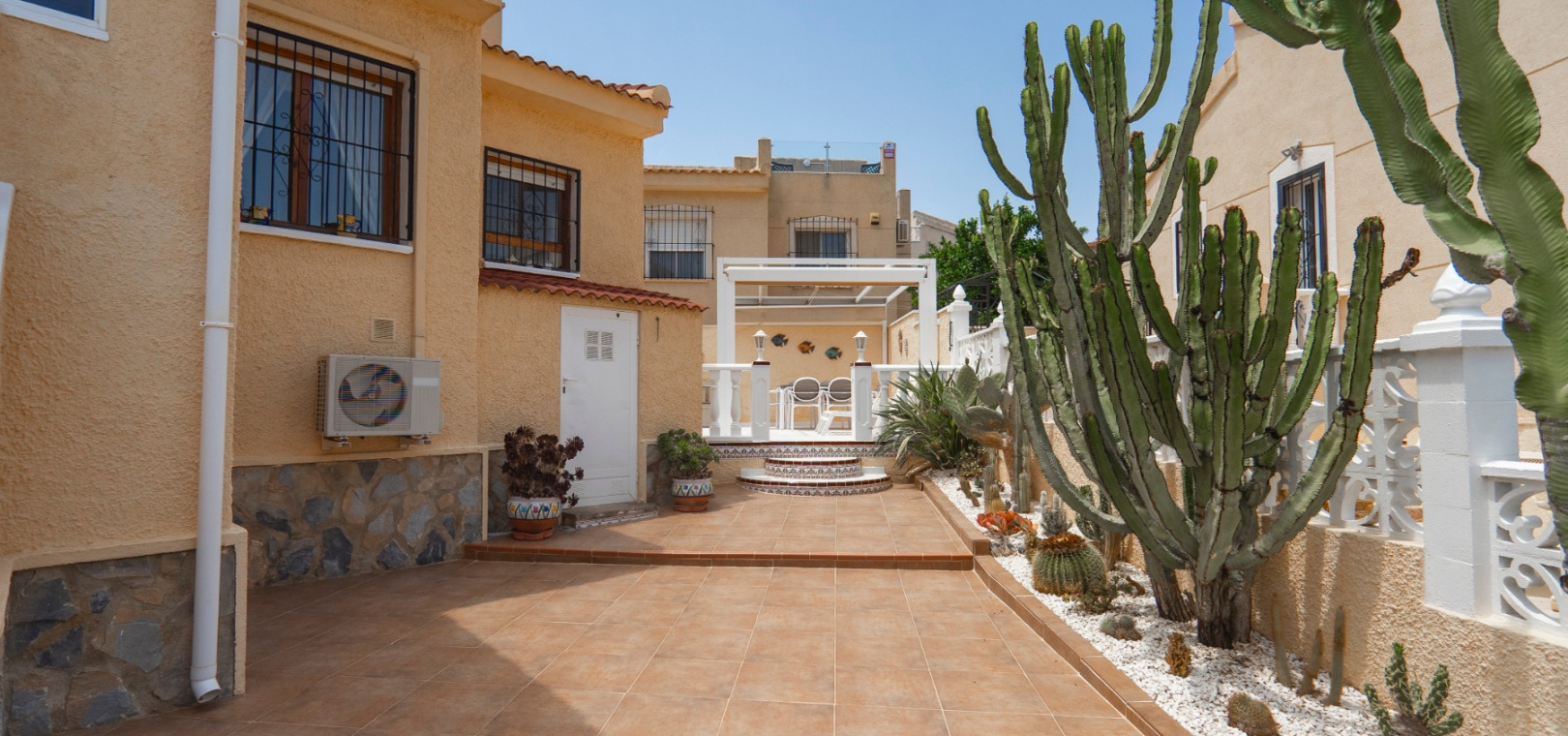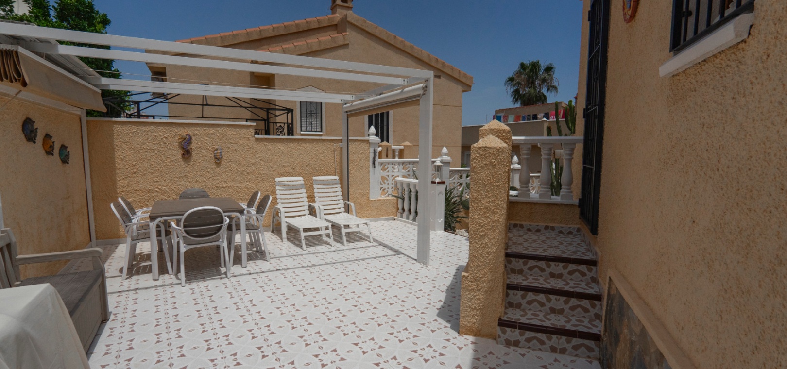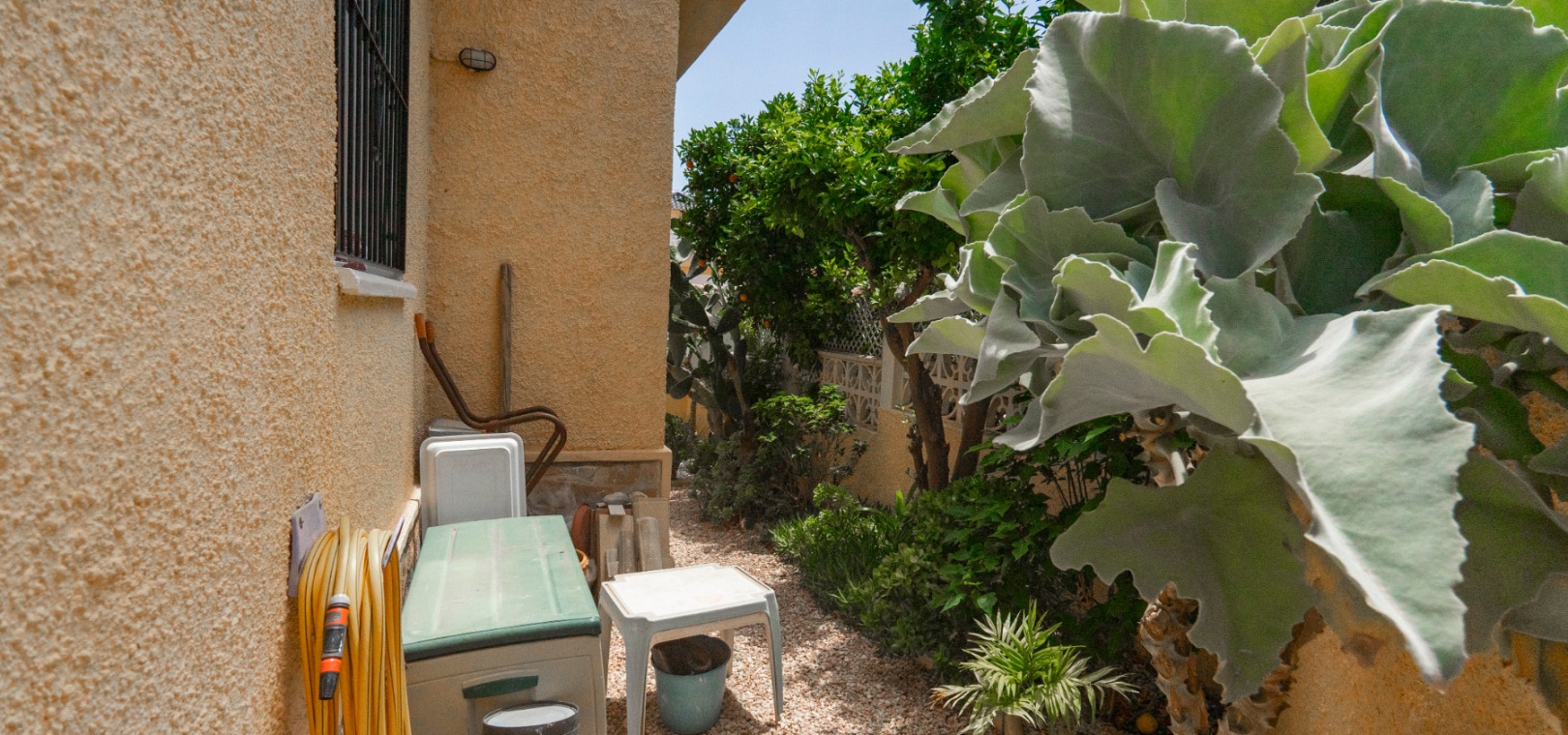 Here we have a beautiful detached Villa boasting 2 bright double bedrooms and 2 family bathrooms one of which is en-suite to the master bedroom. There is a good size bright lounge/ diner plus a glazed in terrace, and a galley kitchen with its own door to access the garden area. There is a spacious garden are with plenty of room to relax or entertain freiends and family. There are two storage areas and a covered driveway to keep your car cool and out of the Sun. You will also find a small roof solarium. The large communual pool is a very short walk away and amenities the golf course and water park are also a short distance away. The blue flag beaches of Guardamar are only a 15 minute drive away. This type of property does not come on the market very often so an early viewing is highly reccomended.