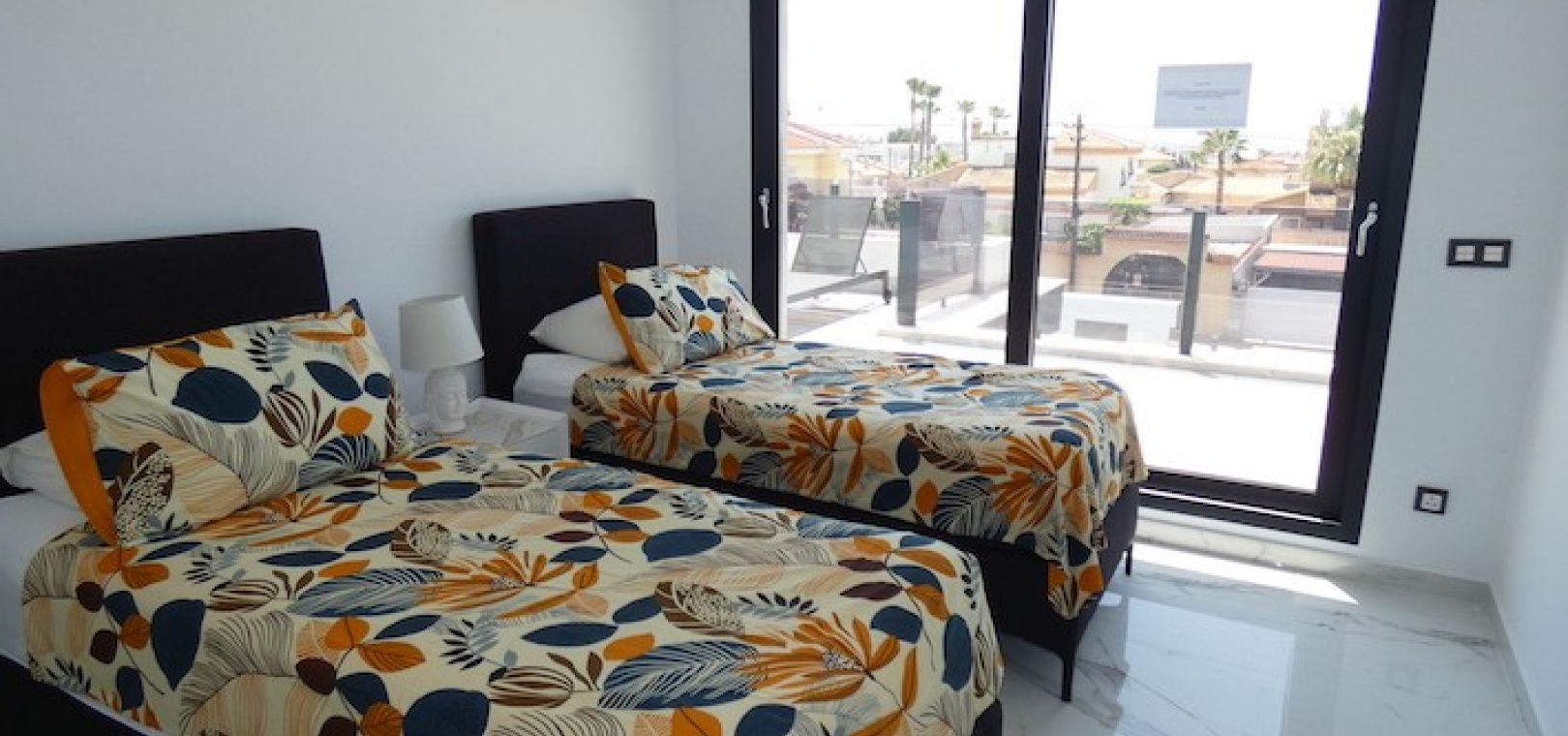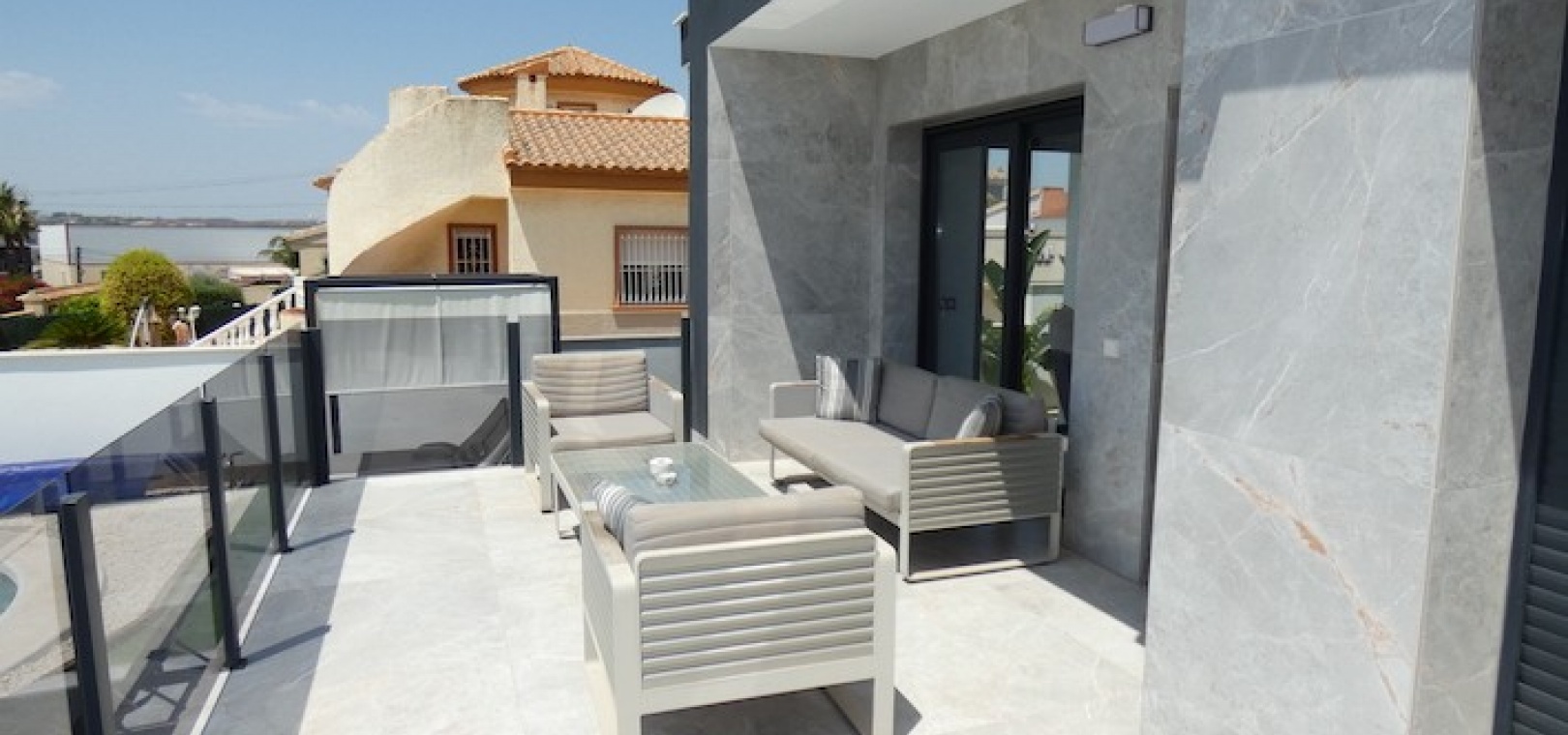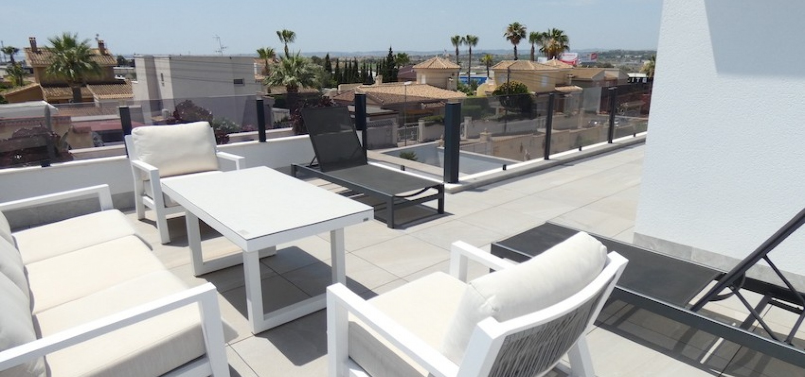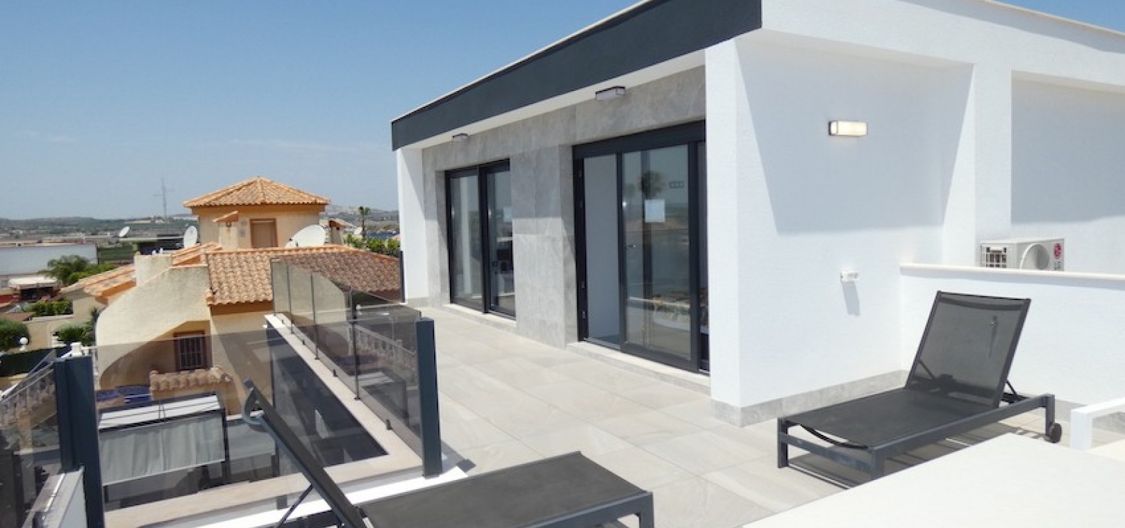 Sitting on a large plot of 510m2, the villa, which is spread over two floors has a good sized front terrace which leads into the property. On the ground floor is the living area, american style open plan kitchen and dining area, two bedrooms and two bathrooms (one of which is en-suite. Upstairs, there are a further two bedrooms and a family bathroom. Both bedrooms have access to another large terrace, which overlooks the swimming pool. There is air-conditioning in all the rooms and has been finished to an extremely high standard throughout.