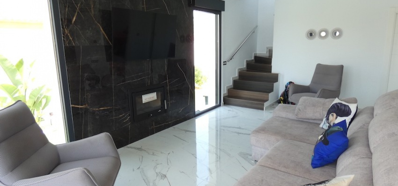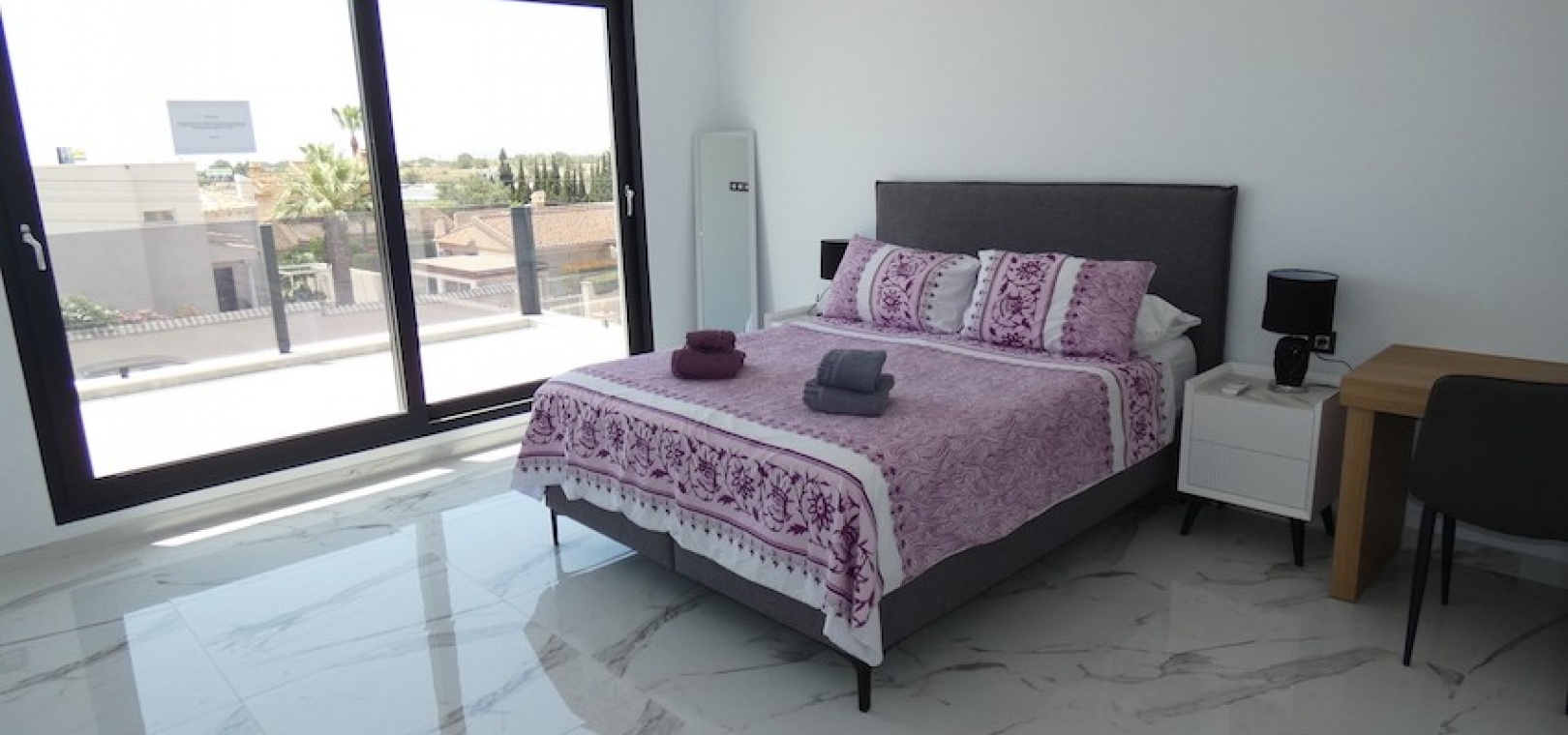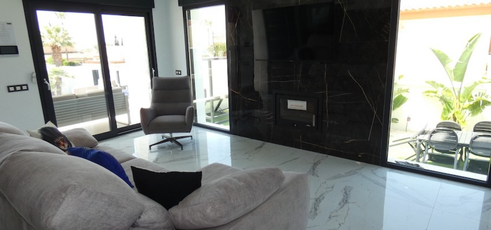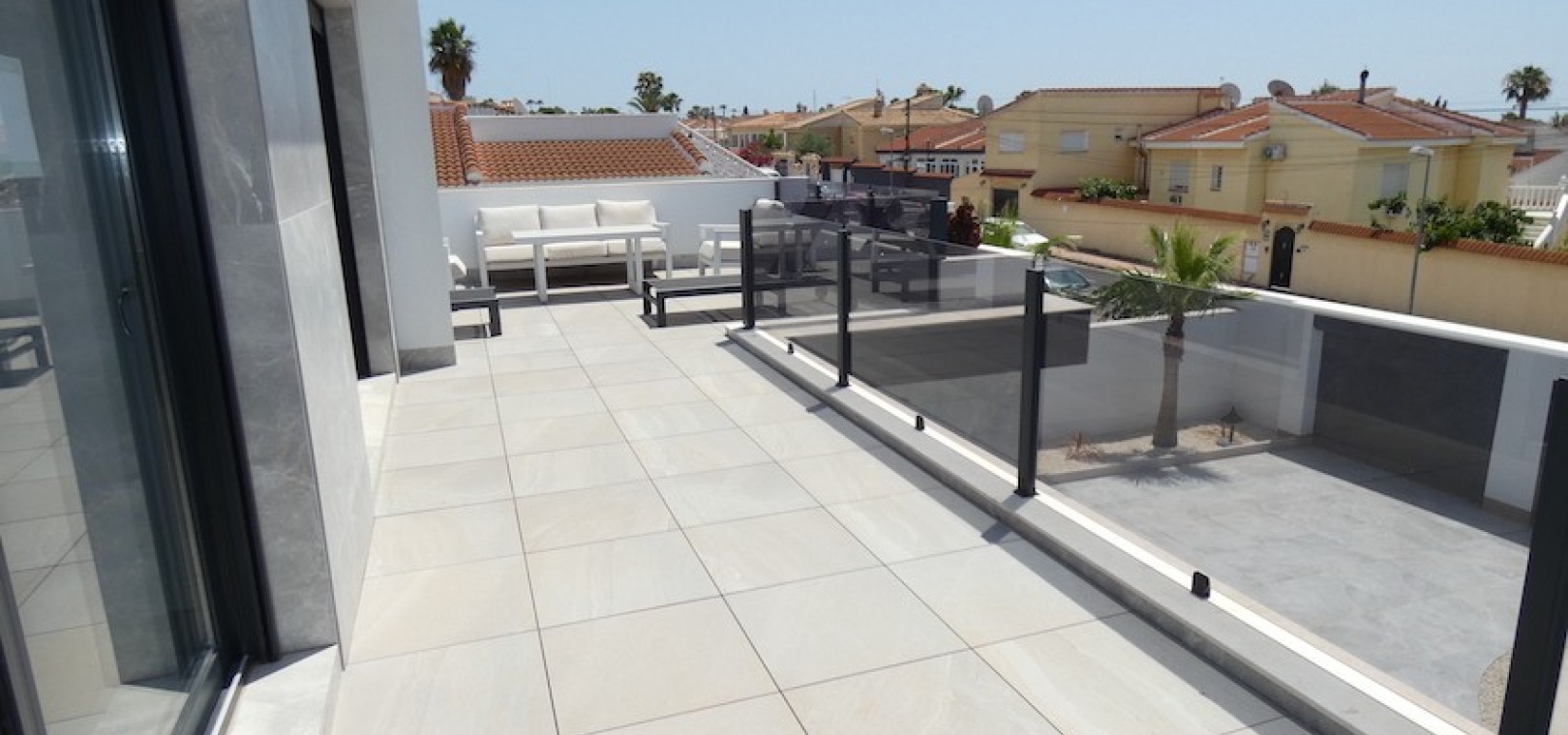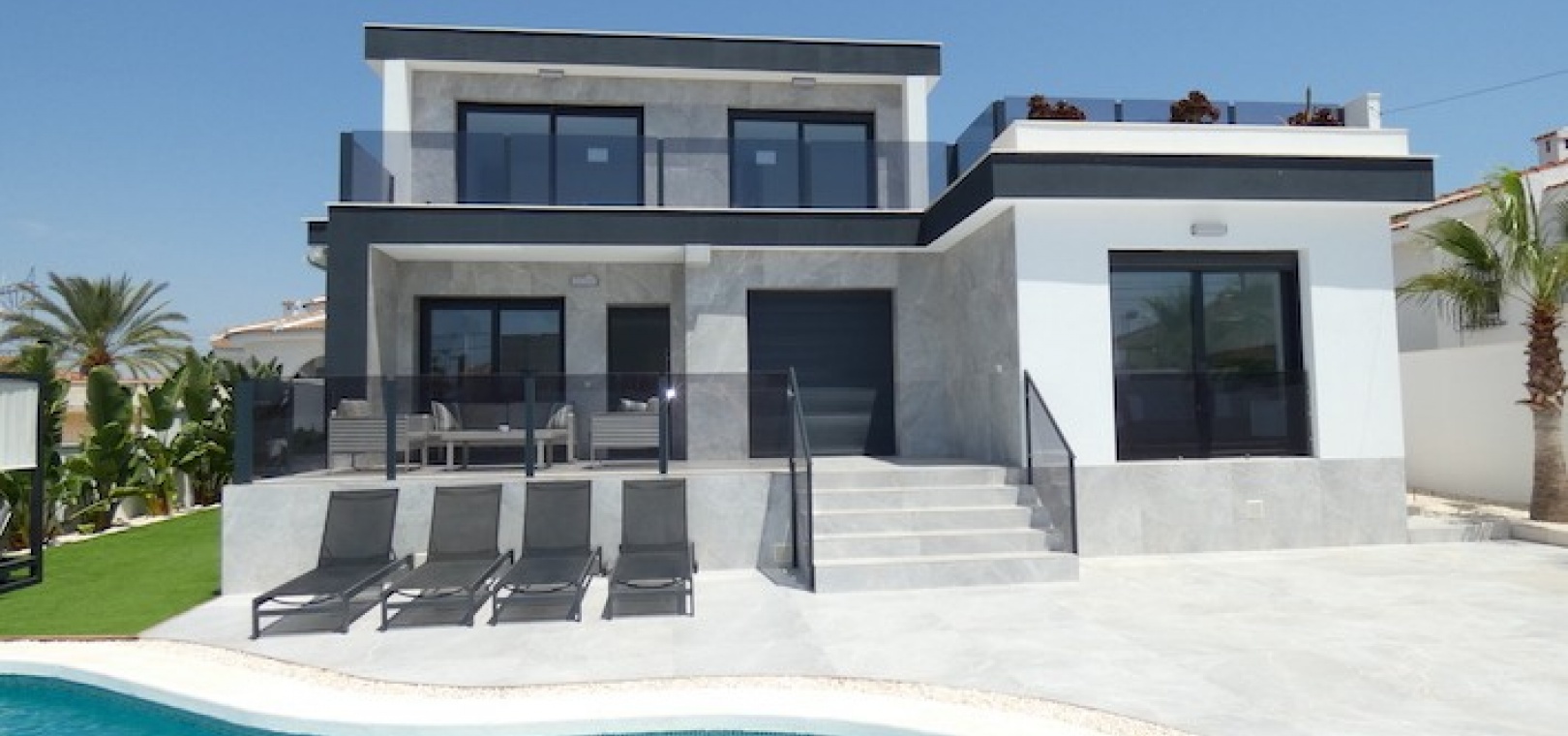 Sitting on a large plot of 510m2, the villa, which is spread over two floors has a good sized front terrace which leads into the property. On the ground floor is the living area, american style open plan kitchen and dining area, two bedrooms and two bathrooms (one of which is en-suite. Upstairs, there are a further two bedrooms and a family bathroom. Both bedrooms have access to another large terrace, which overlooks the swimming pool. There is air-conditioning in all the rooms and has been finished to an extremely high standard throughout.