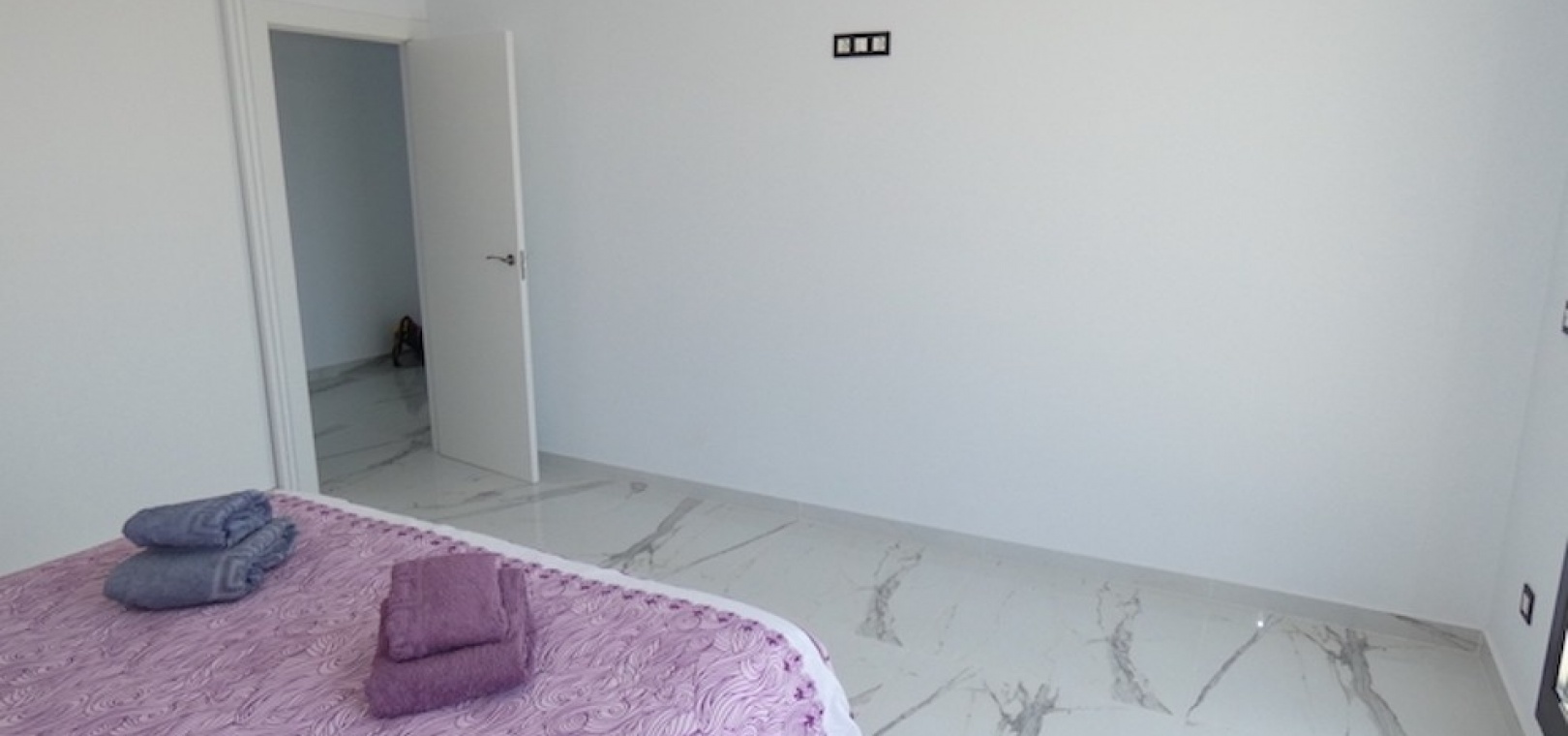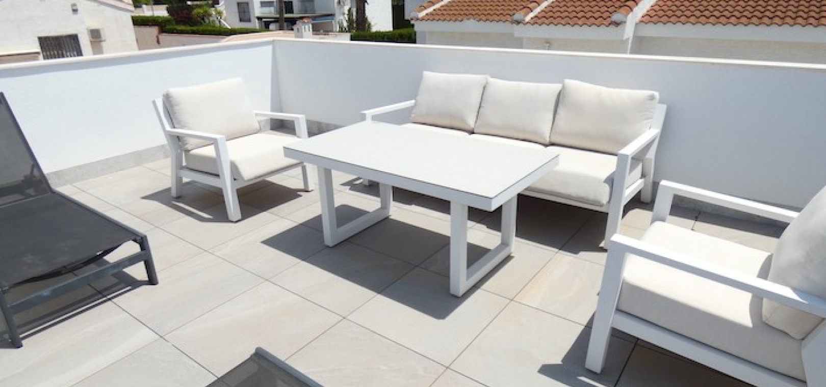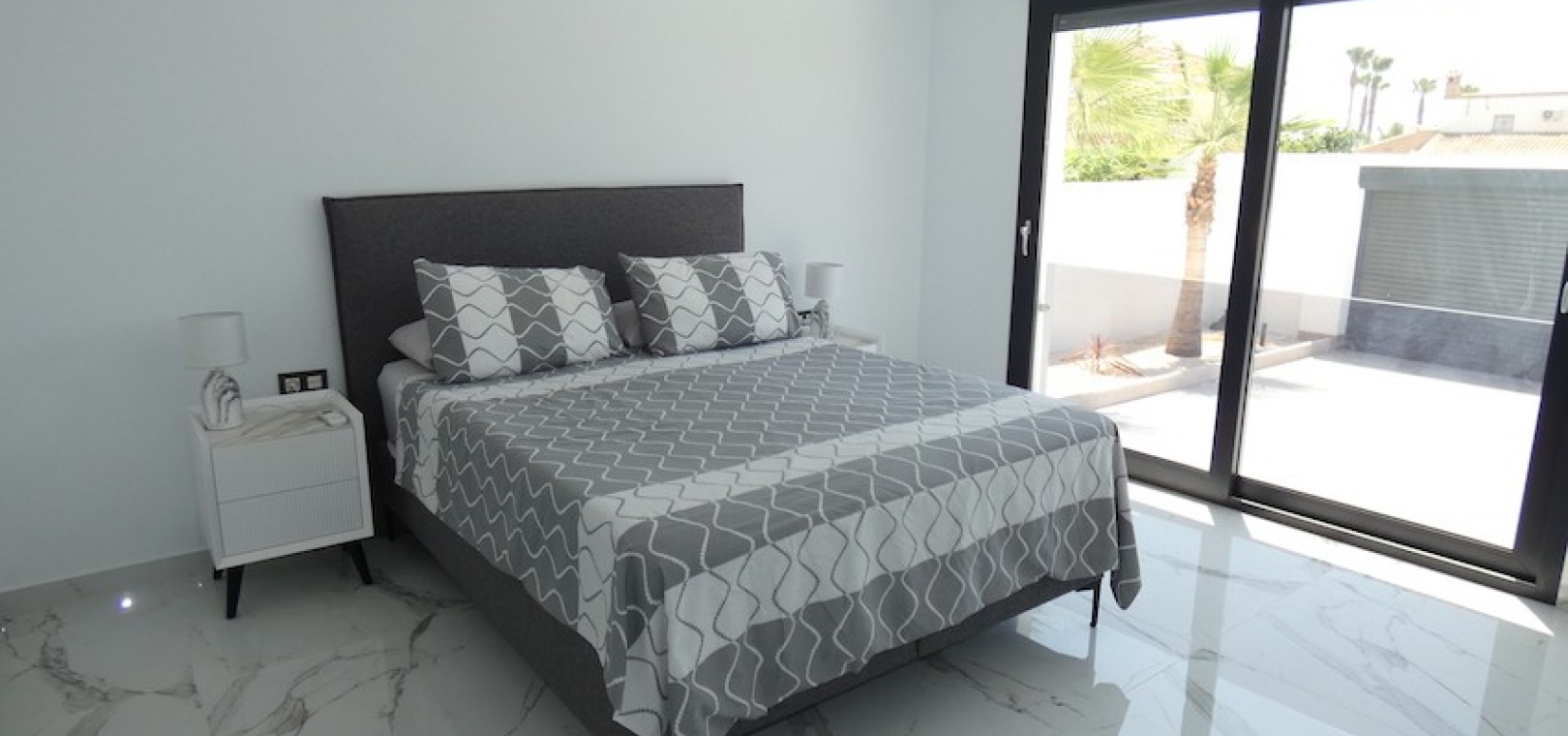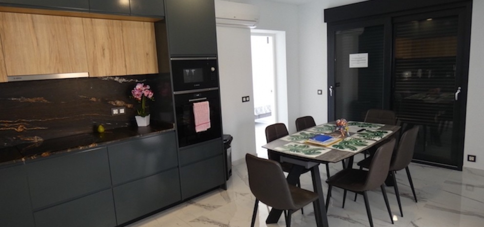 Sitting on a large plot of 510m2, the villa, which is spread over two floors has a good sized front terrace which leads into the property. On the ground floor is the living area, american style open plan kitchen and dining area, two bedrooms and two bathrooms (one of which is en-suite. Upstairs, there are a further two bedrooms and a family bathroom. Both bedrooms have access to another large terrace, which overlooks the swimming pool. There is air-conditioning in all the rooms and has been finished to an extremely high standard throughout.