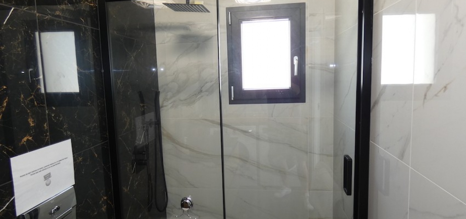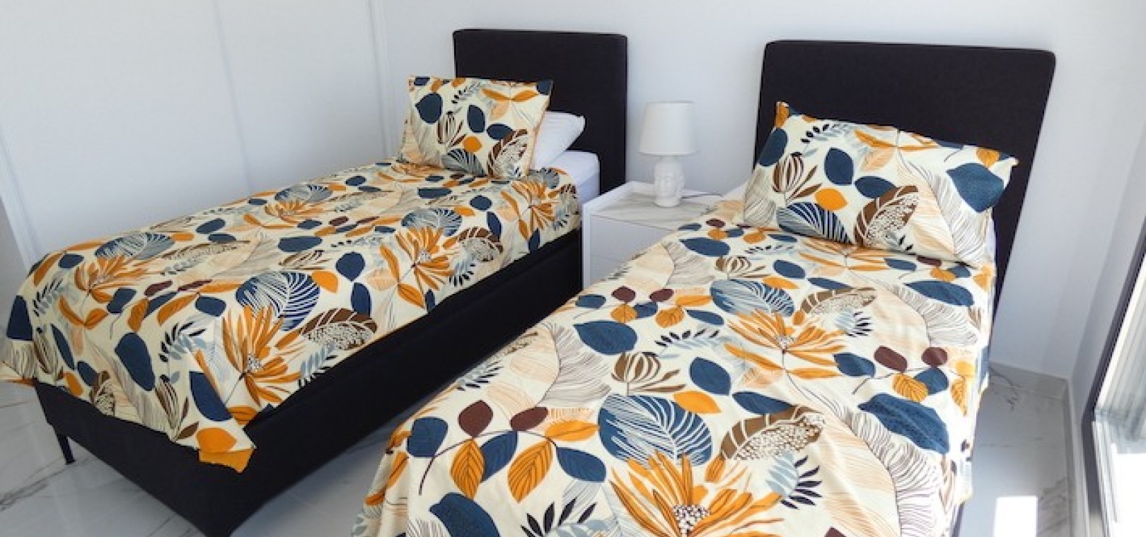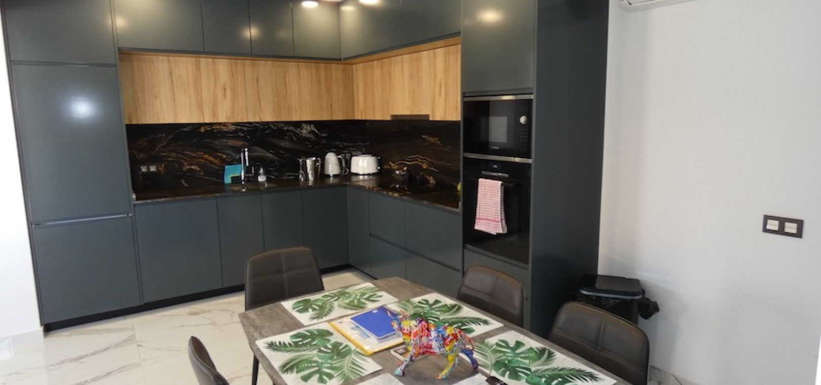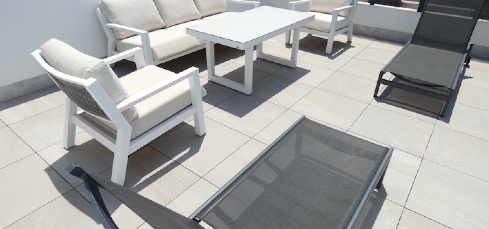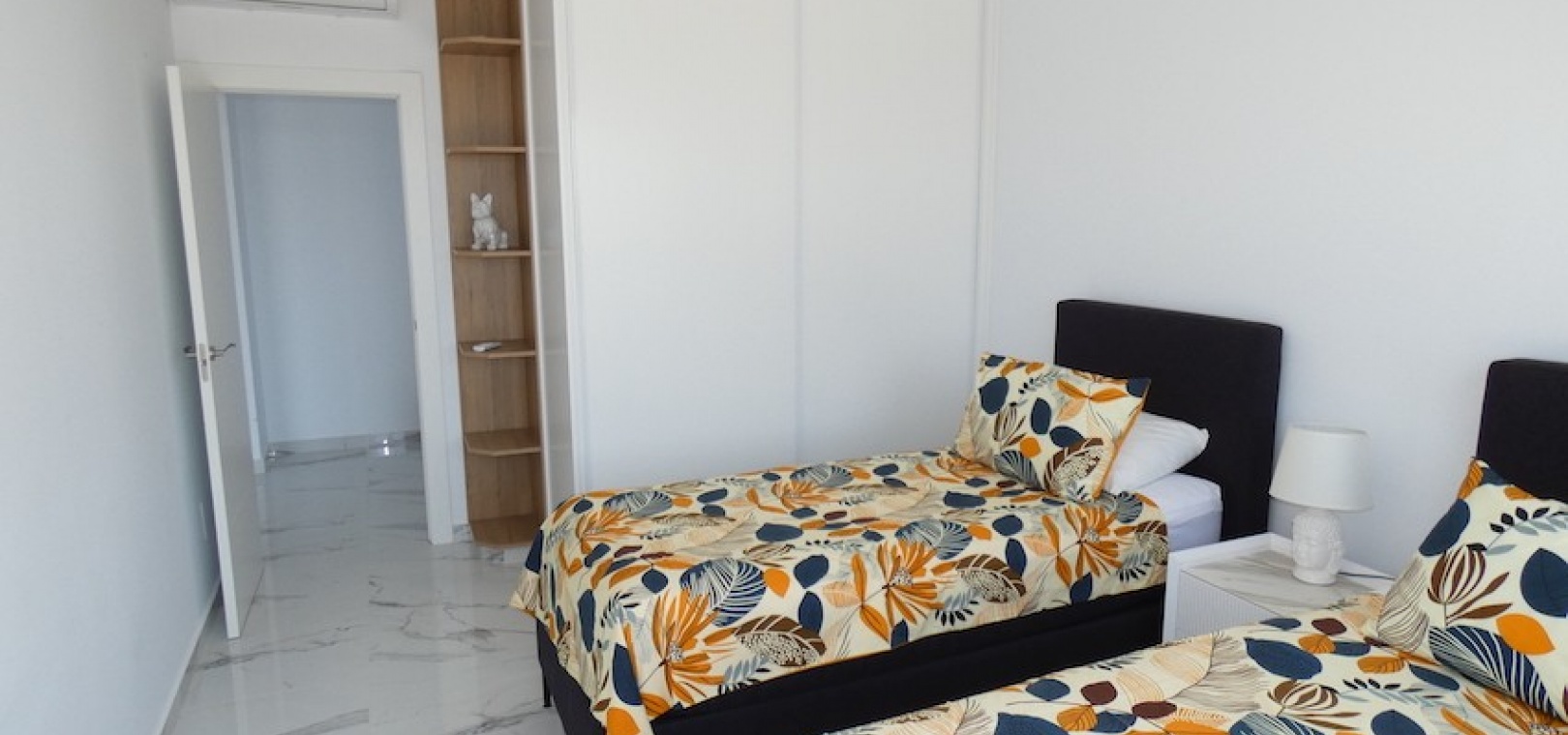 Sitting on a large plot of 510m2, the villa, which is spread over two floors has a good sized front terrace which leads into the property. On the ground floor is the living area, american style open plan kitchen and dining area, two bedrooms and two bathrooms (one of which is en-suite. Upstairs, there are a further two bedrooms and a family bathroom. Both bedrooms have access to another large terrace, which overlooks the swimming pool. There is air-conditioning in all the rooms and has been finished to an extremely high standard throughout.